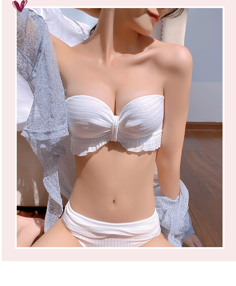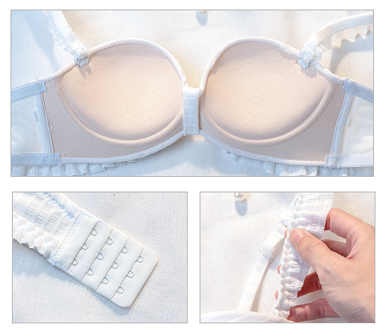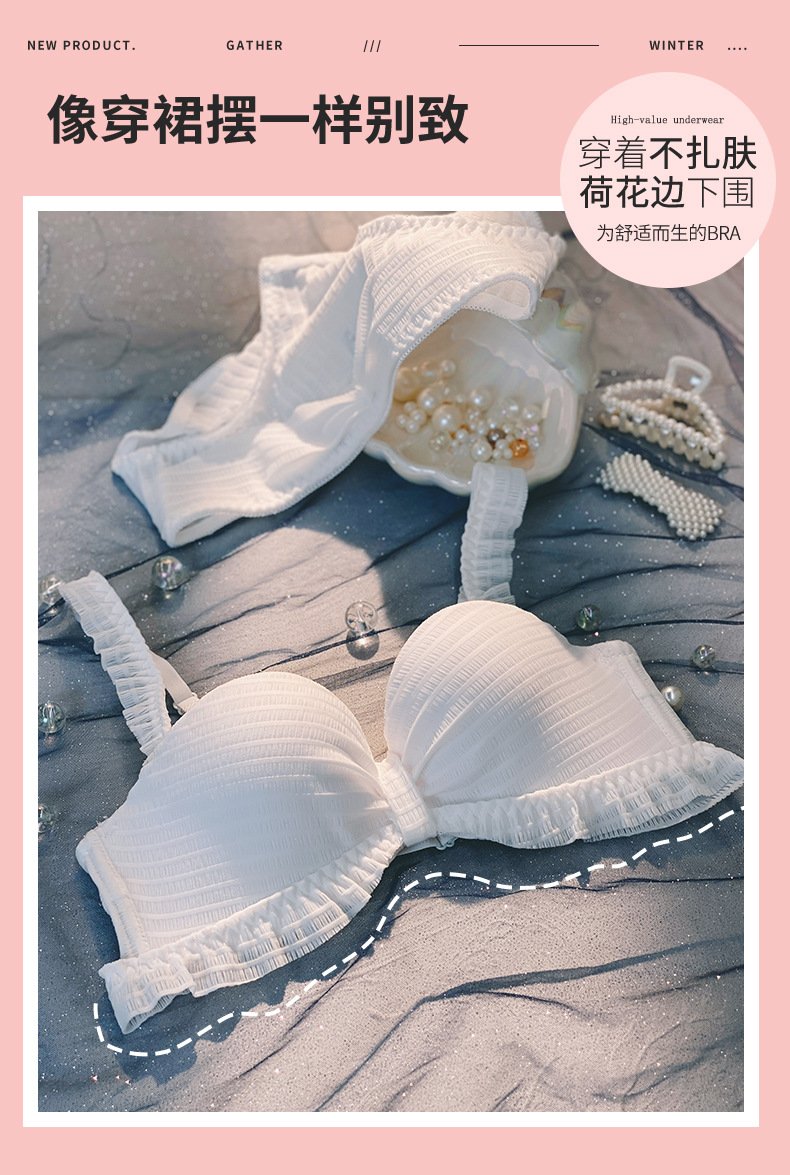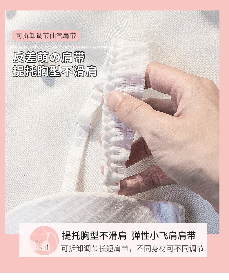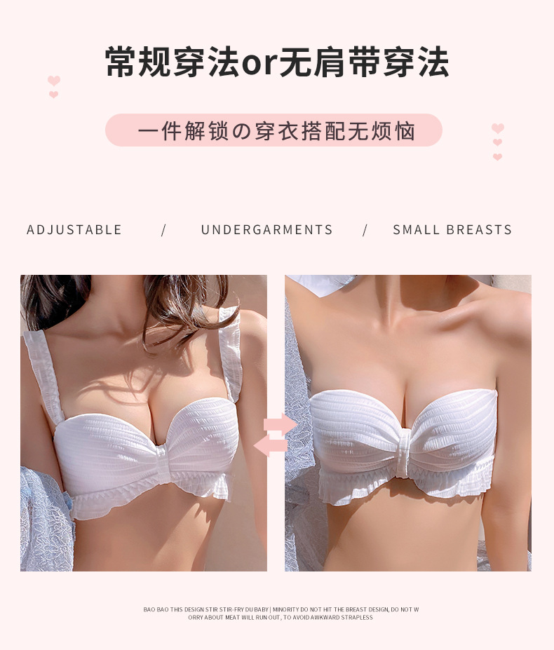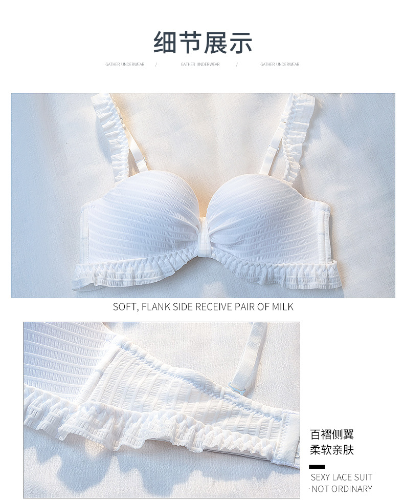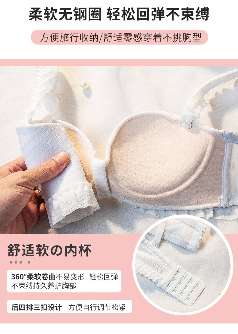 白色内衣少女小胸聚拢平胸显大无钢圈褶皱无肩带防滑文胸罩套装厚