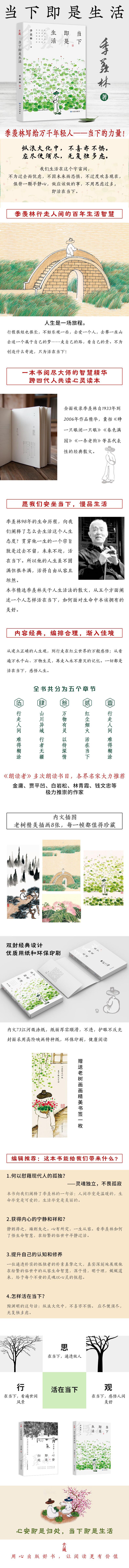 1.季羡林行走人间的百年生活智慧 给被生活折磨的年轻人,找到当下生活的力量 回归生活的本来面目,从日常生活中找生命的力量,让自己活得更精彩。与生活和解,走出自我设定的困局。 2.内容经典,编排合理 从建立正确的人生观,到行走在红尘世界的万般感悟;从看遍万水千山、万物生灵,再走入永不磨灭的记忆。一切都是活在当下,感悟人生。(一、树立正确的人生观;二、活在红尘烟火中;三、看万物,有灵有情;四、山川大地皆美,要去看看;五、时光带不走永恒的记忆。) 3.一本书阅尽大师的智慧精华 全面收录季羡林自1933年到2006年,囊括有作者写作生涯《睁一只眼闭一只眼》《春色满园》《一条老狗》等具代表性的经典散文。 4.金庸、贾平凹、白岩松、林青霞、钱文忠等极力推崇的作家。 给我优选启发的作家是季羡林。让我觉得写文章不一定要很多的成语或者很艰难的字,只需把感情、自己最真的性情写出来。 ——林青霞 世纪老人在陆续地离去,他们留下的爱国心和高深的学问却一直在我们心中不老。而这些世纪老人所独具的人格魅力是不是也该作为一种传统被我们向后延续。 ——白岩松 恩师优选的魅力,就是仿佛无法用堂皇的语言来言说他的魅力。用在恩师身上的形容词,最合适的大概还是纯粹和平淡。 ——钱文忠 上世纪末,金庸访问北京大学,当被问及喜欢什么书时,他回答:“《牛棚杂忆》。”又问:“你最崇敬的北大教授是谁?”他毫不犹豫地答道:“季羡林。” ——金庸 5.内文插图:老树精美插画8张,每一帧都值得珍藏 6.双封经典设计,封面设计达人安宁亲自操刀 7.赠送老树画画精美书签一枚 8.优质用纸和环保印刷 内文73江河微涂纸,纸面厚实顺滑,不透,护眼不反光 封面采用高阶映画特种纸,环保印刷,健康阅读