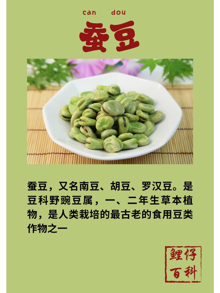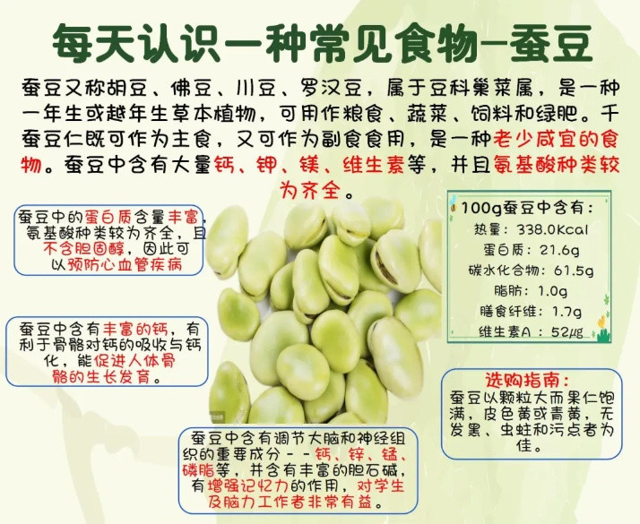 兰花豆又名蚕豆 ✅蚕豆入脾经、胃经,具有健脾和胃的功效 适量食用能够改善食欲,增强脾胃功能 缓解食积腹胀、消化不良、呃逆等症状 ✅蚕豆还可以起到利水消肿的作用 对于小便不利、水肿胀满等病症有一定的调理效果 ✅蚕豆皮中的粗纤维有降低胆固醇、促进肠蠕动的作用 ✅蚕豆中的蛋白质含量丰富,且不含胆固醇 可以预防心血管疾病
