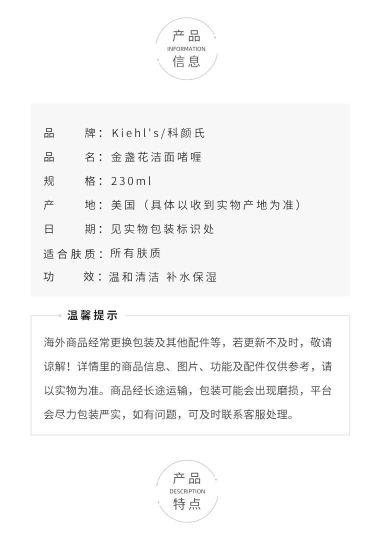 KIEHL'S科颜氏金盏花泡沫洁面啫喱舒缓肌肤清洁补水230ml