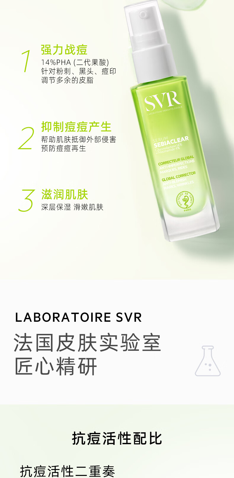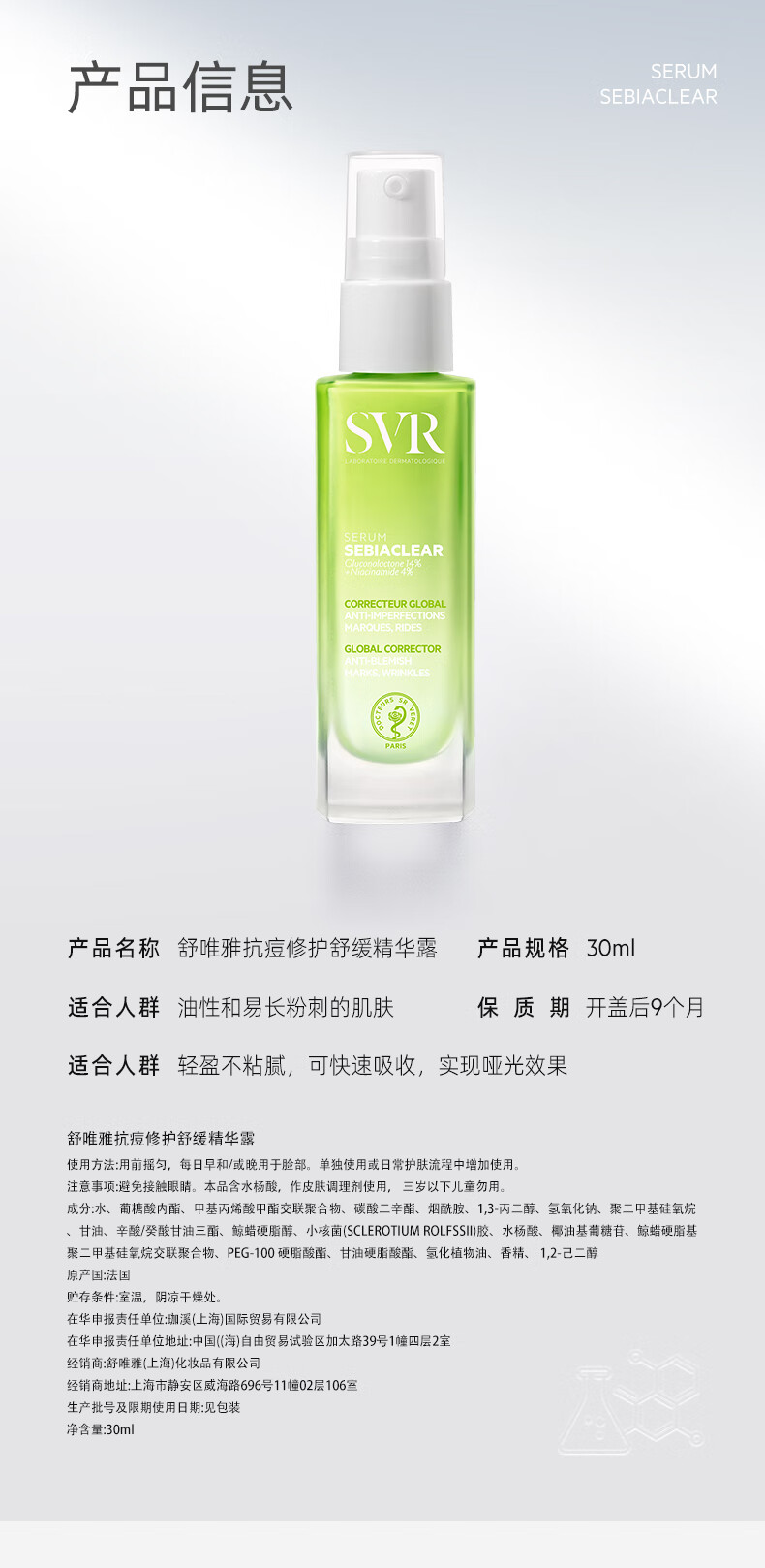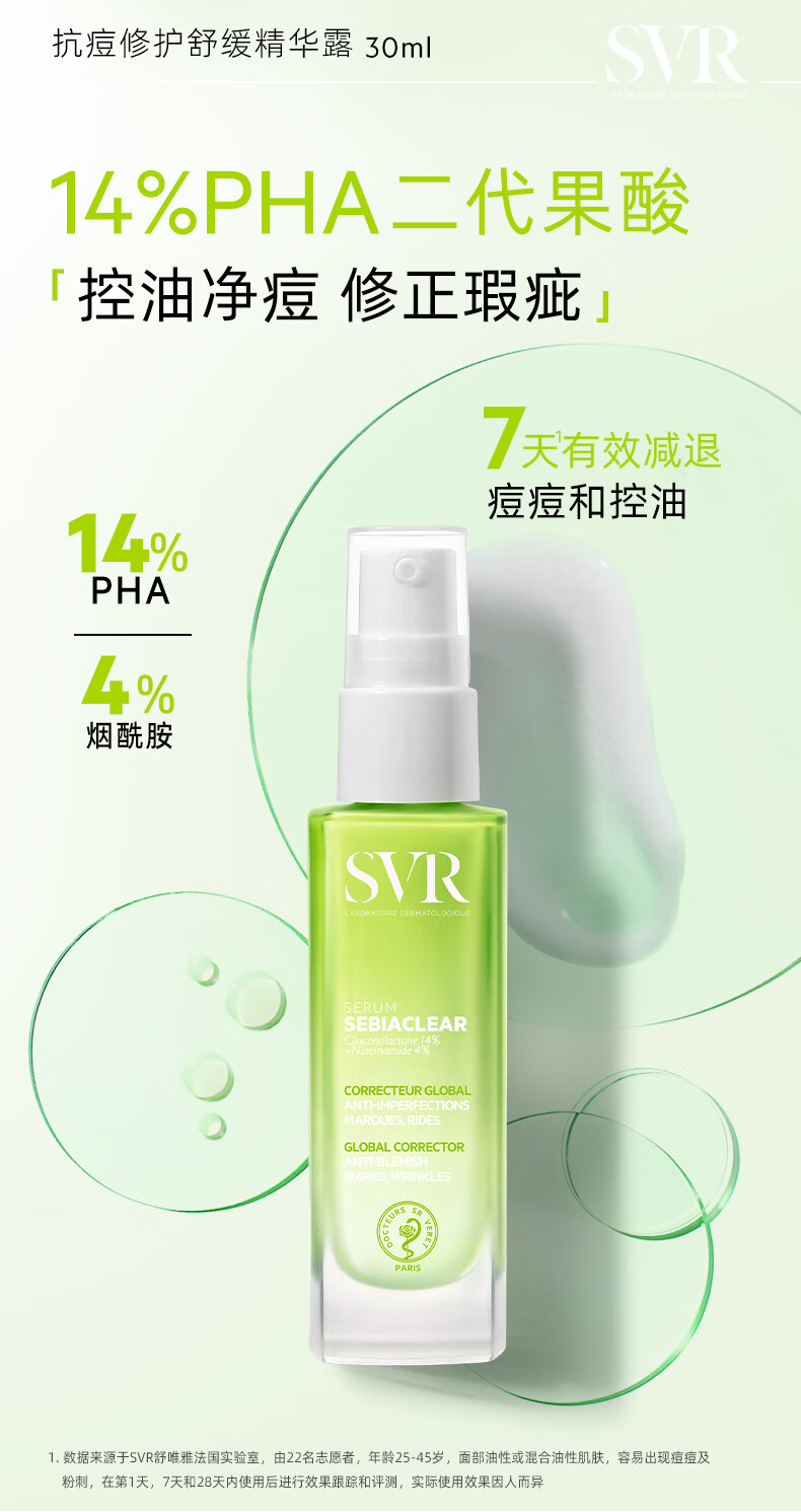 舒唯雅(SVR)修护抗痘精华露控油锁水保湿修护舒缓祛痘水杨酸30ml