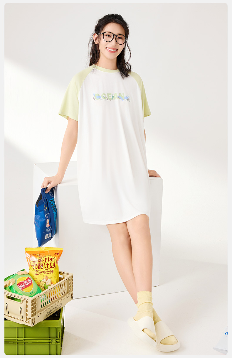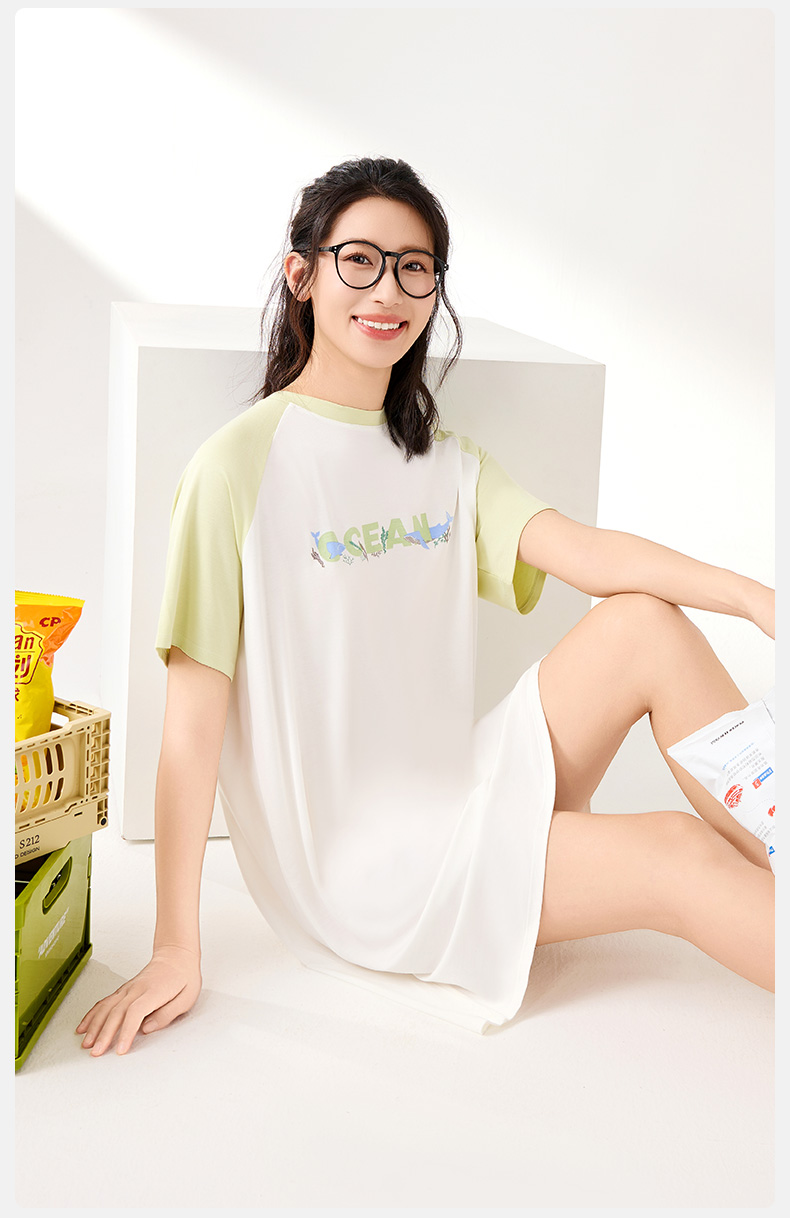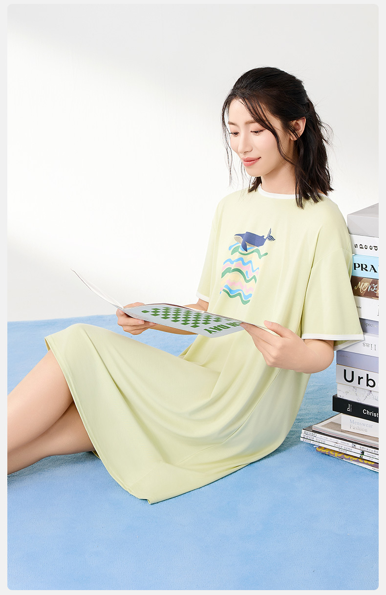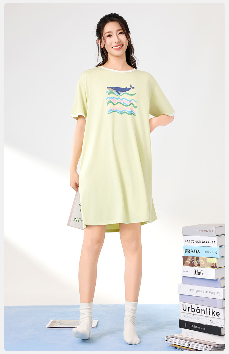 爱帝夏季睡裙女士清爽海洋印花冰丝凉感连衣裙
