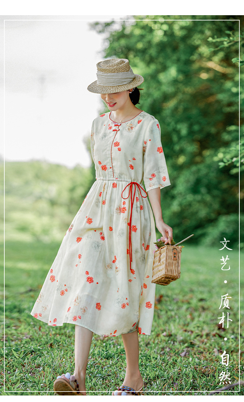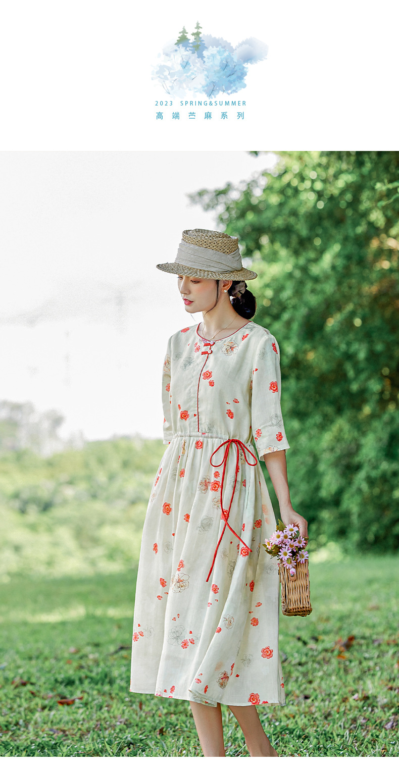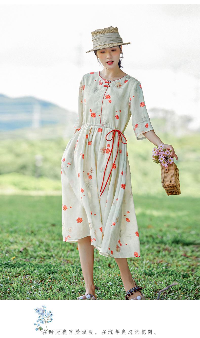 夏季文艺苎麻印花连衣裙,圆领系带中国风花朵盘扣中袖大摆长裙YM-S407