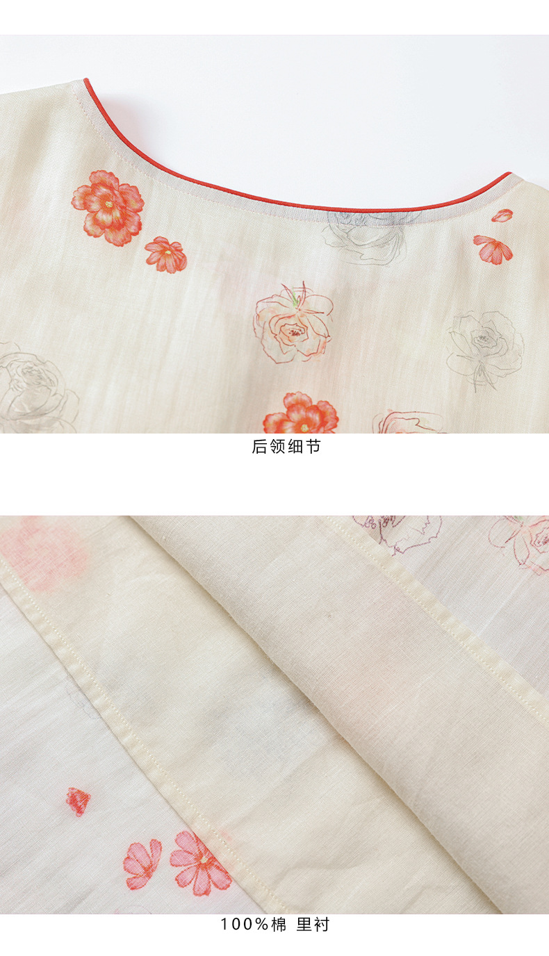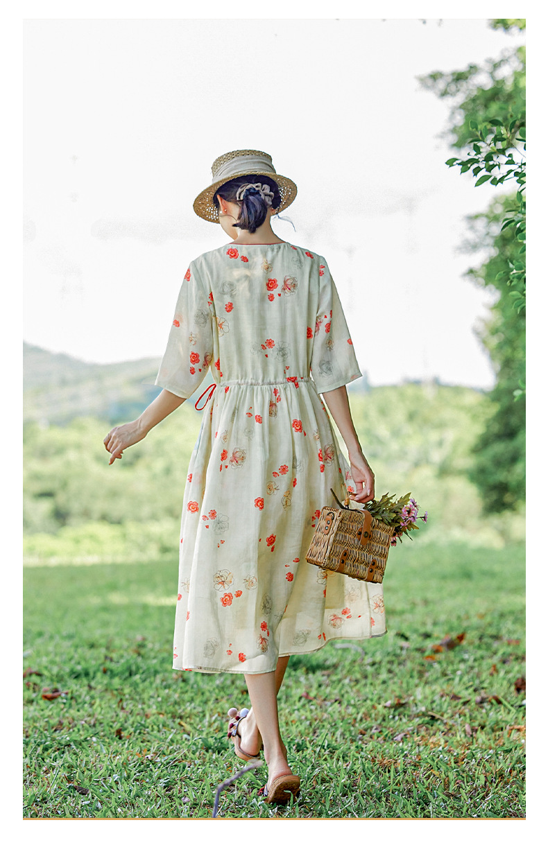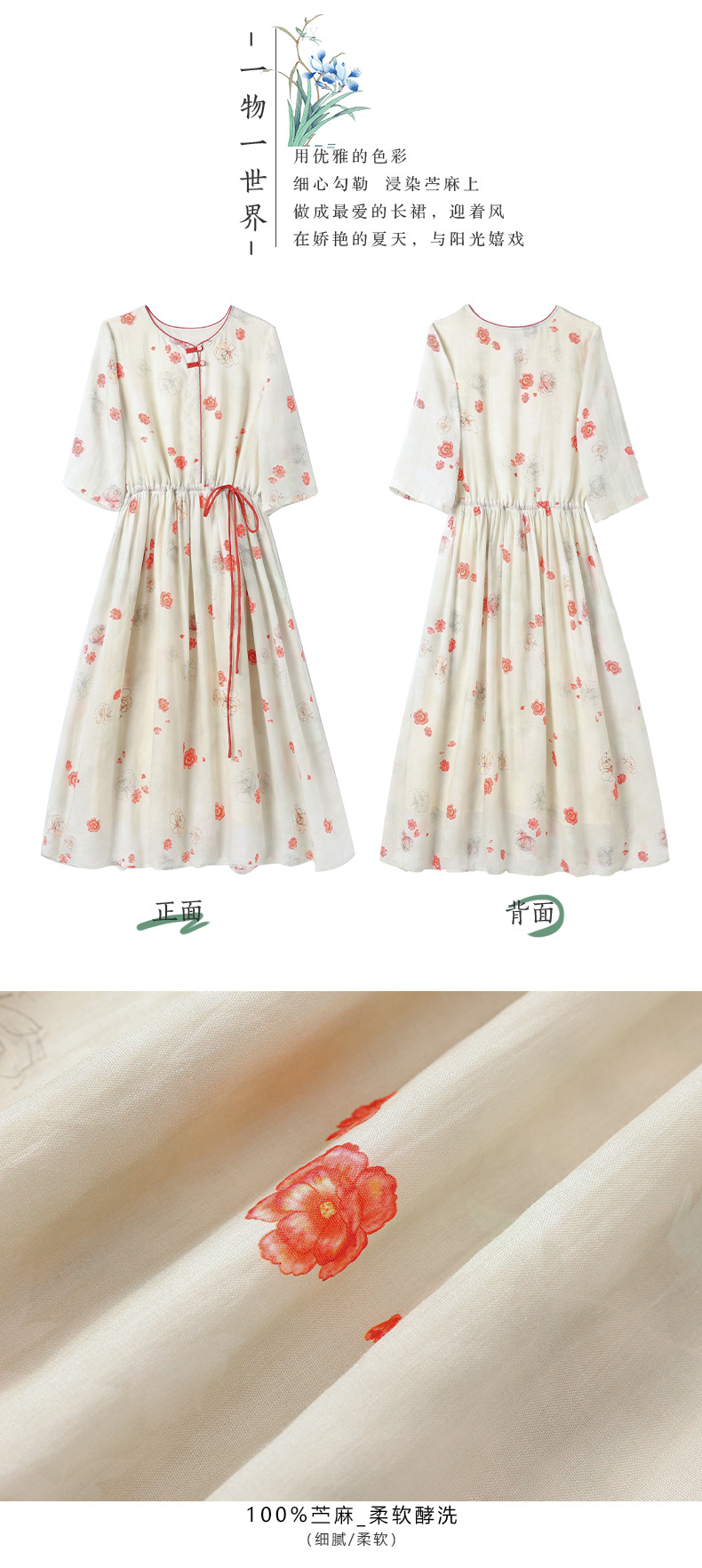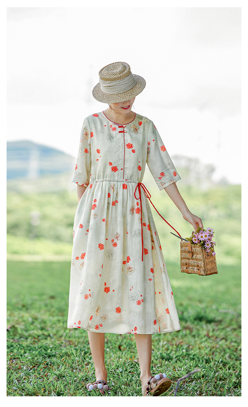 夏季文艺苎麻印花连衣裙,圆领系带中国风花朵盘扣中袖大摆长裙YM-S407