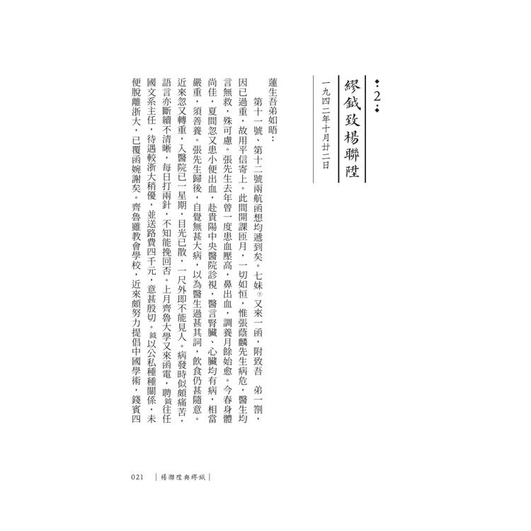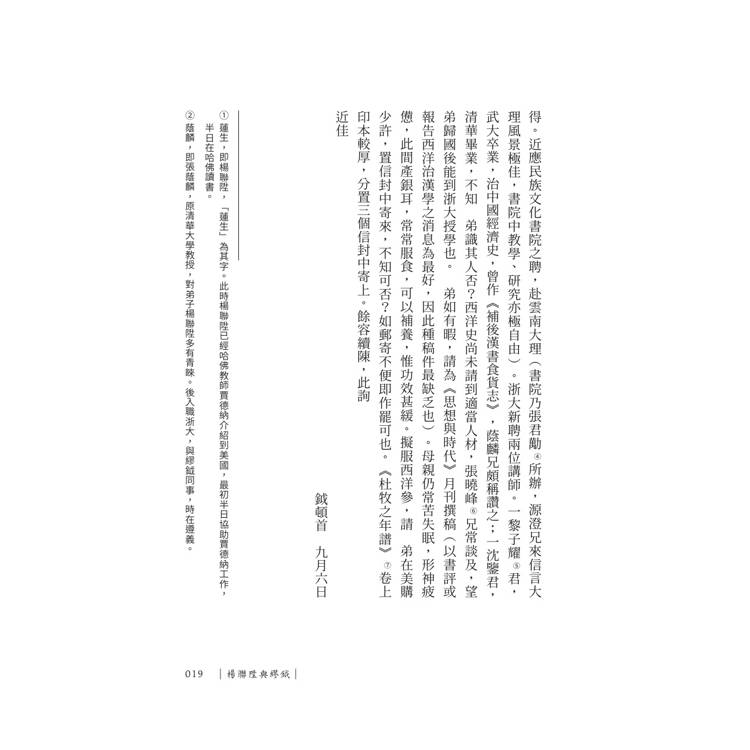 楊聯陞在哈佛講壇上持批評之銳,亦在信中流露敬長之禮、治學之誠。他與繆鉞論及文史教學與時代風潮,與錢穆則深入研討《朱子新學案》、儒學義理及學術出版。信中語氣或懇切,或沉靜,然皆蘊含一種不捨文化精神凋敝的溫熱。這些信劄並不為宏論歷史所設,卻無意間為當代留下珍貴的學術側影。見證了三位知識分子對於「思想可以如何活著」的實踐――不靠宏大的制度,而靠紙筆間的持續質問與回應。本書信件來自家屬珍藏以及素書樓基金會等首度公開資料,是形成現代學術發展的重要印記。