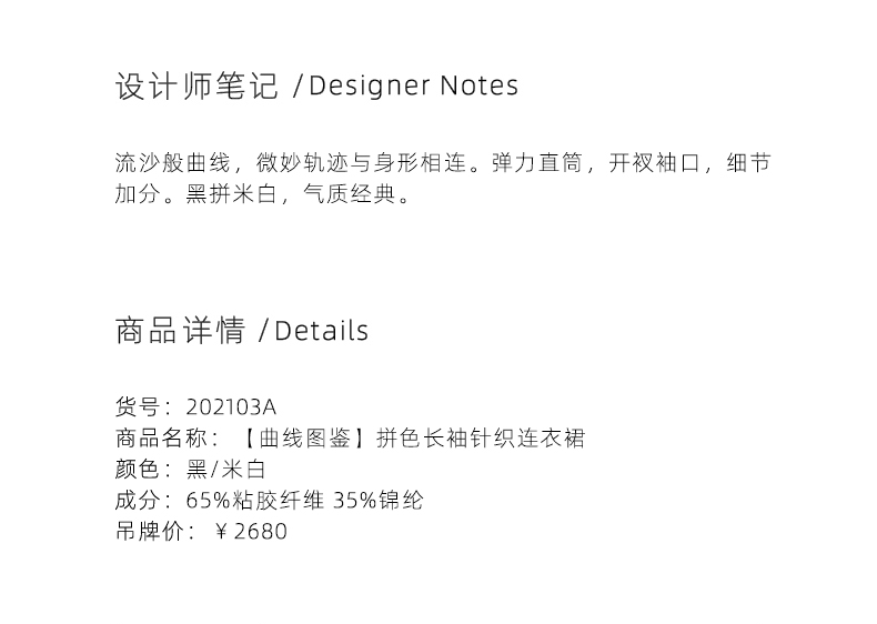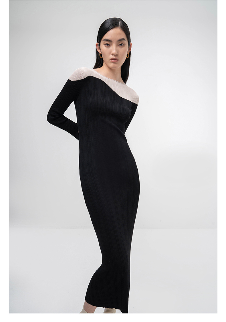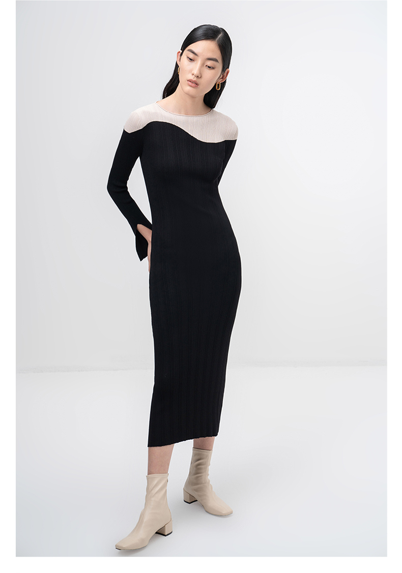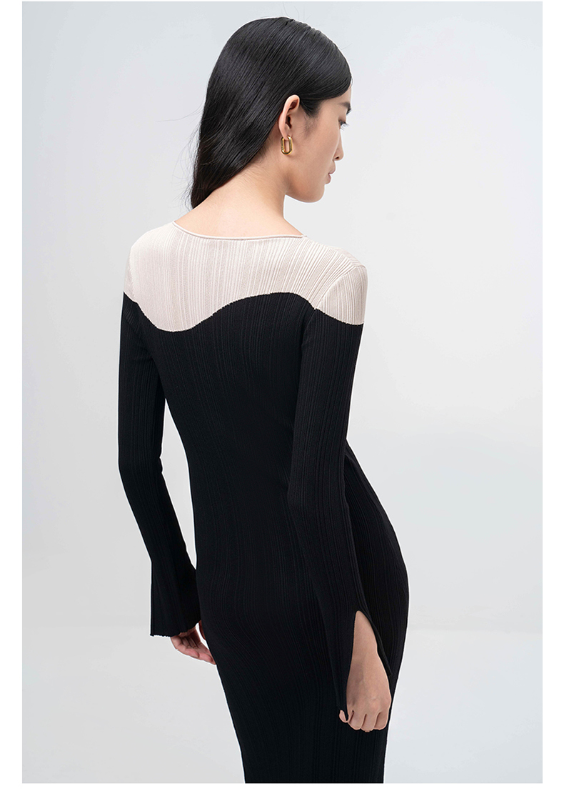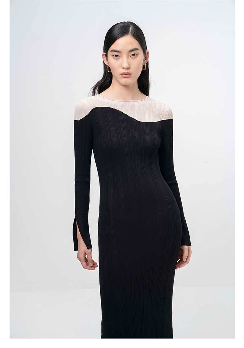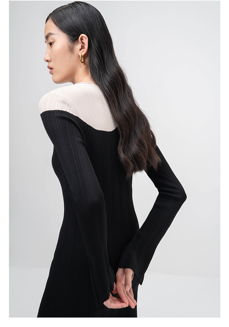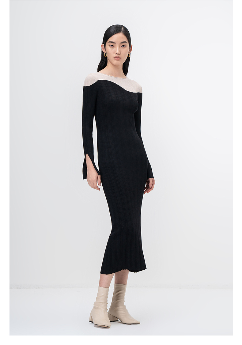 【曲线图鉴】流畅曲线黑拼米白长袖针织连衣裙/202103A