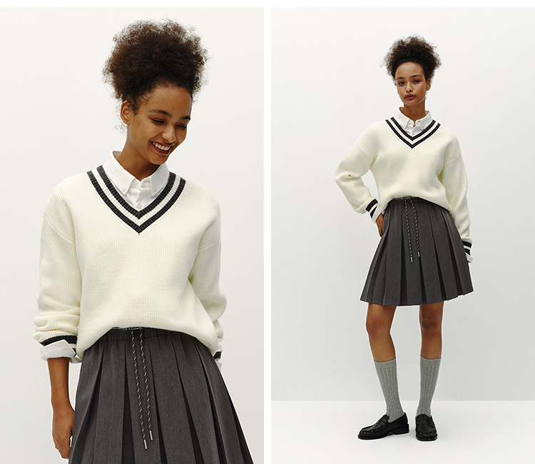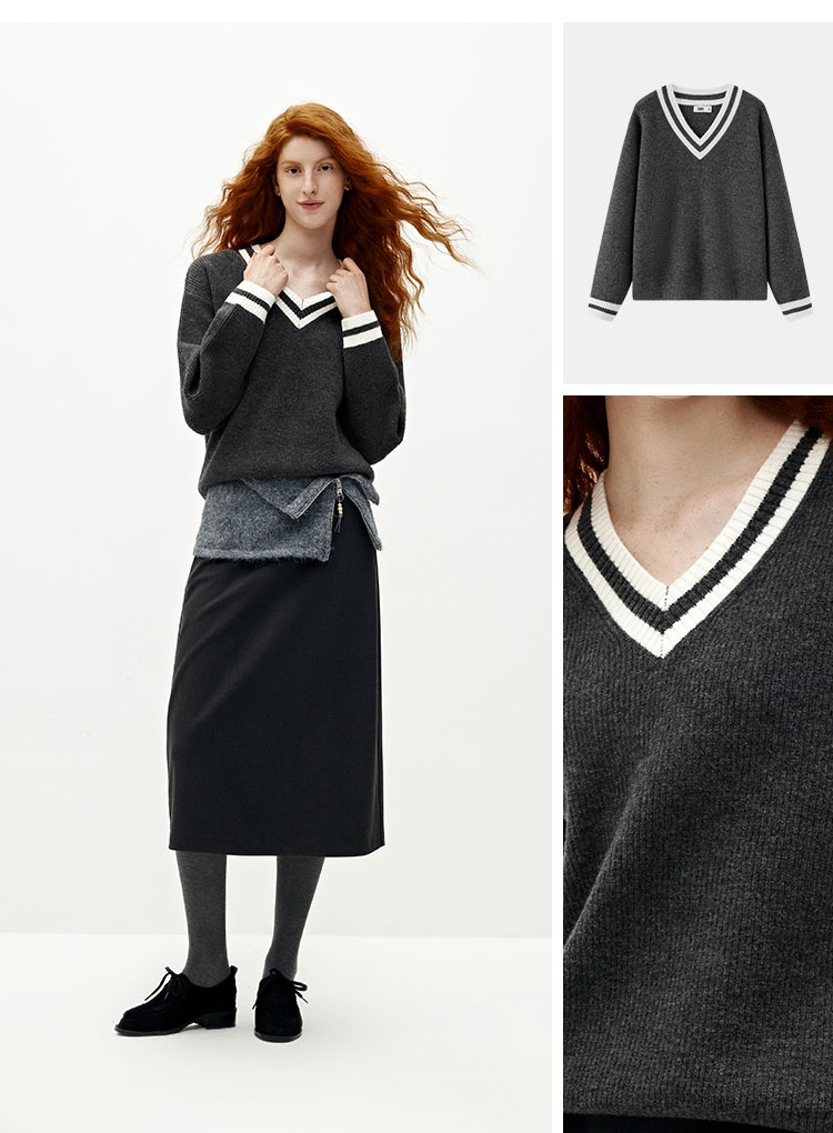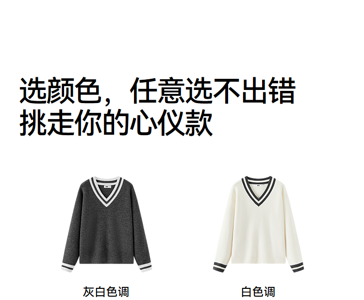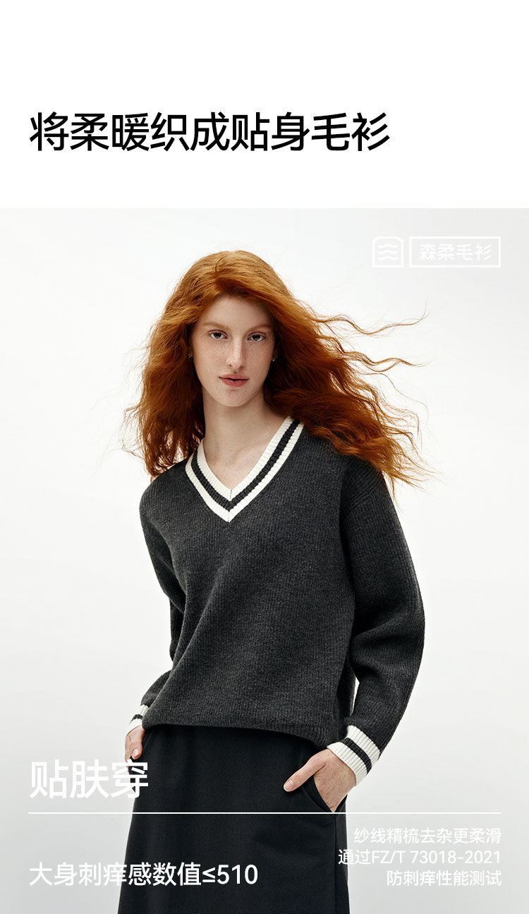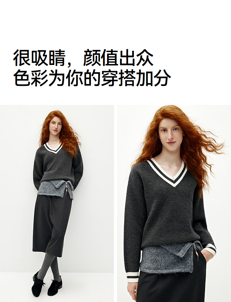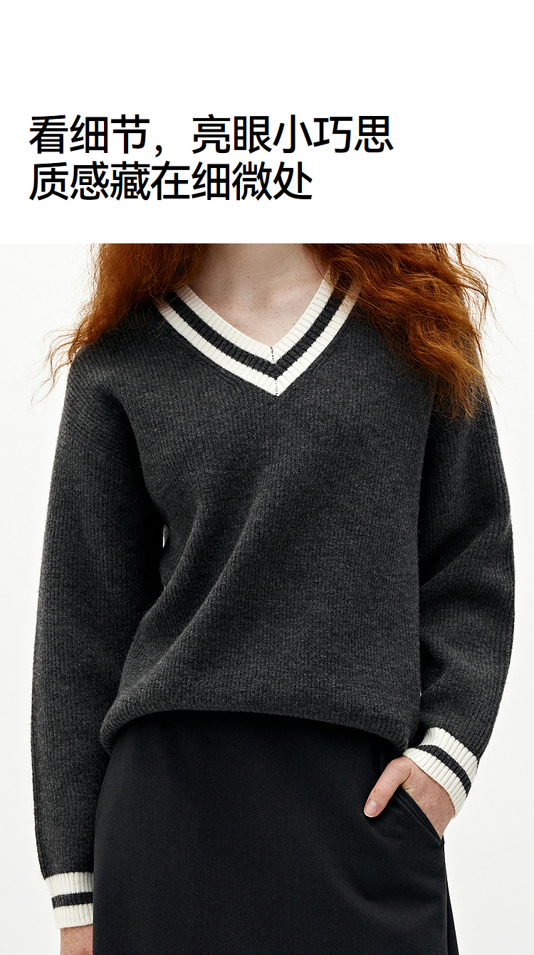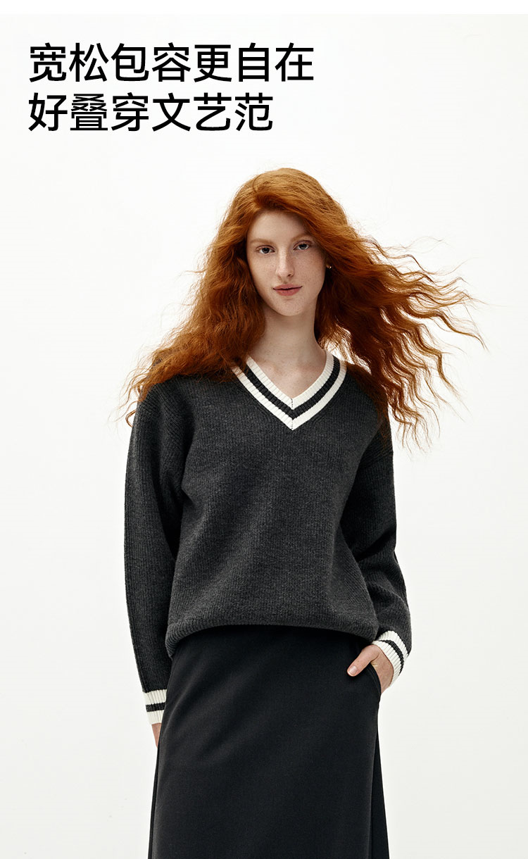 商场同款|森柔森马毛衣女冬撞色V领宽松2025新款叠穿简约文艺毛衫