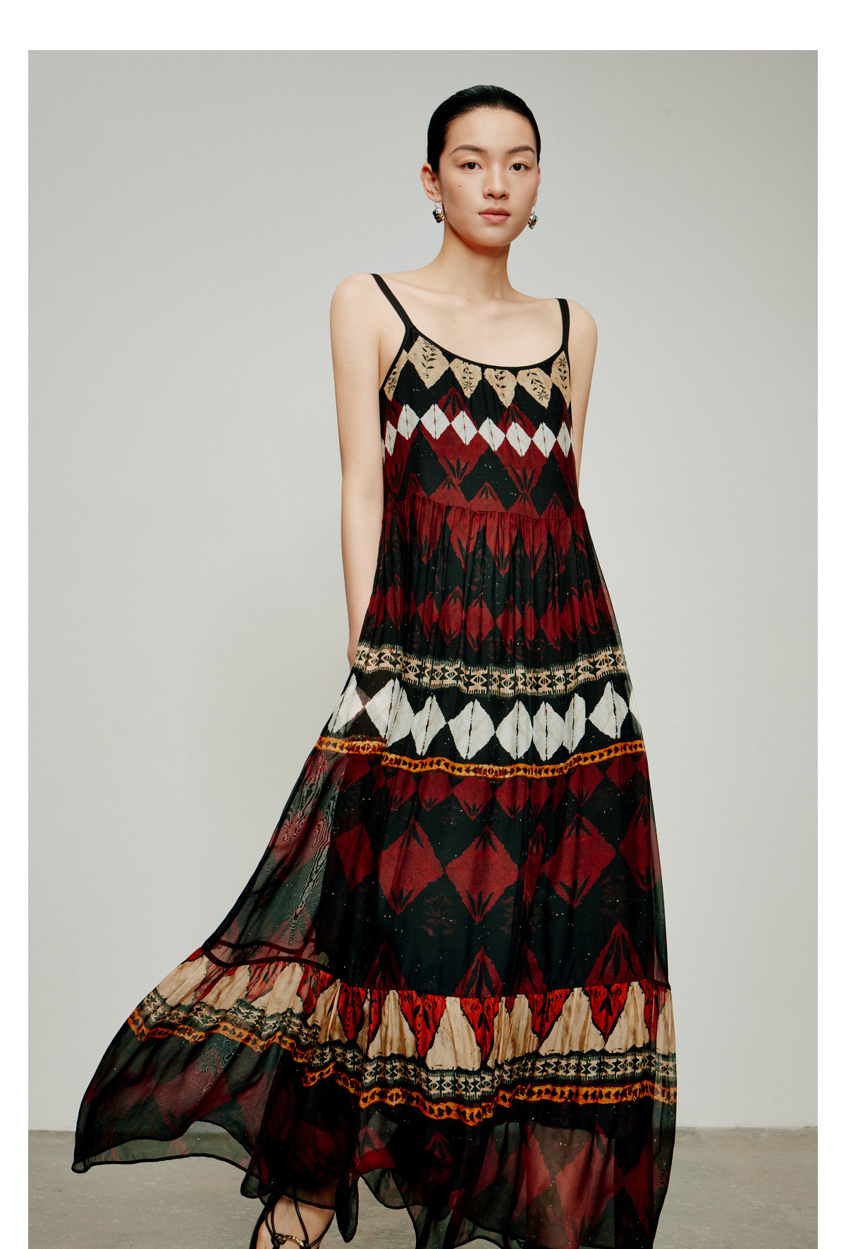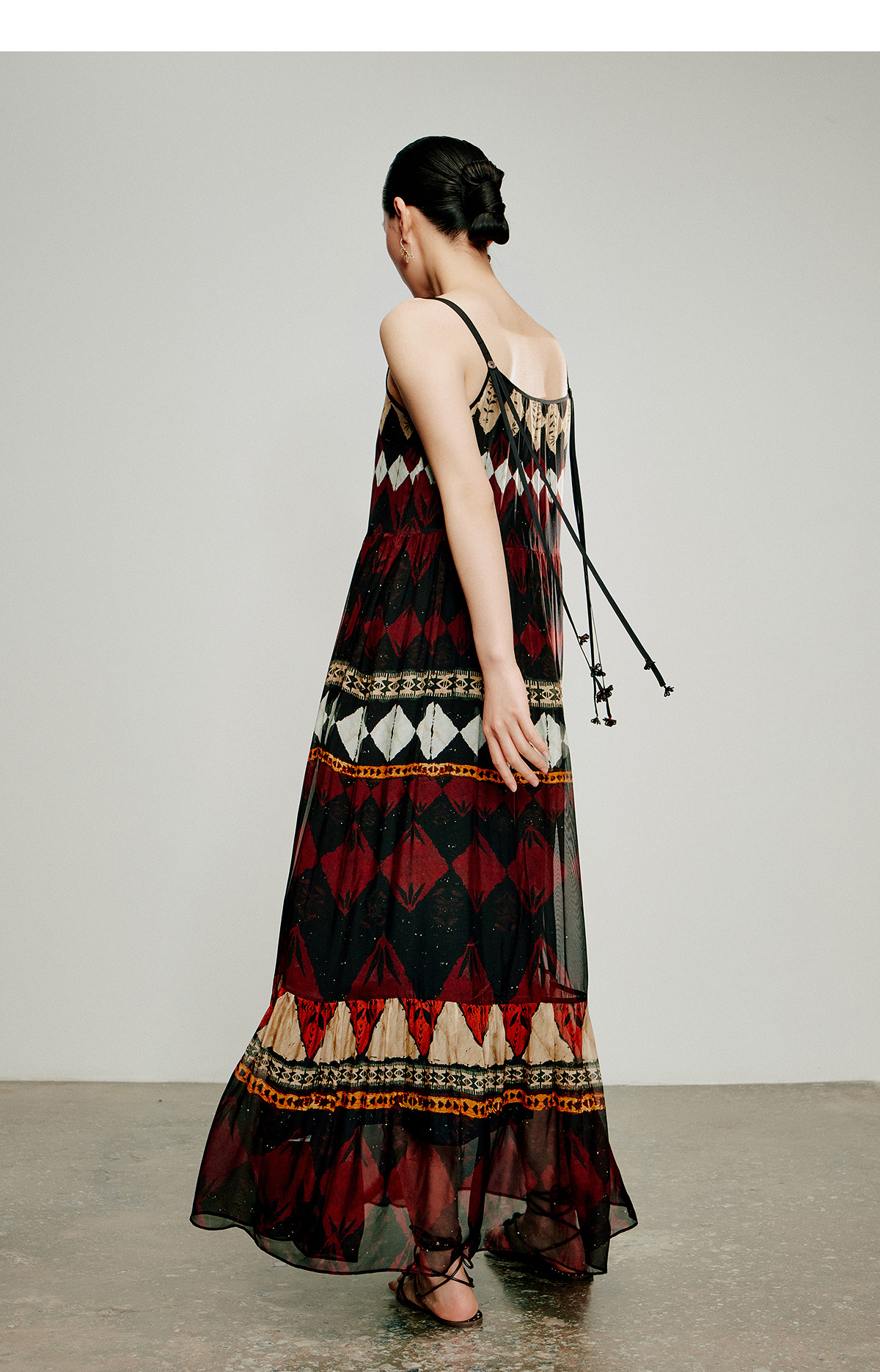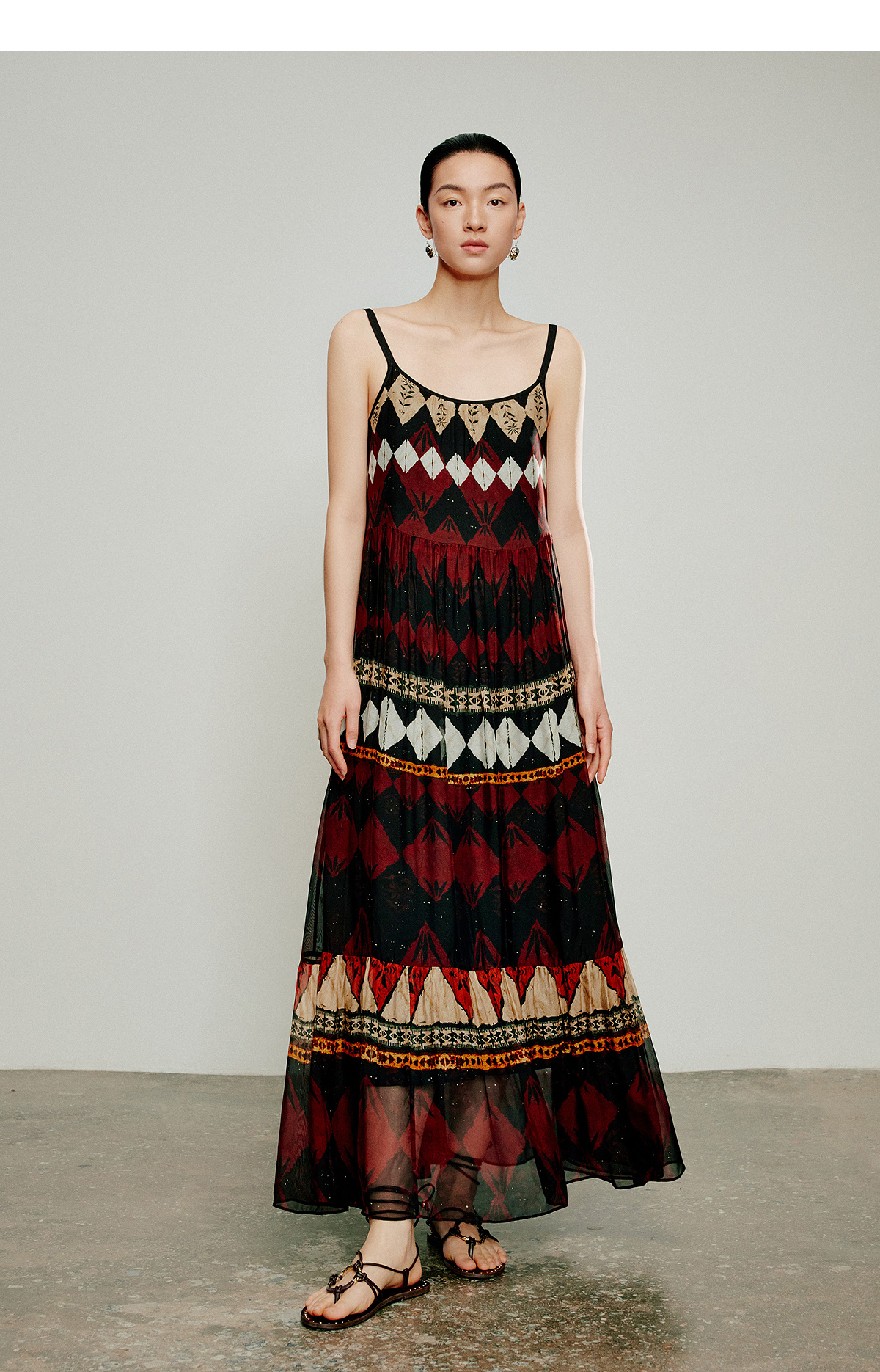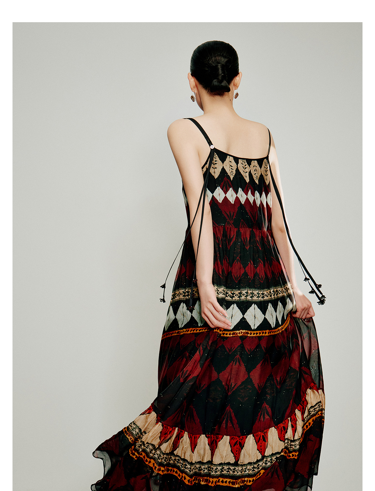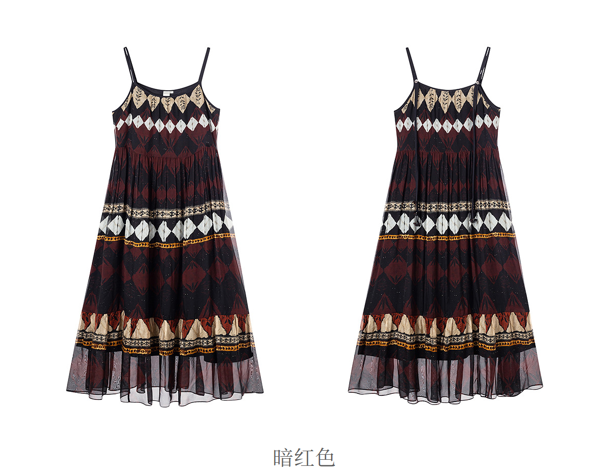 【林栖设计小店】地色几何|暗红色复古印花飘逸显瘦吊带A字连衣裙1962187B