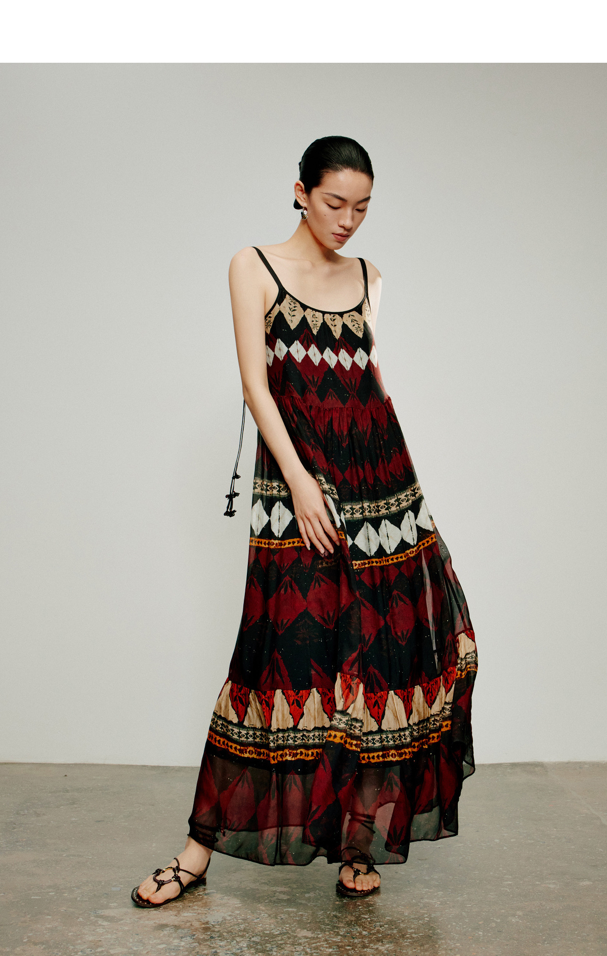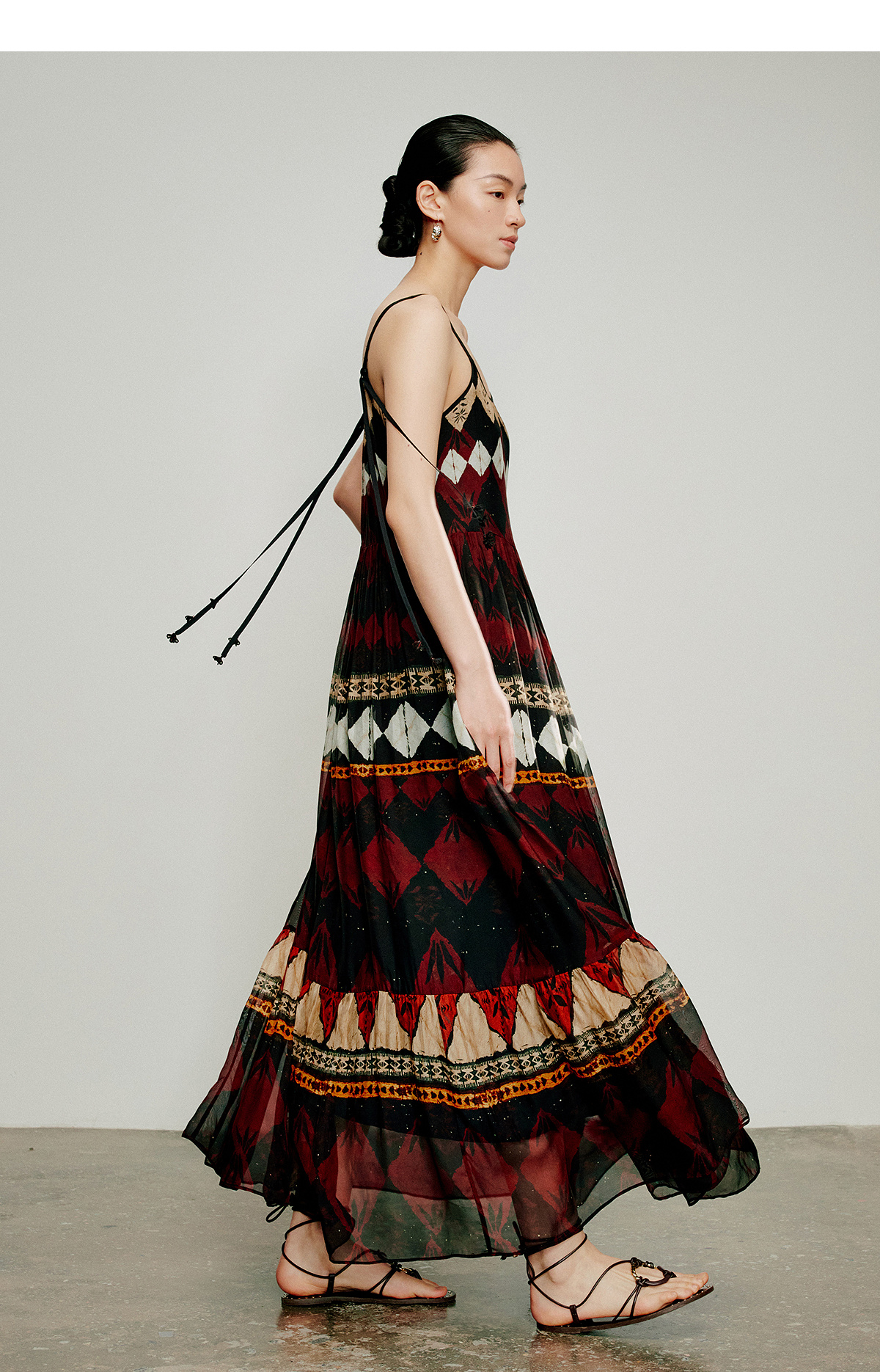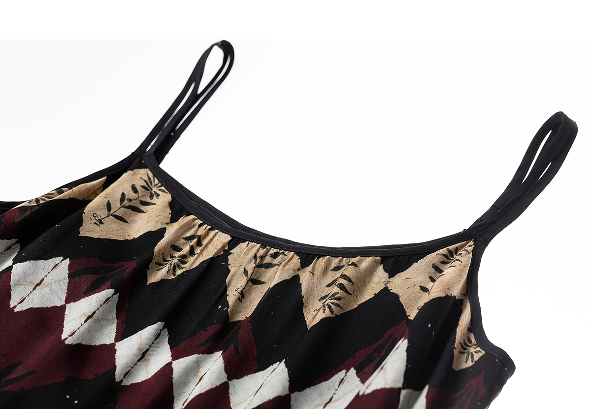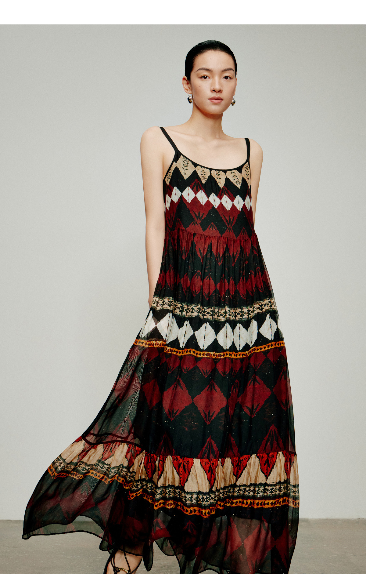 【林栖设计小店】地色几何|暗红色复古印花飘逸显瘦吊带A字连衣裙1962187B
