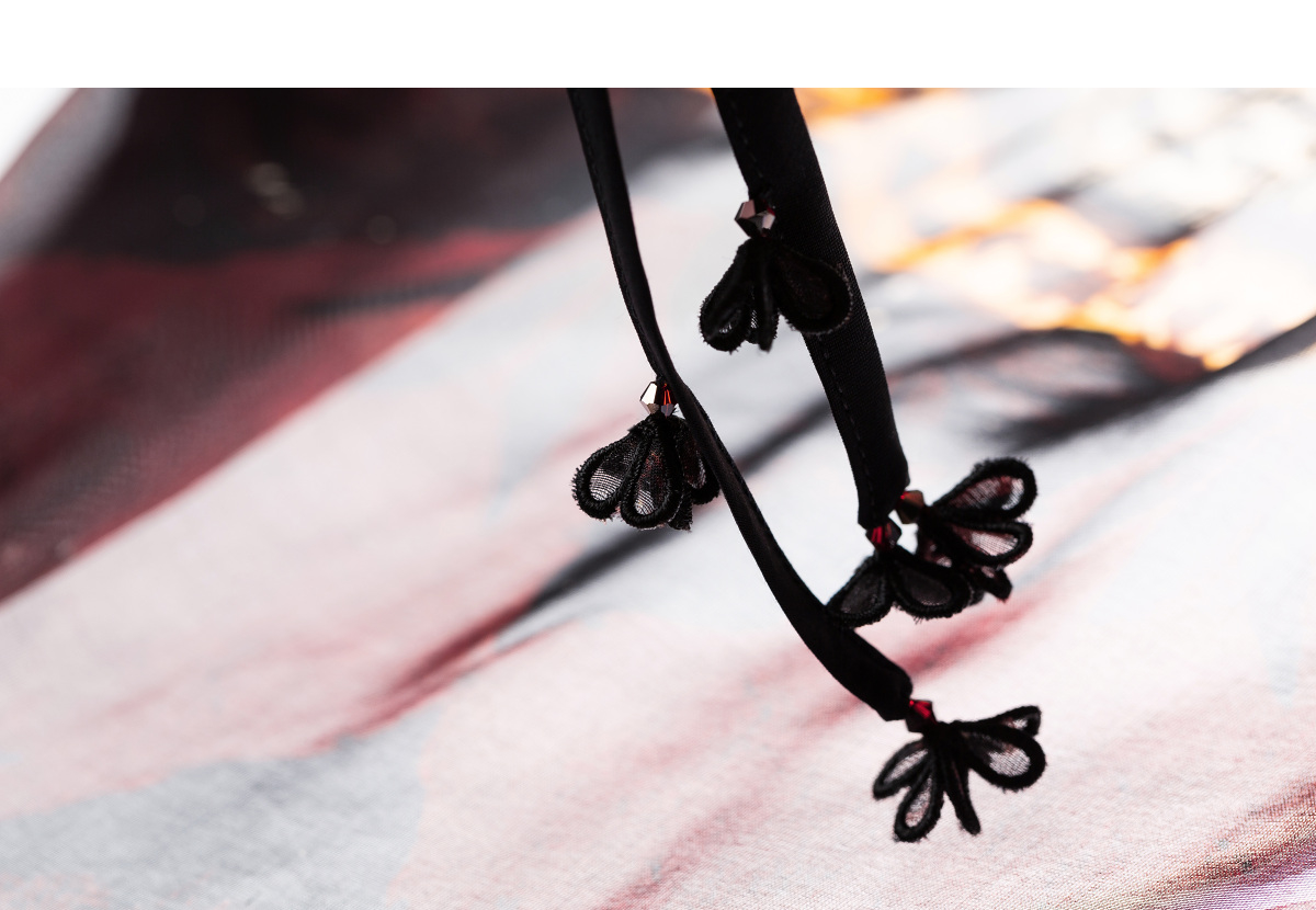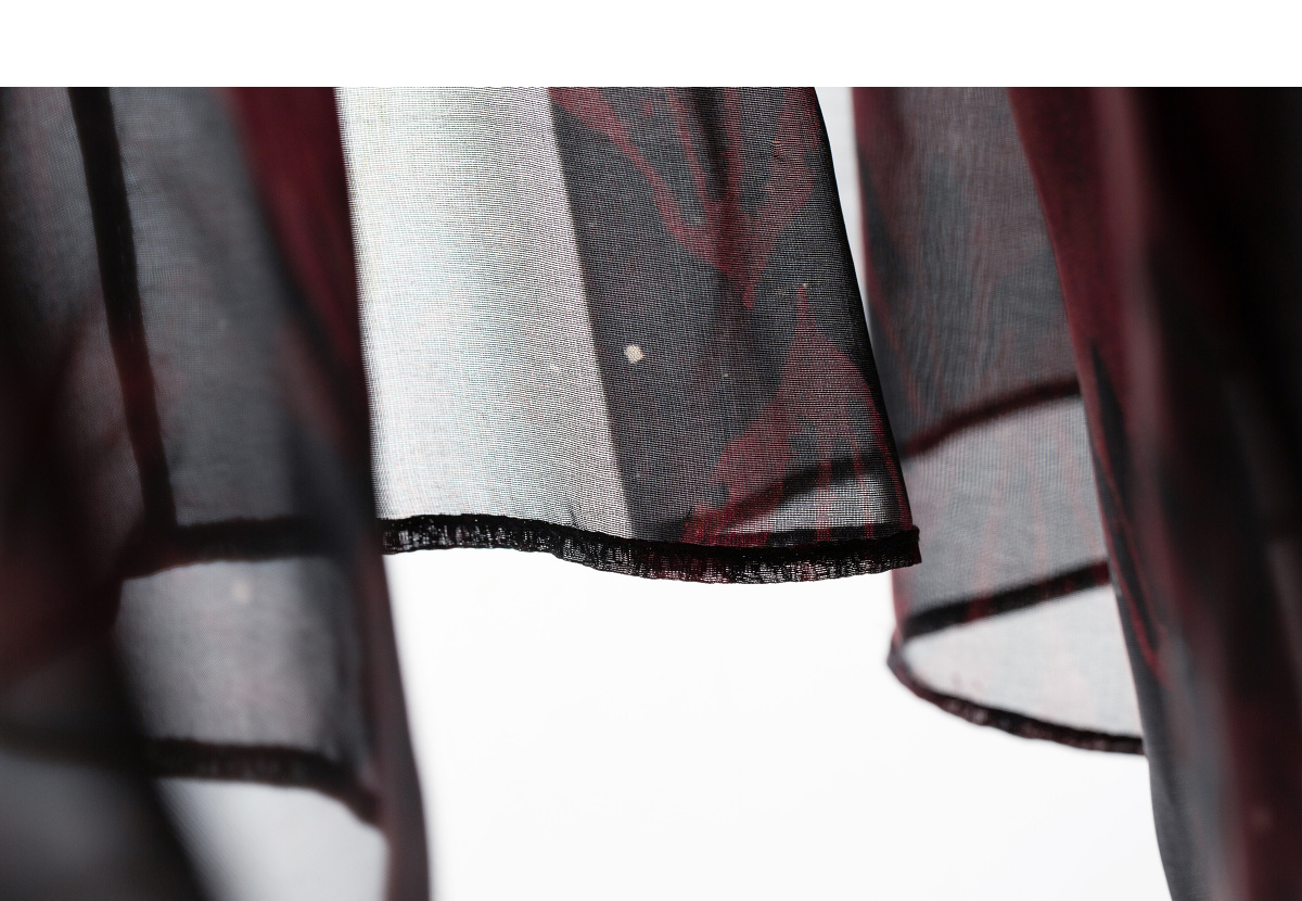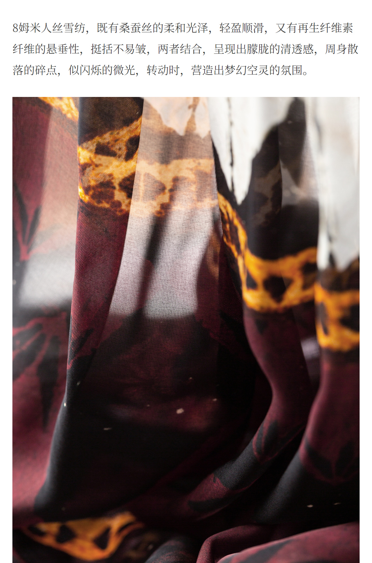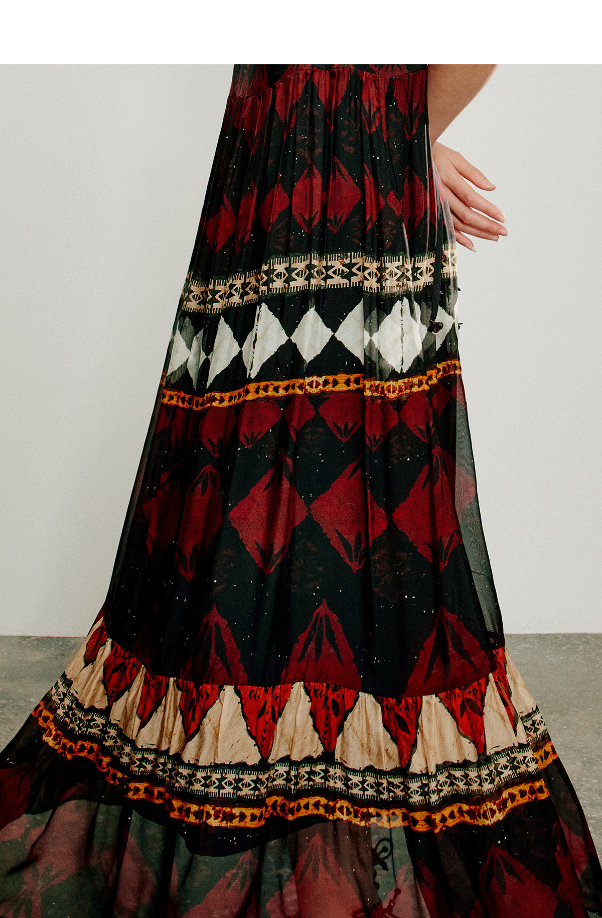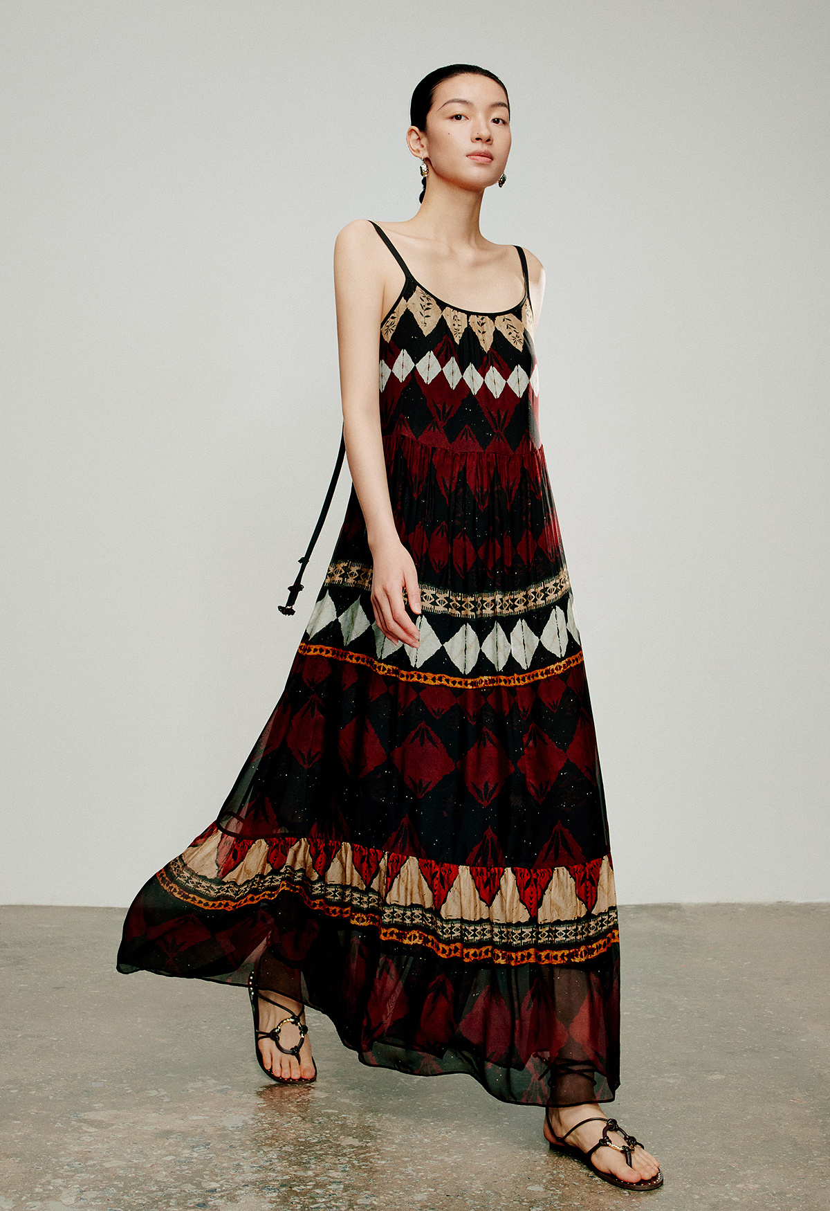 【林栖设计小店】地色几何|暗红色复古印花飘逸显瘦吊带A字连衣裙1962187B