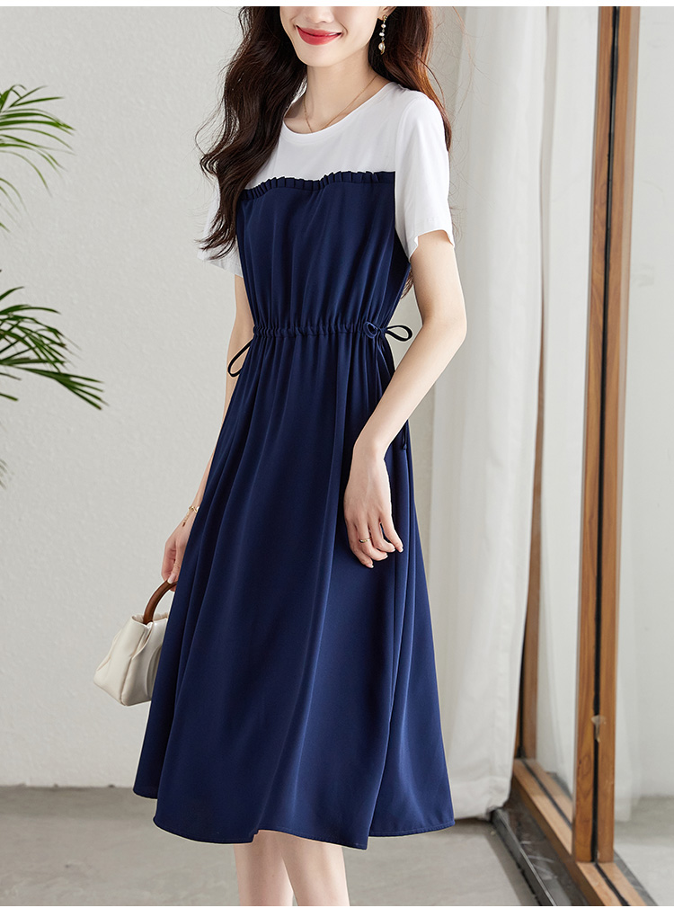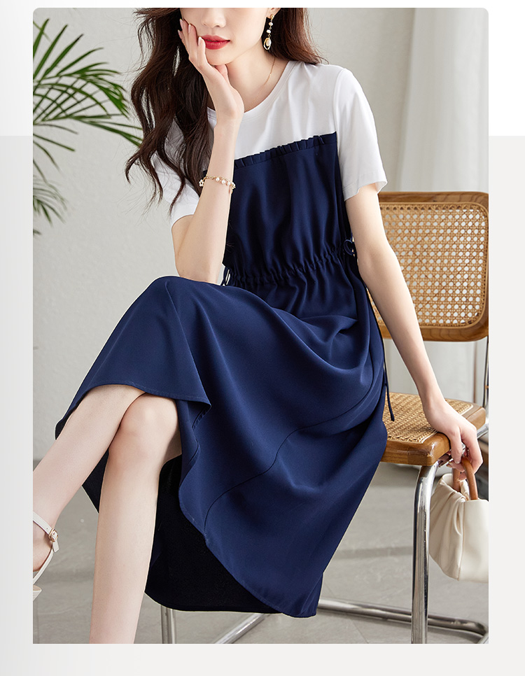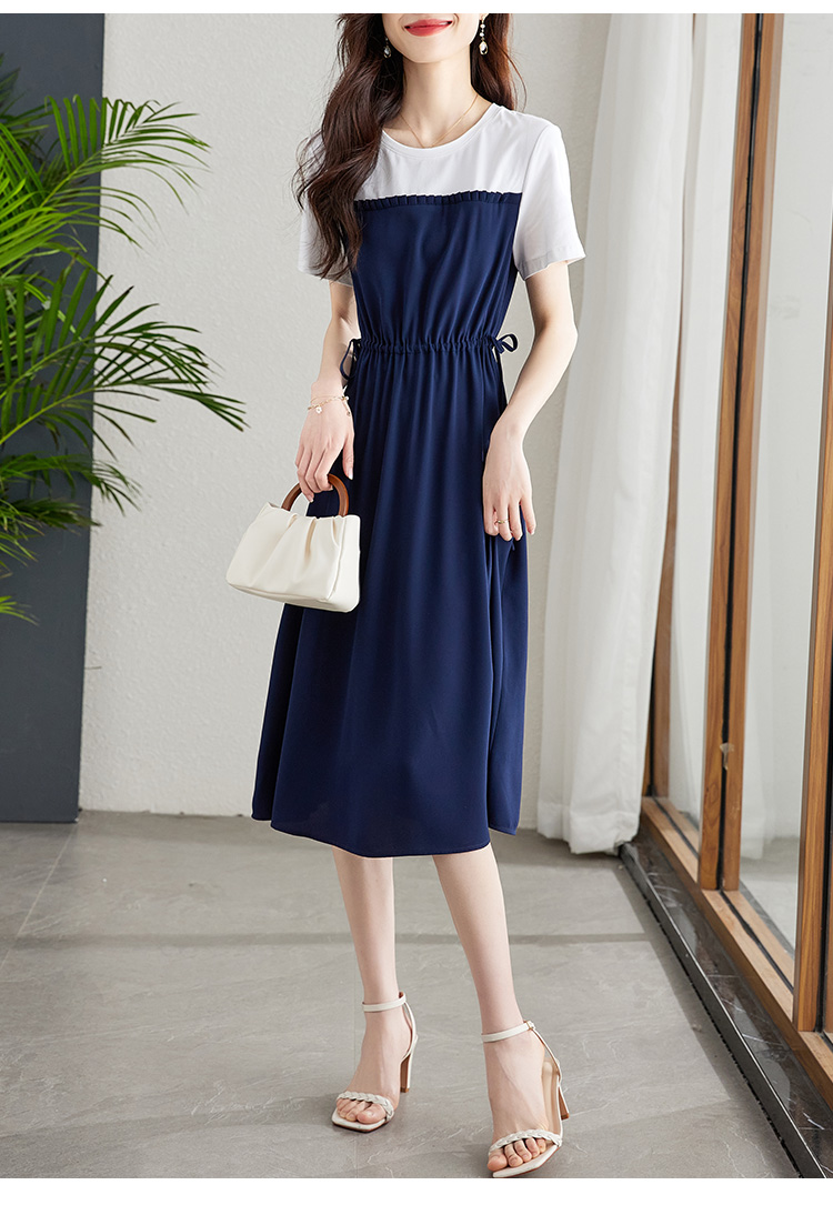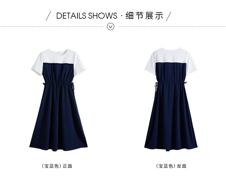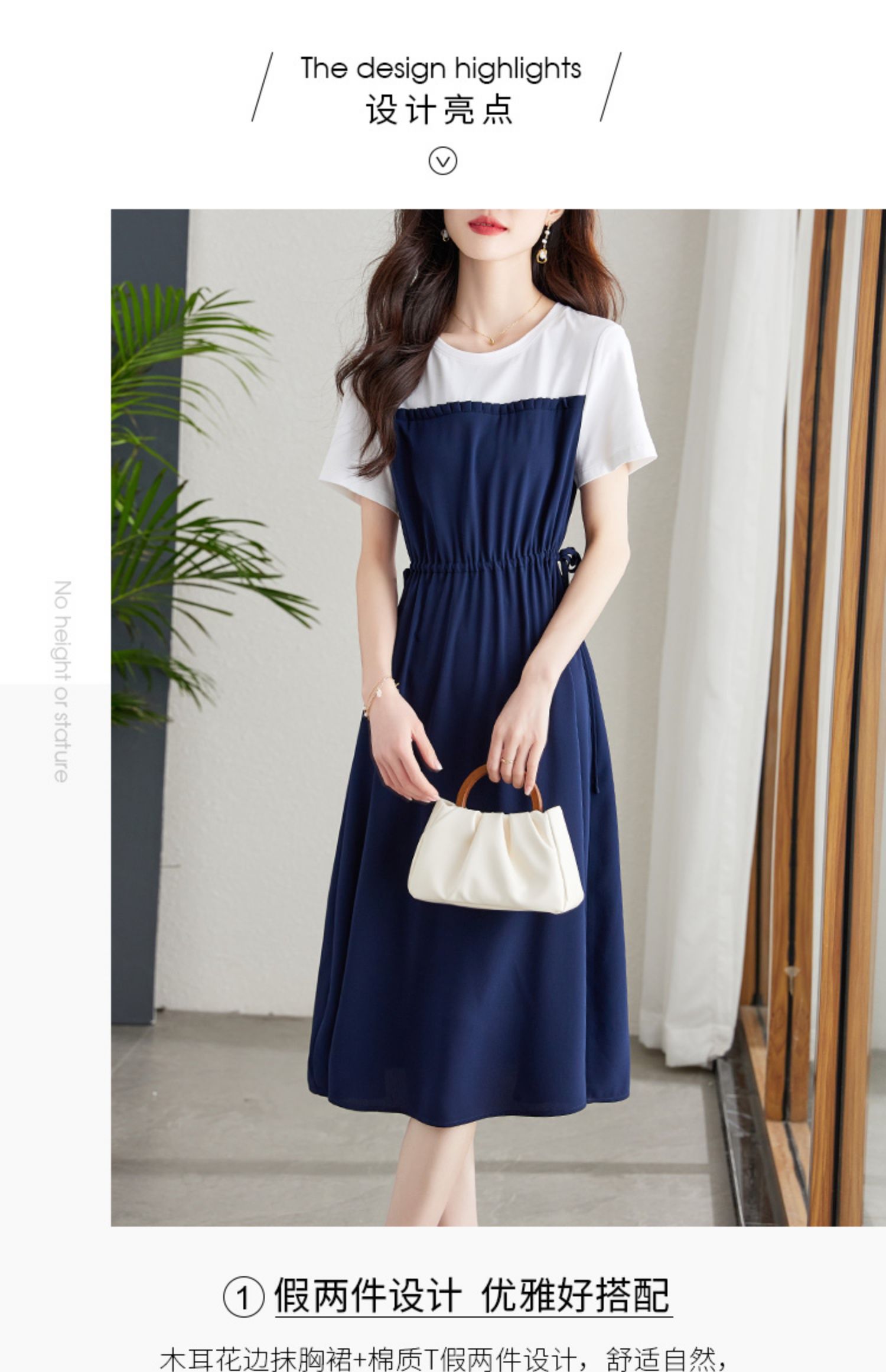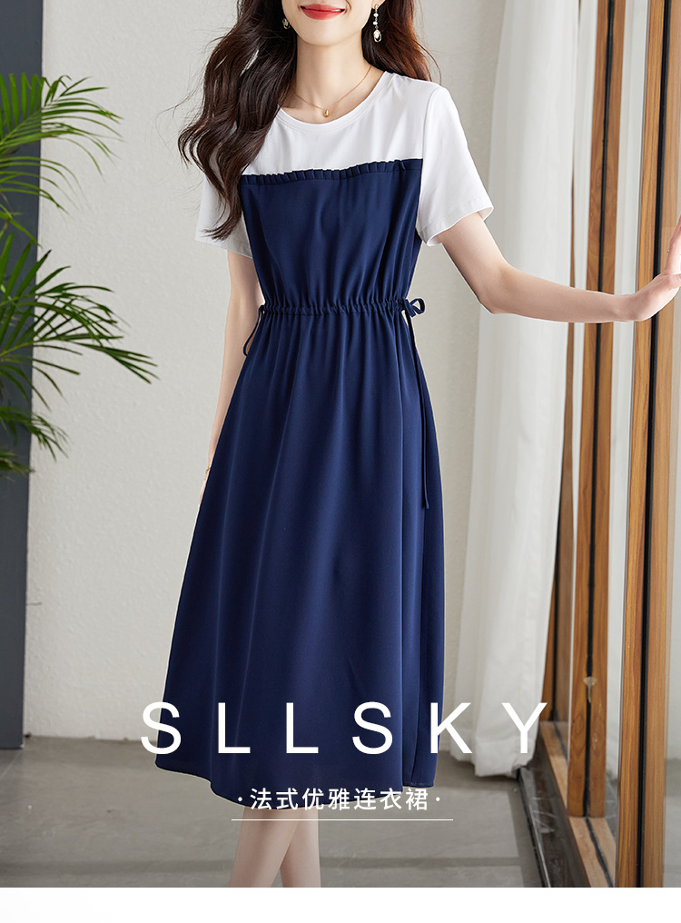 【五折购】熙世界连衣裙女夏显瘦收腰2025年新款法式撞色圆领假两件休闲裙子