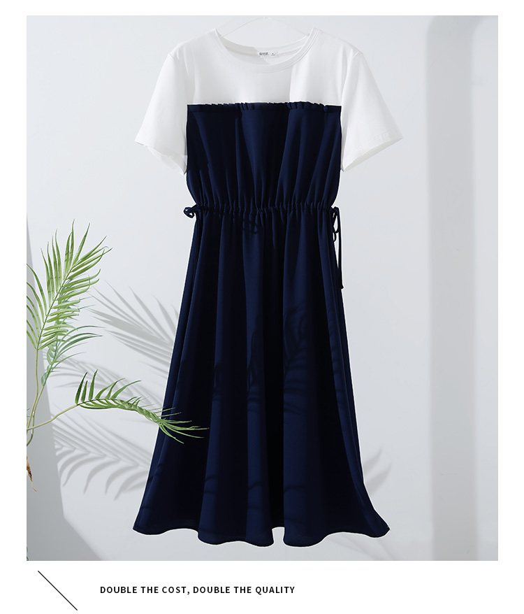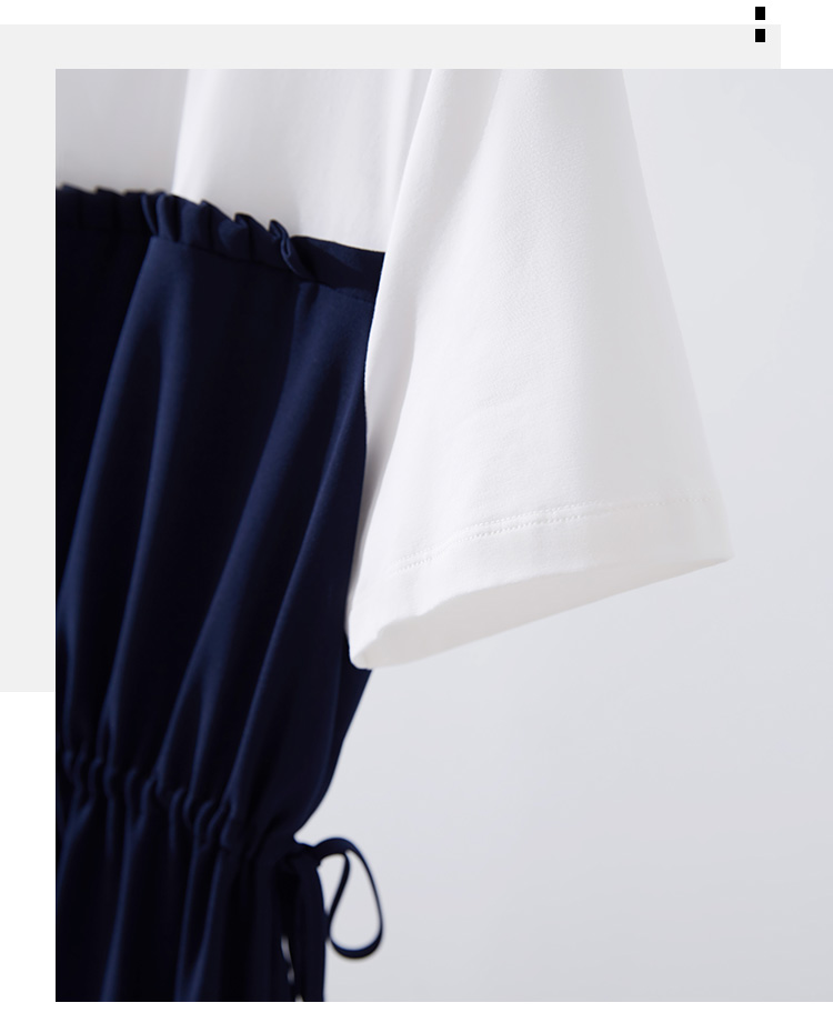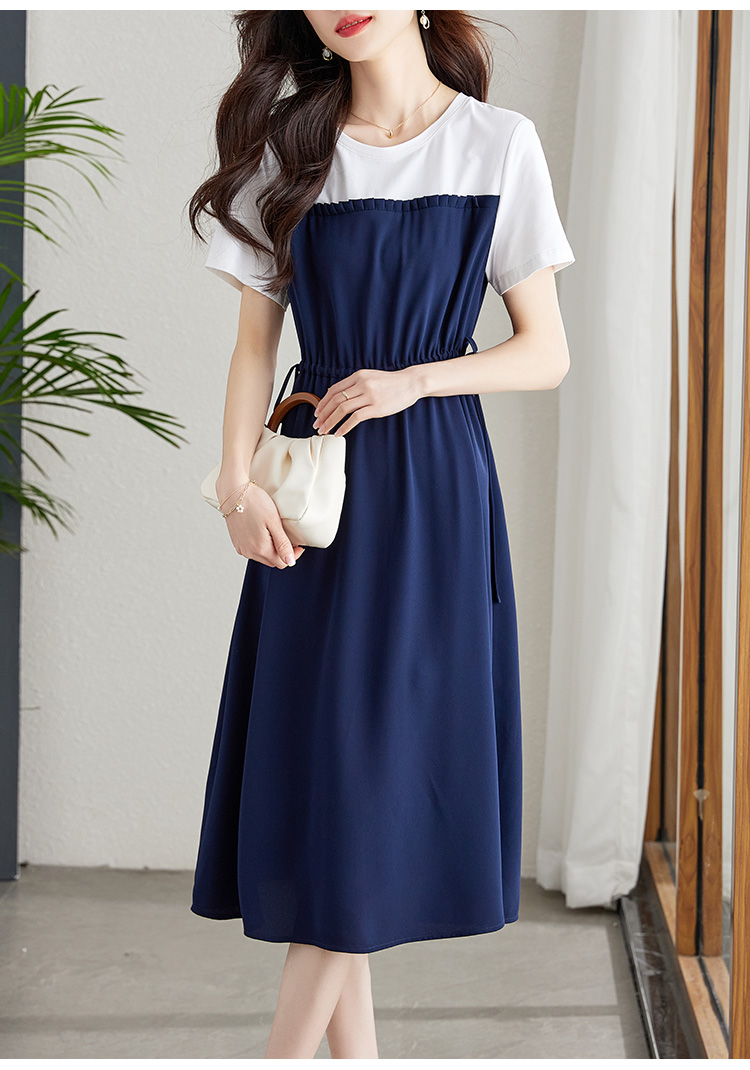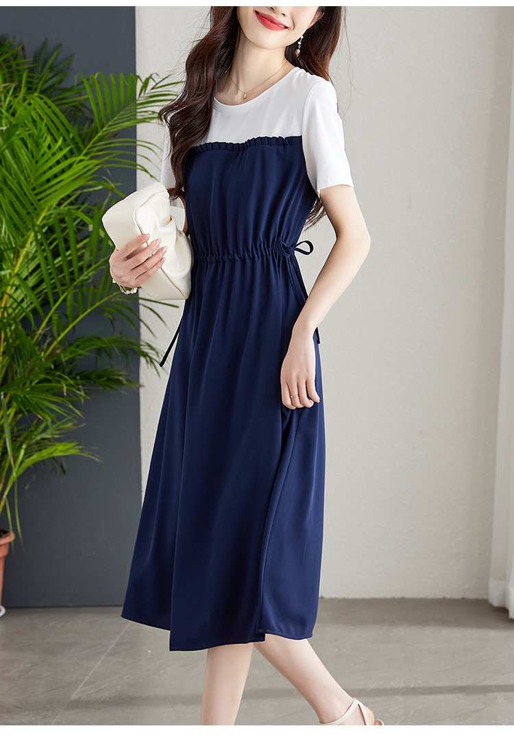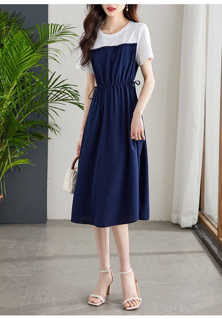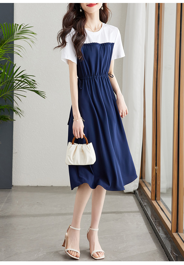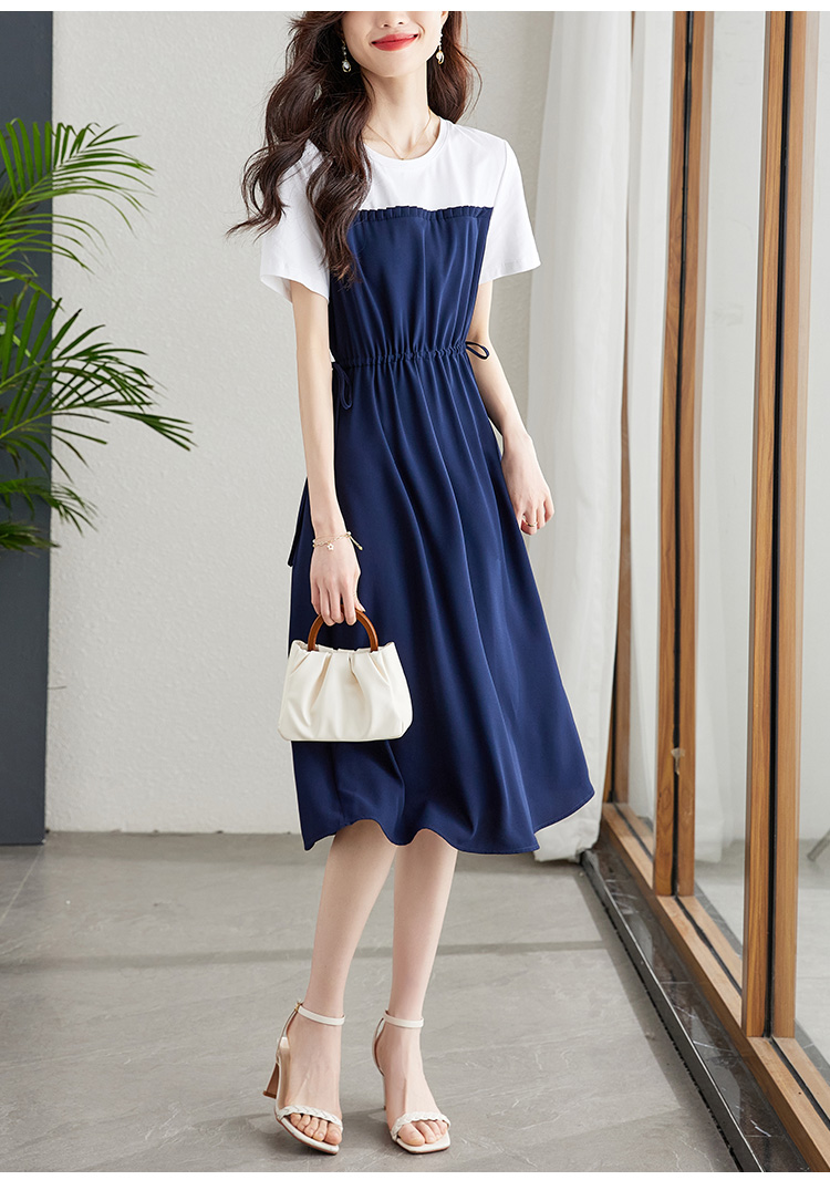 【五折购】熙世界连衣裙女夏显瘦收腰2025年新款法式撞色圆领假两件休闲裙子