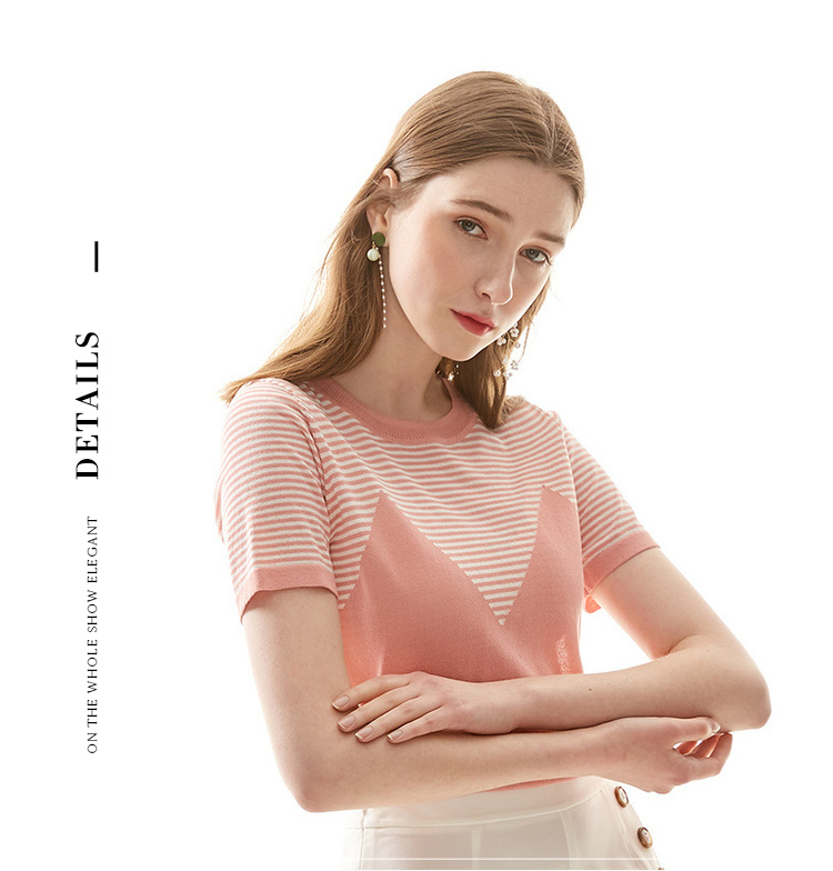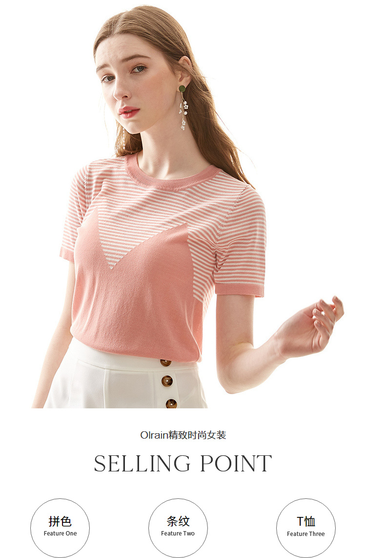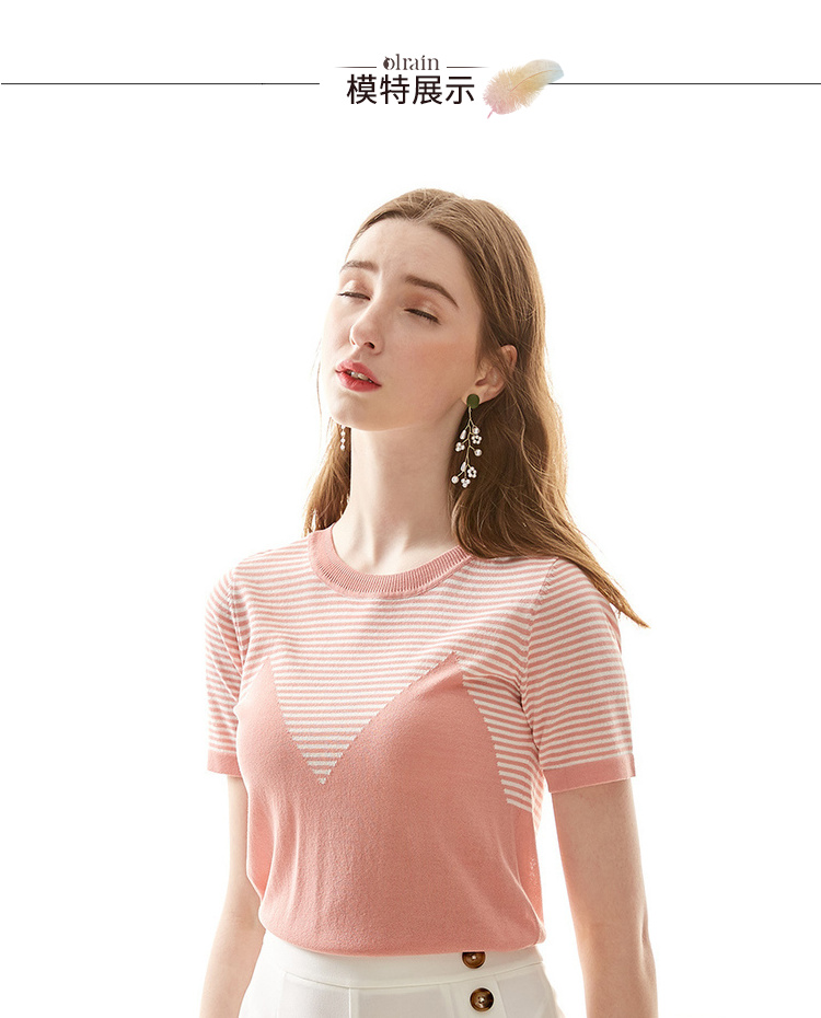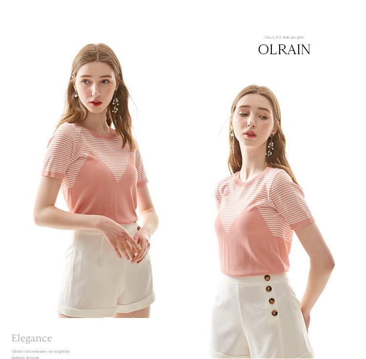 欧芮儿2019新款女装夏装圆领条纹针织衫女短袖撞色收腰显瘦上衣