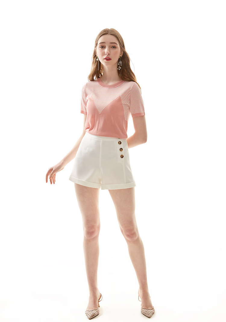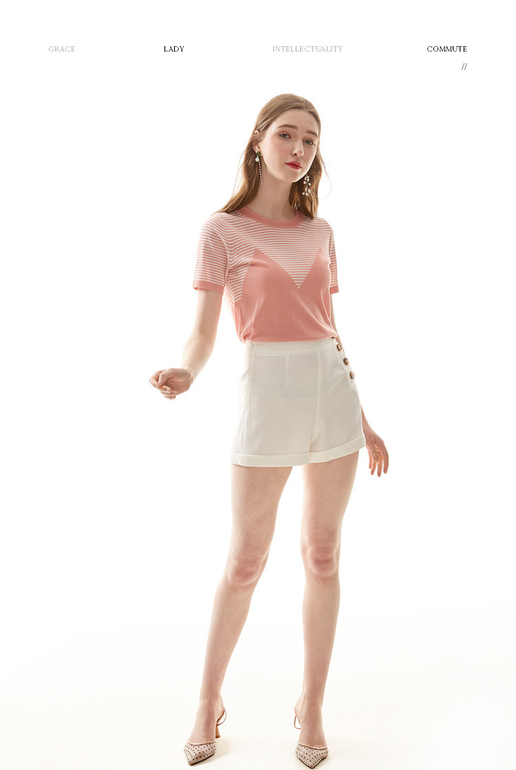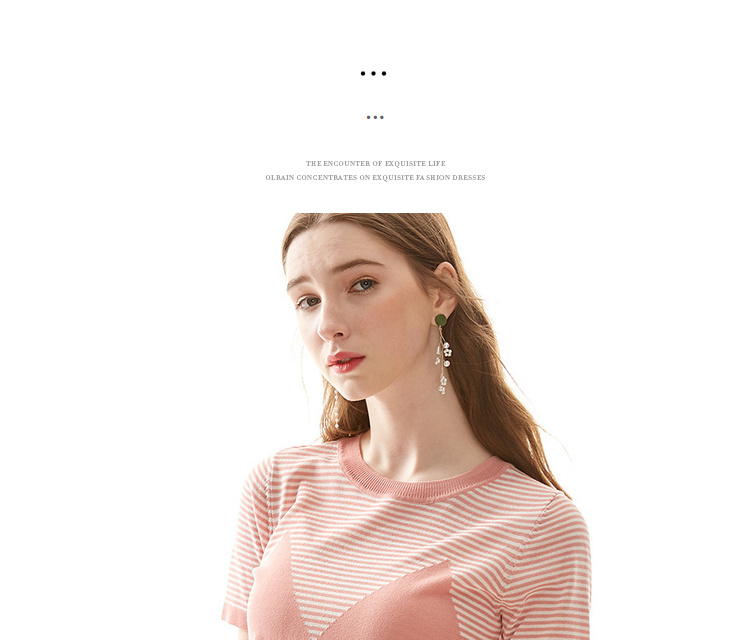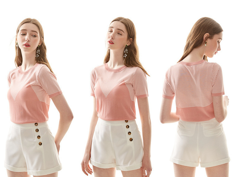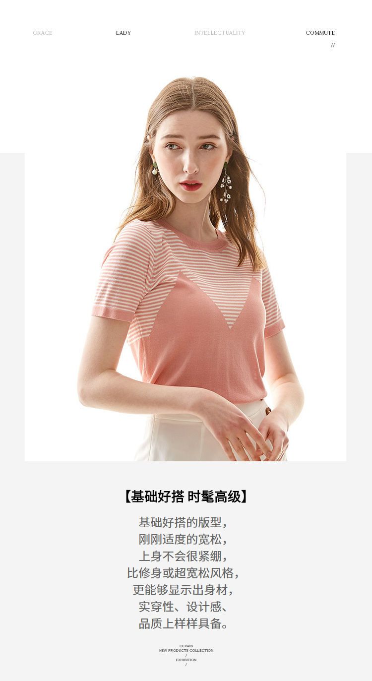 欧芮儿2019新款女装夏装圆领条纹针织衫女短袖撞色收腰显瘦上衣