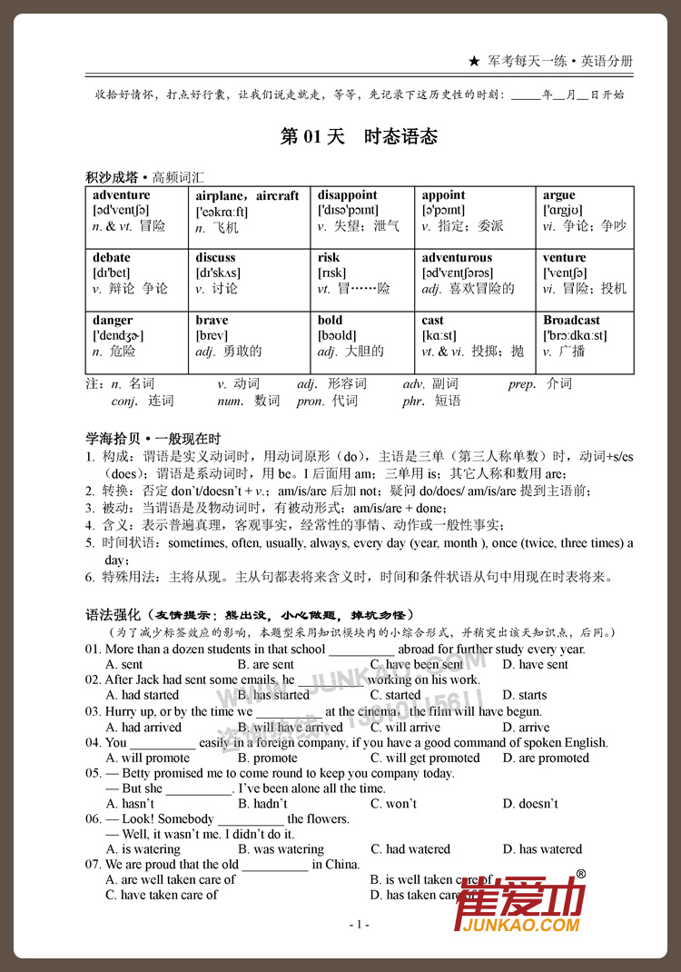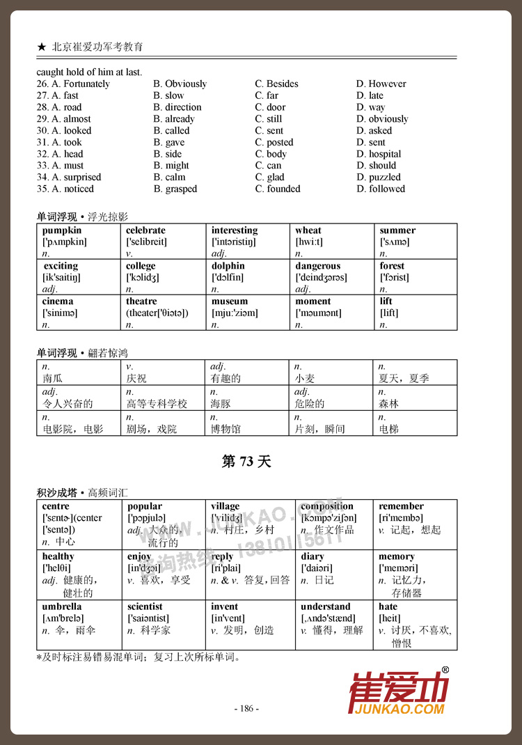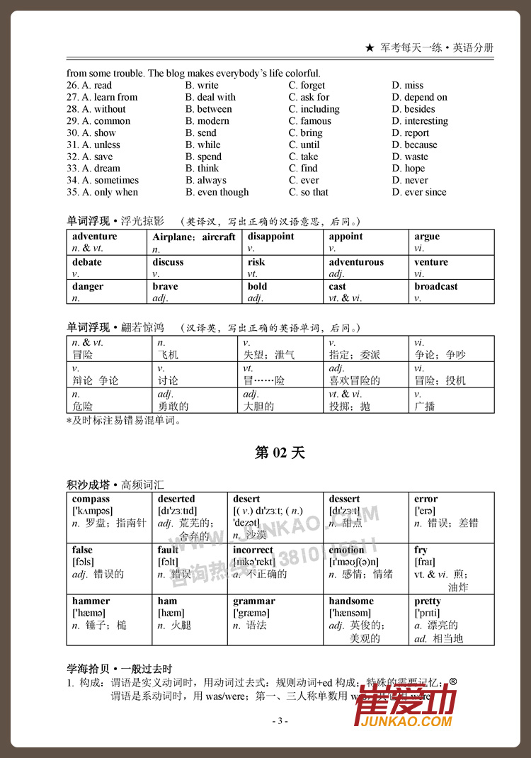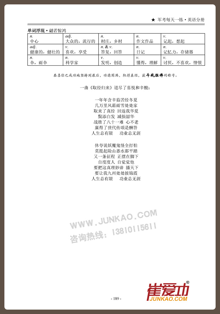 战士考生们在备考军考中的艰辛我们深有感触;战士们即要出色完成工作、训练、出勤等任务,还要挤零碎时间学习,严重存在学习时间不足的问题;所以在编写之初也确定了利用好“碎片时间”的设计思路,利用零散时间,随时随地学习,每日坚持,积少成多;故山不辞土故能成其高,海不辞水故能成其深。