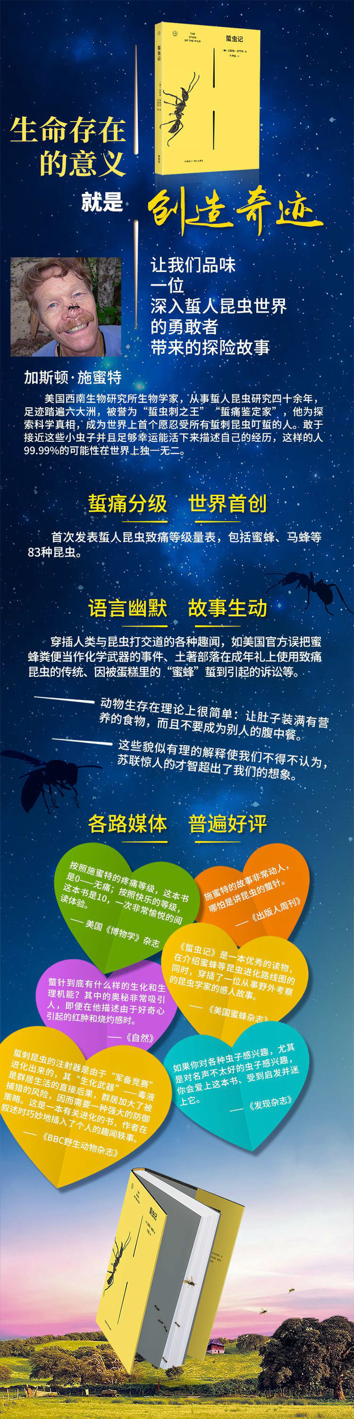 原版《蜇虫记》由约翰·霍普金斯大学出版社于2016年3月出版,出版3个月销量3000册,在美国引起了巨大轰动,包括《自然》《美国国家地理》《BBC野生动物杂志》在内的14家媒体为这本书撰写了评论,给予了极高的评价。本书作者美国西南生物研究所生物学家加斯顿·施蜜特从事蜇人昆虫研究四十余年,足迹踏遍六大洲,被誉为“蜇虫刺之王”,他为探索科学真相,成为世界上首位愿忍受所有蜇刺昆虫叮蜇的人,施蜜特教授对事业的执着追求和献身精神为世人所仰慕。《蜇虫记》是他数十年经验积累的结晶,是一部有关蜂蚁类蜇刺昆虫的读本。在出版中文翻译版时,作者要求将自己的名字翻译成“施蜜特”,用“蜜蜂”的“蜜”,而不是“密”。这本书带有自传性质,在介绍蜇人昆虫的同时,写到了他童年时代对昆虫的热爱,首次次被蜇的体验、获得的荣誉和与老师开的玩笑,求学过程中听从内心呼唤从化学专业转为生物专业,在一起捉虫子的过程中结识了自己未来的妻子,以及走上工作岗位之后种种有趣的科研经历。作者自己多次被蜇,对这些能制造剧烈疼痛的小虫子有深刻的了解,这些经历是其他人难以复制的。敢于接近这些小虫子并且足够幸运能活下来描述自己的经历,这样的人99.99%的可能性在世界上都灭绝了。