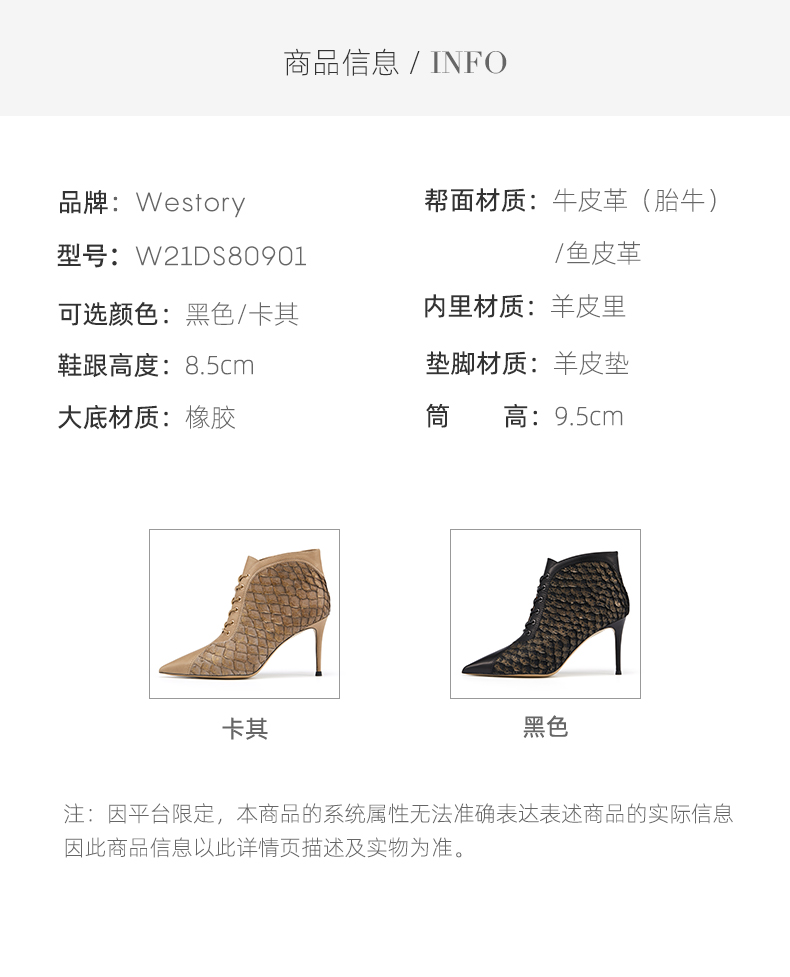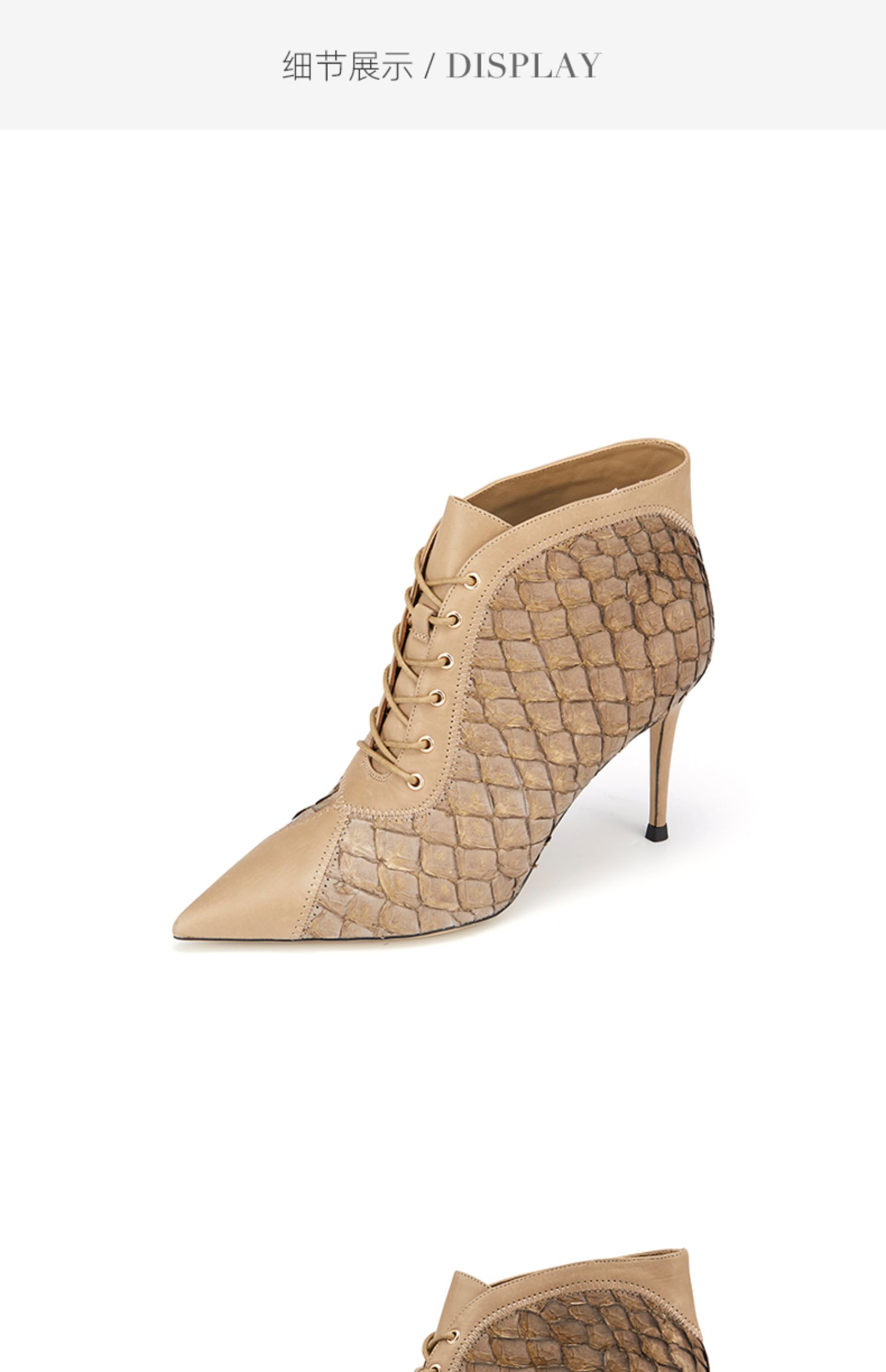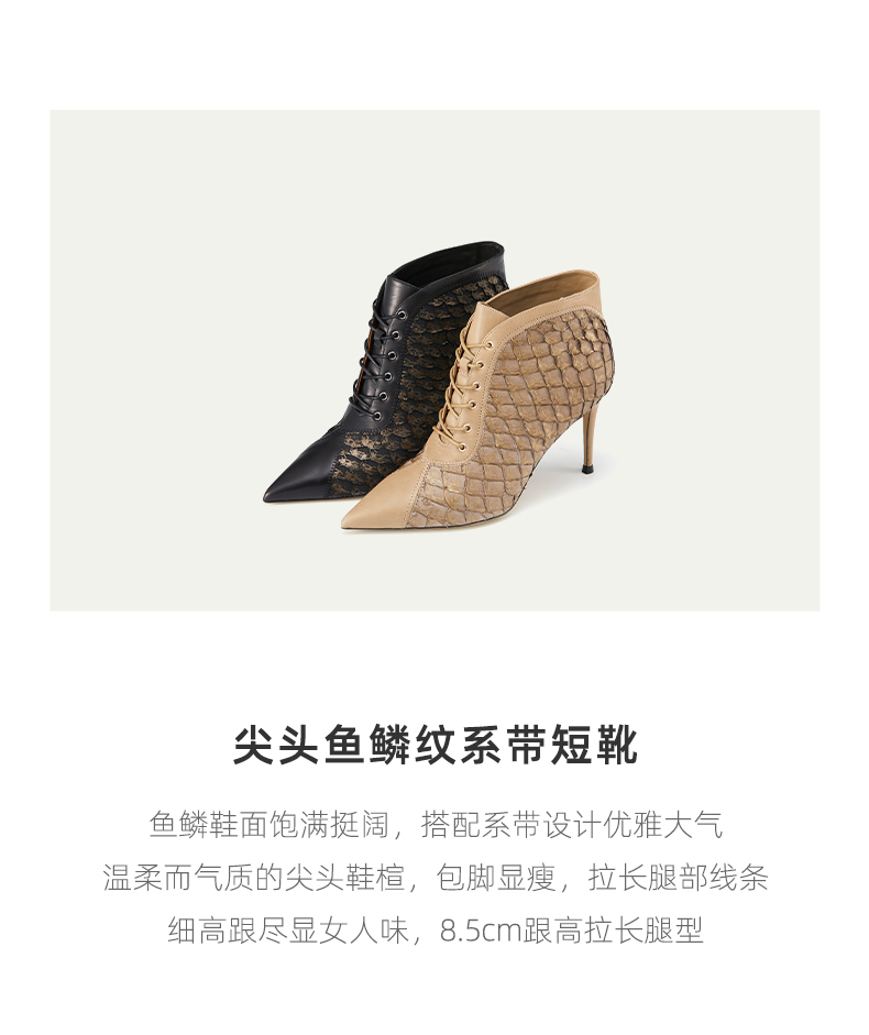 westory2021秋季新款细跟高跟短靴系带鱼鳞纹时装靴W21DS80901