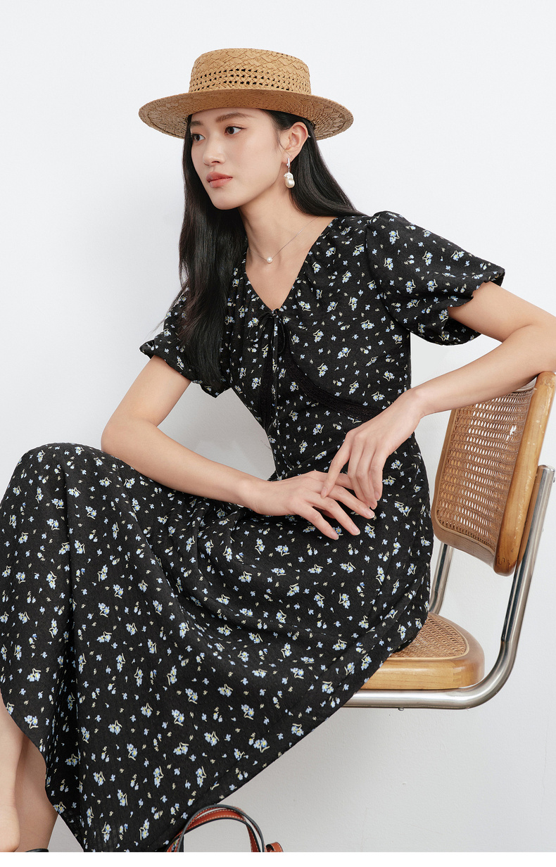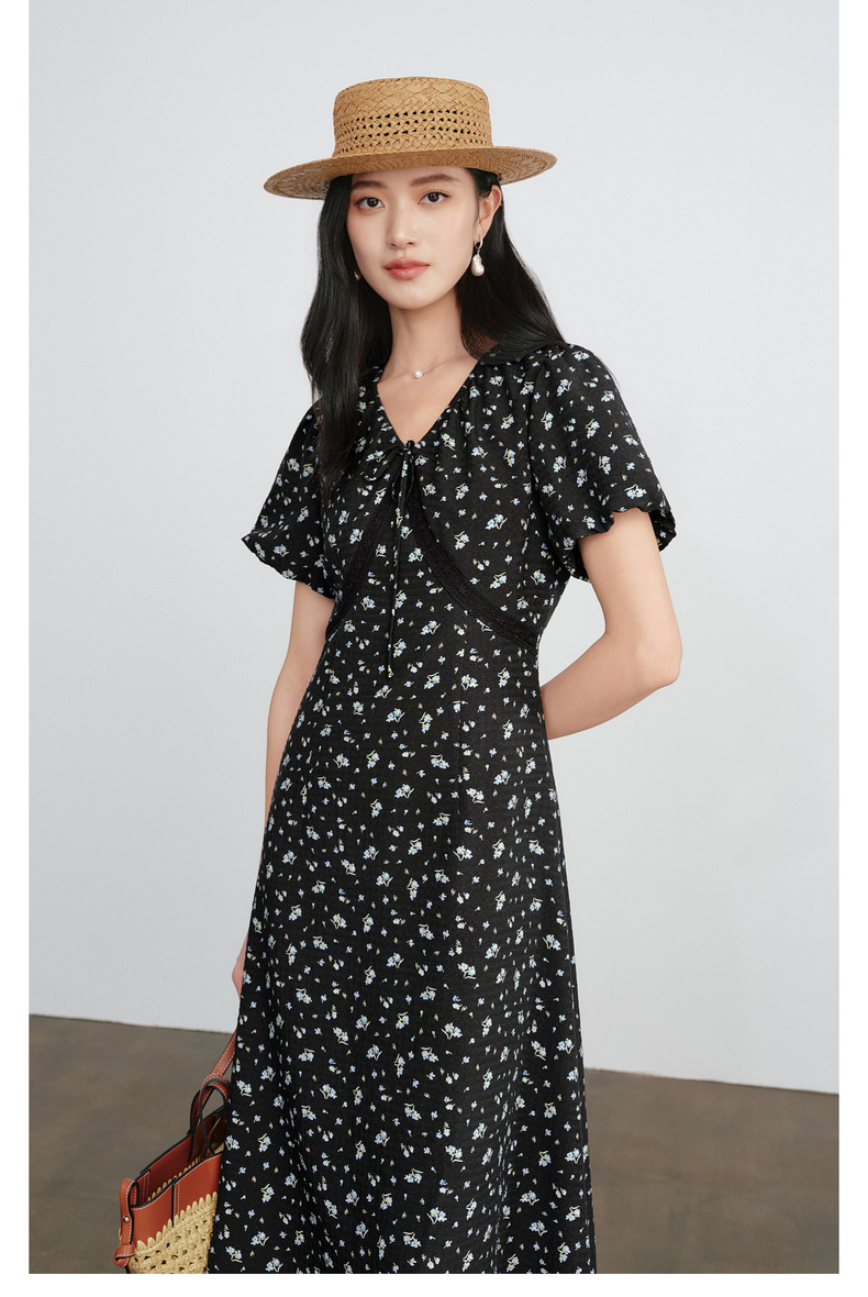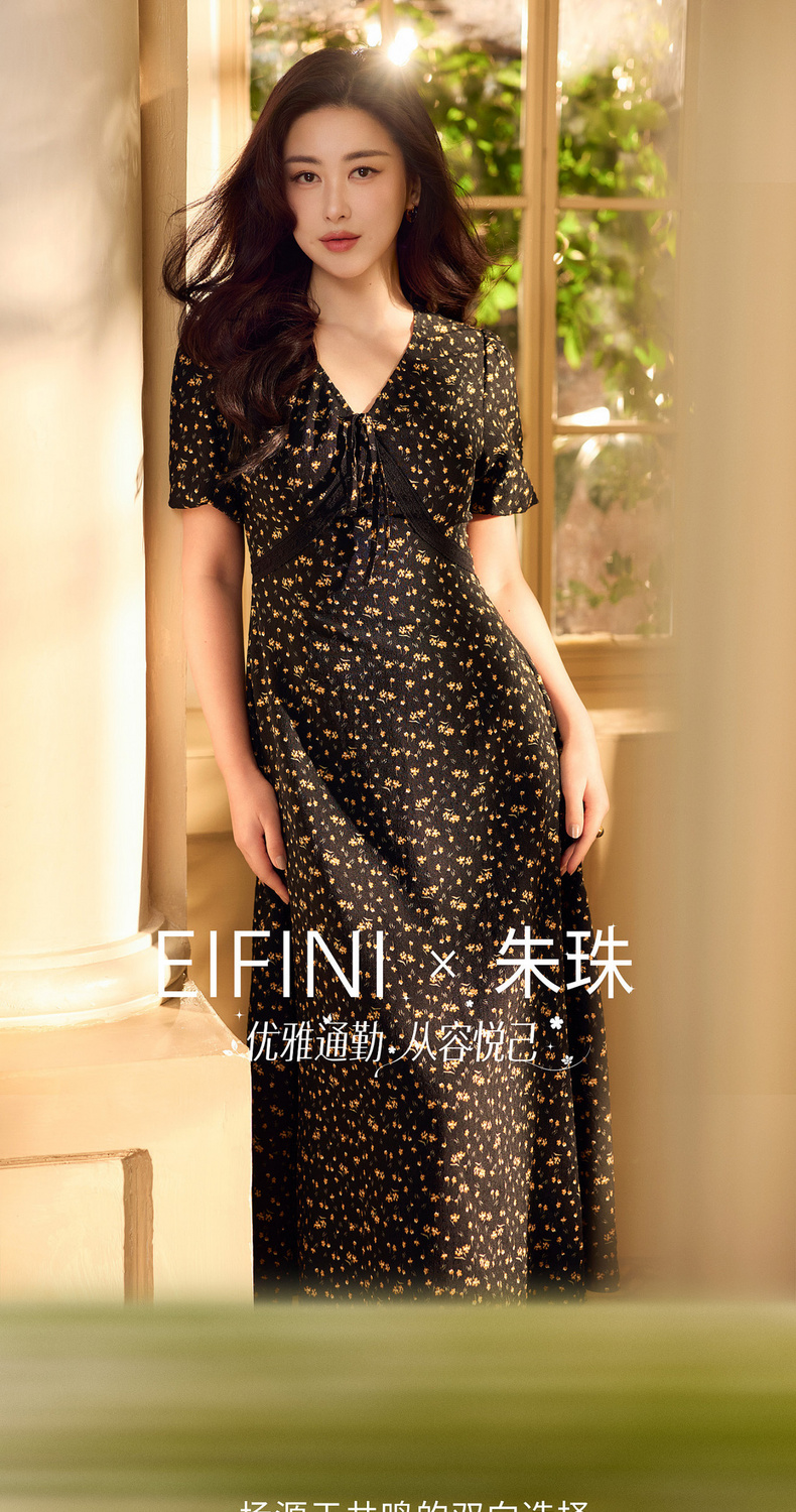 【严选】朱珠代言伊芙丽法式优雅收腰显瘦V领雪纺碎花连衣裙女2026新款1H4990511