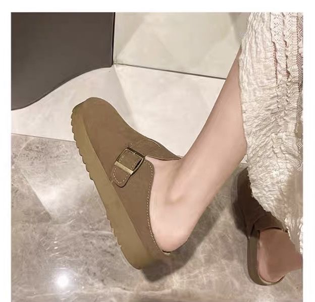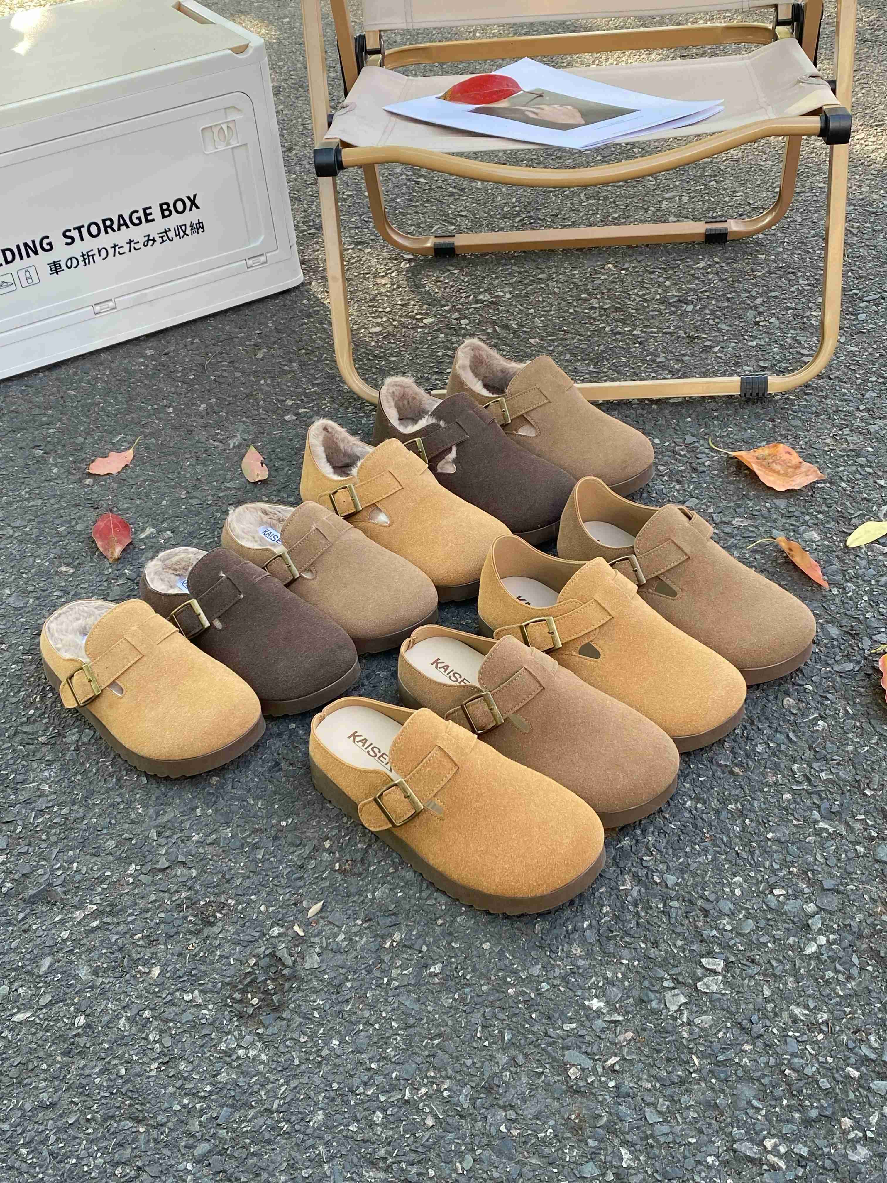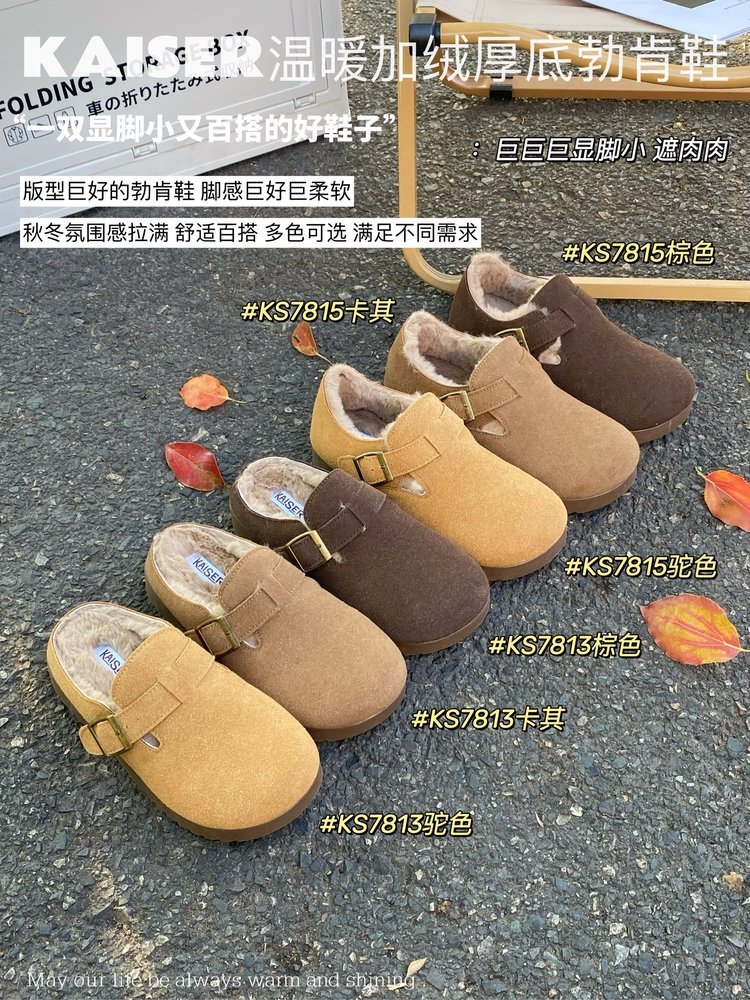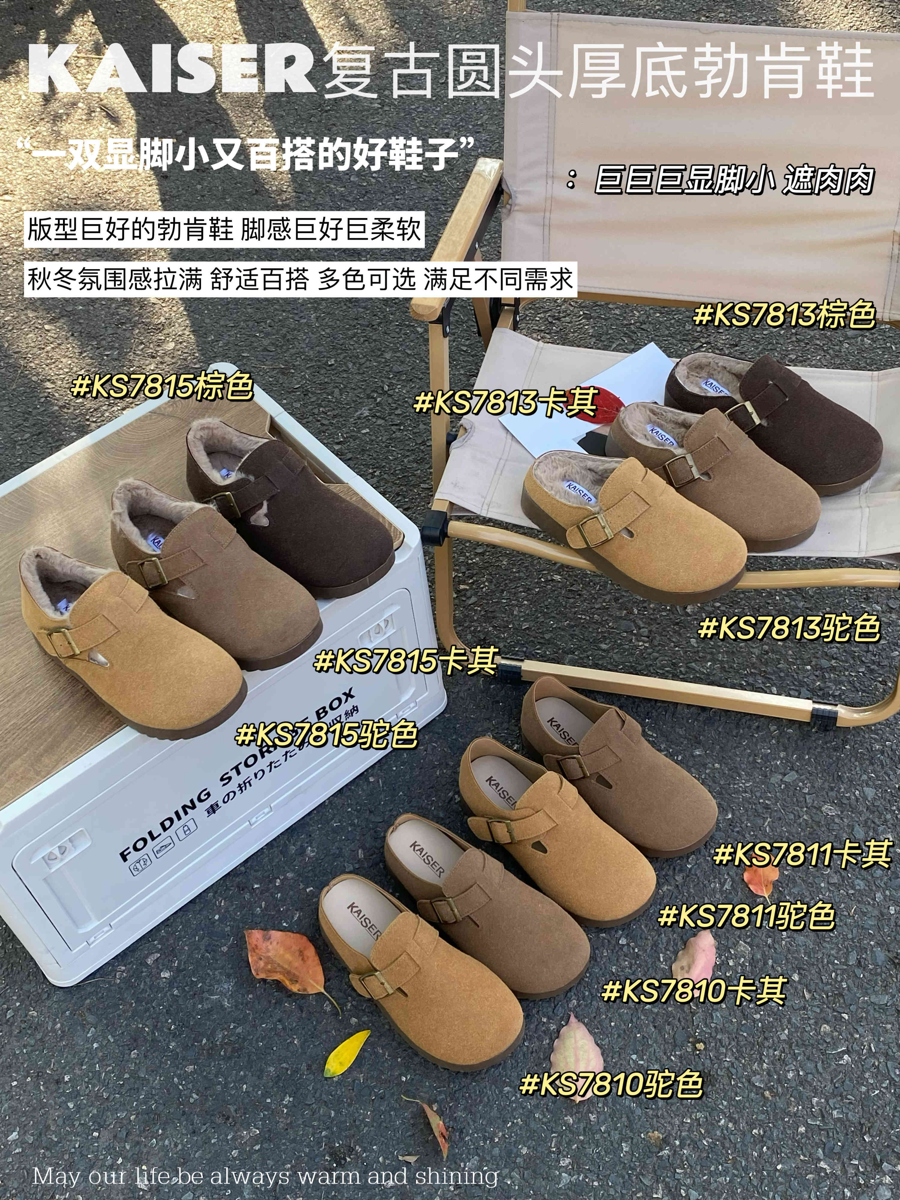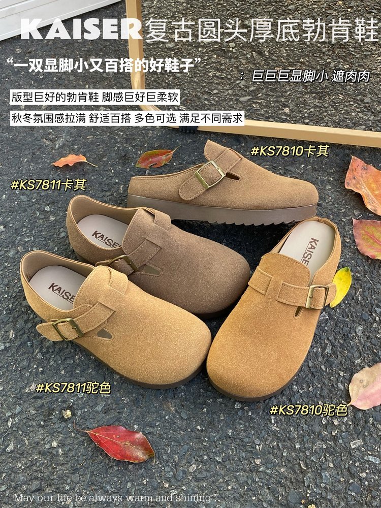 基础信息:型号:KS7810/KS7811颜色:驼色/卡其尺码:35-40(单鞋标准,包头半拖偏小一码)鞋面材质:磨砂绒(专业术语为合成革)鞋底材质:TPR跟高:约2.5cm左右