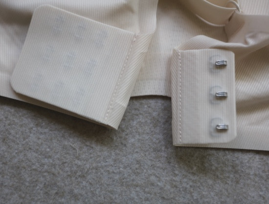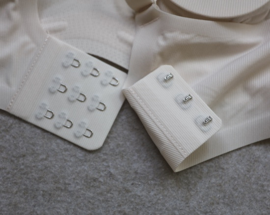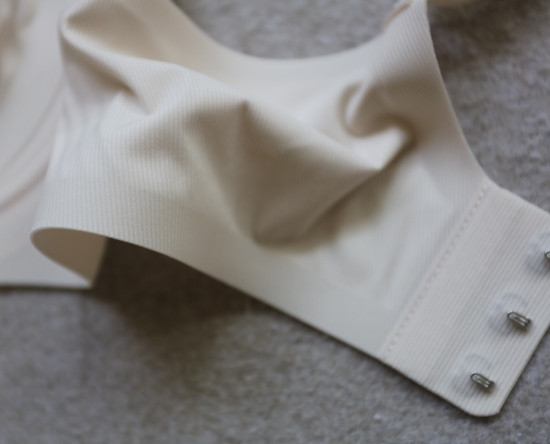 底边和整个外部轮廓 则是一片式点胶 后背扣是三排三扣 衔接处 缝线加固