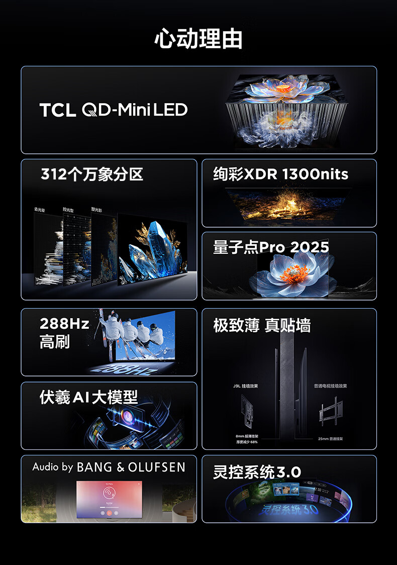 【2025新品】TCL电视75J9L 75英寸 超薄QD-MiniLED电视 全通道288Hz 4+64GB 超薄一体化 灵控系统3.0 一级能效