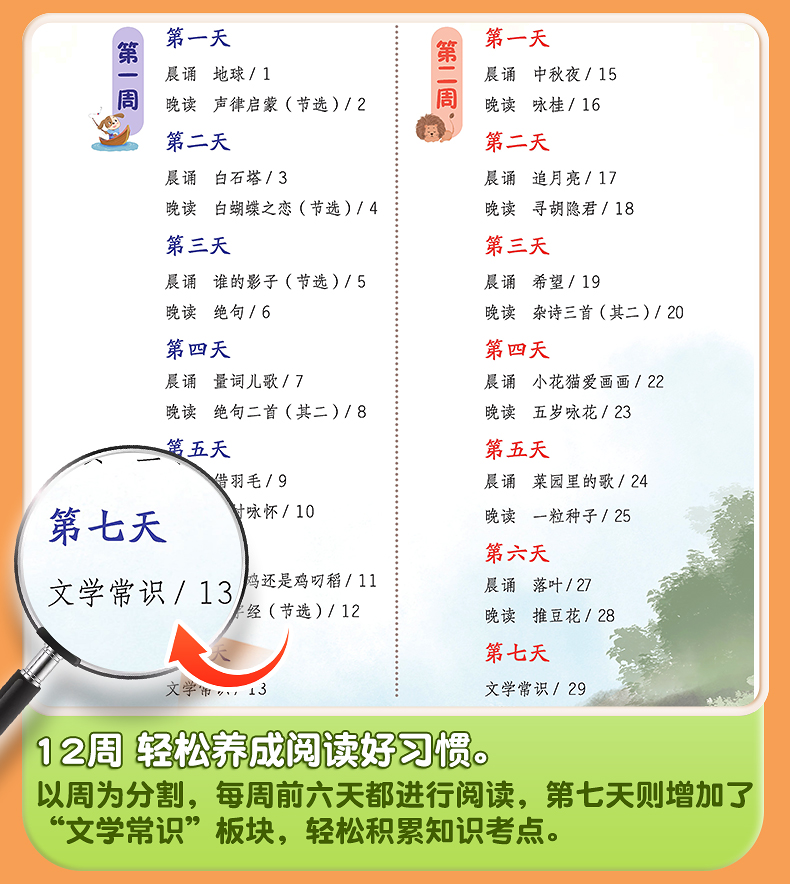 以周为分割,每周前六天都进行各种不同题材的阅读,第七天则设置“文学常识”板块,轻松积累常考考点。
