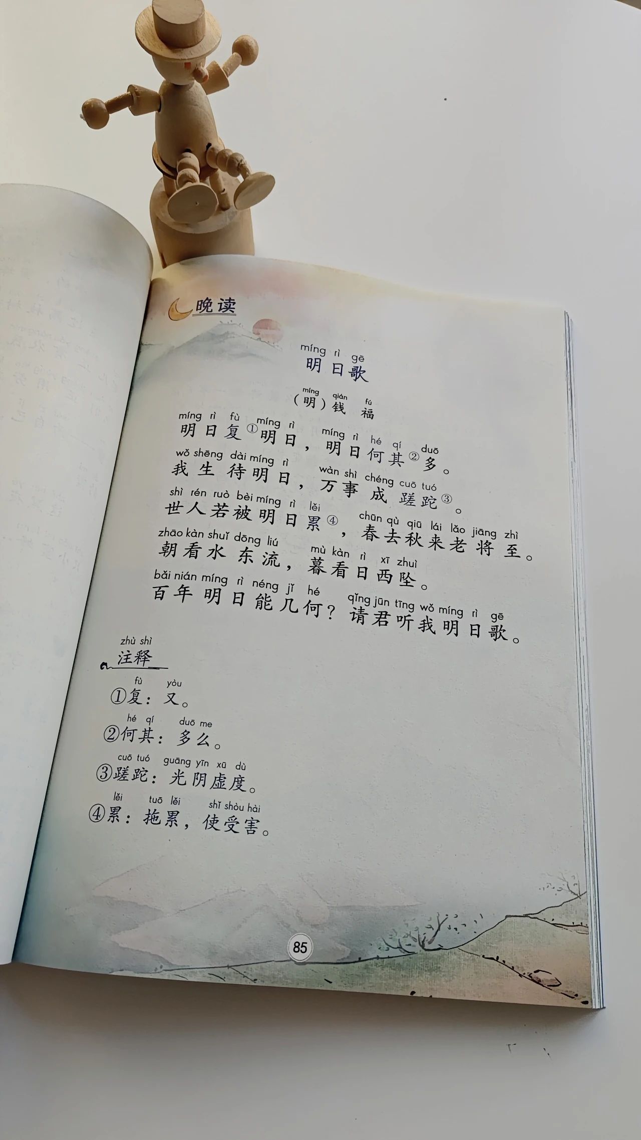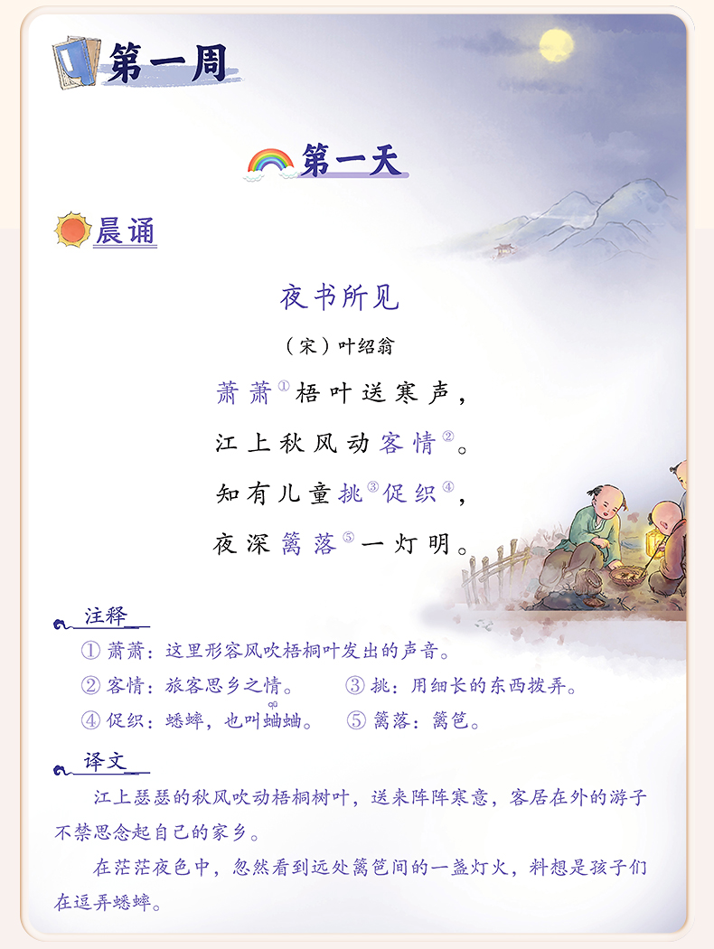 ✅1-2年级的内容较简单,全书注音,主要选择的是朗朗上口的古诗词、儿歌、童谣等,文章篇幅较短;