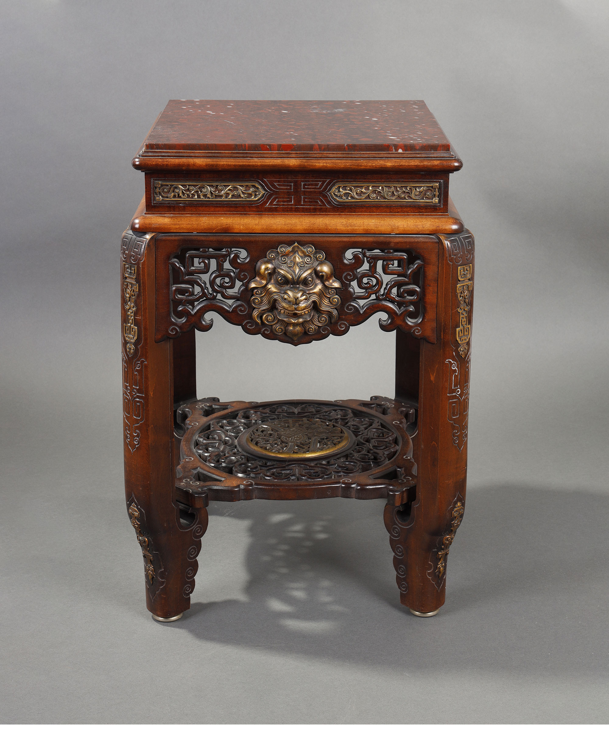 19世纪末中国出品瑞兽主题铜鎏金装饰镂雕祥云纹实木嵌大理石面小几