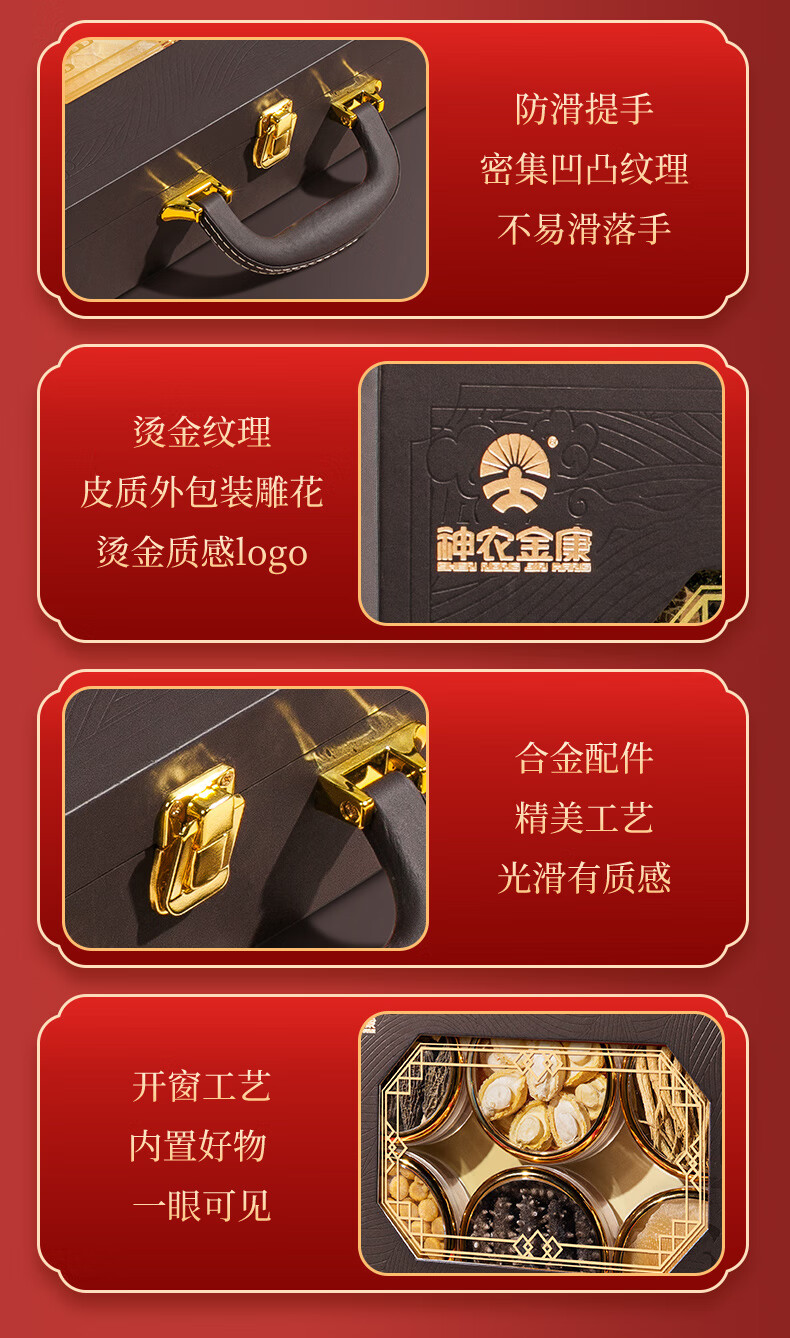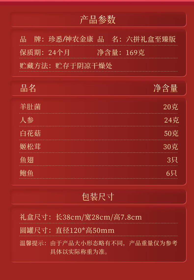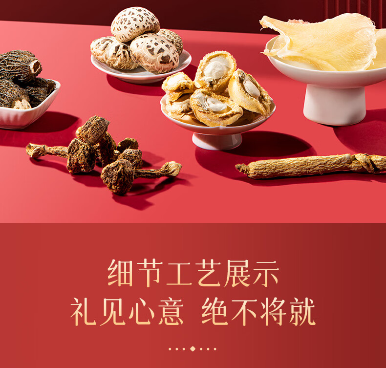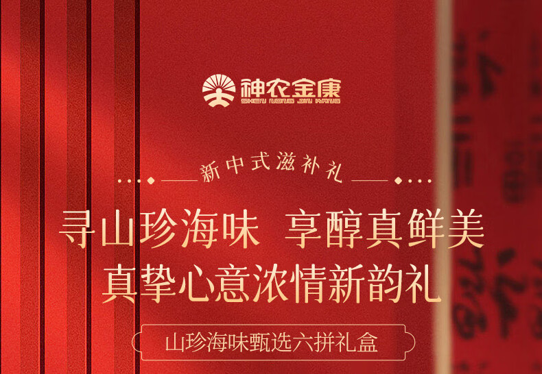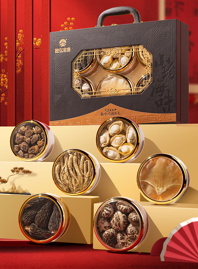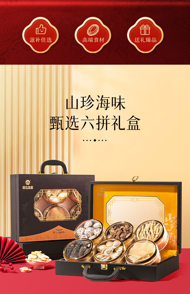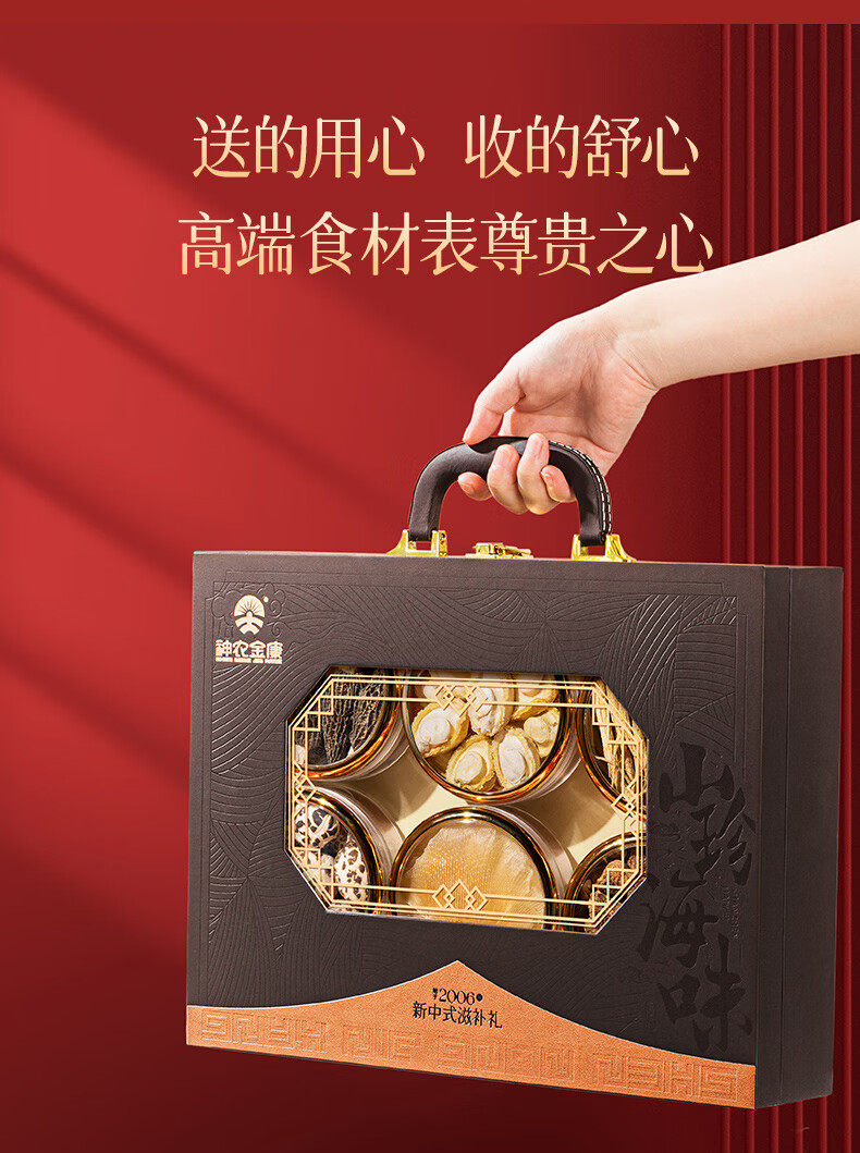 【中秋礼盒】神农金康 人参鲍鱼鱼翅羊肚菌姬松茸百花菇 皮质六拼山珍海味礼盒169g 新中式滋补礼 原生态真滋补喝护家人健康