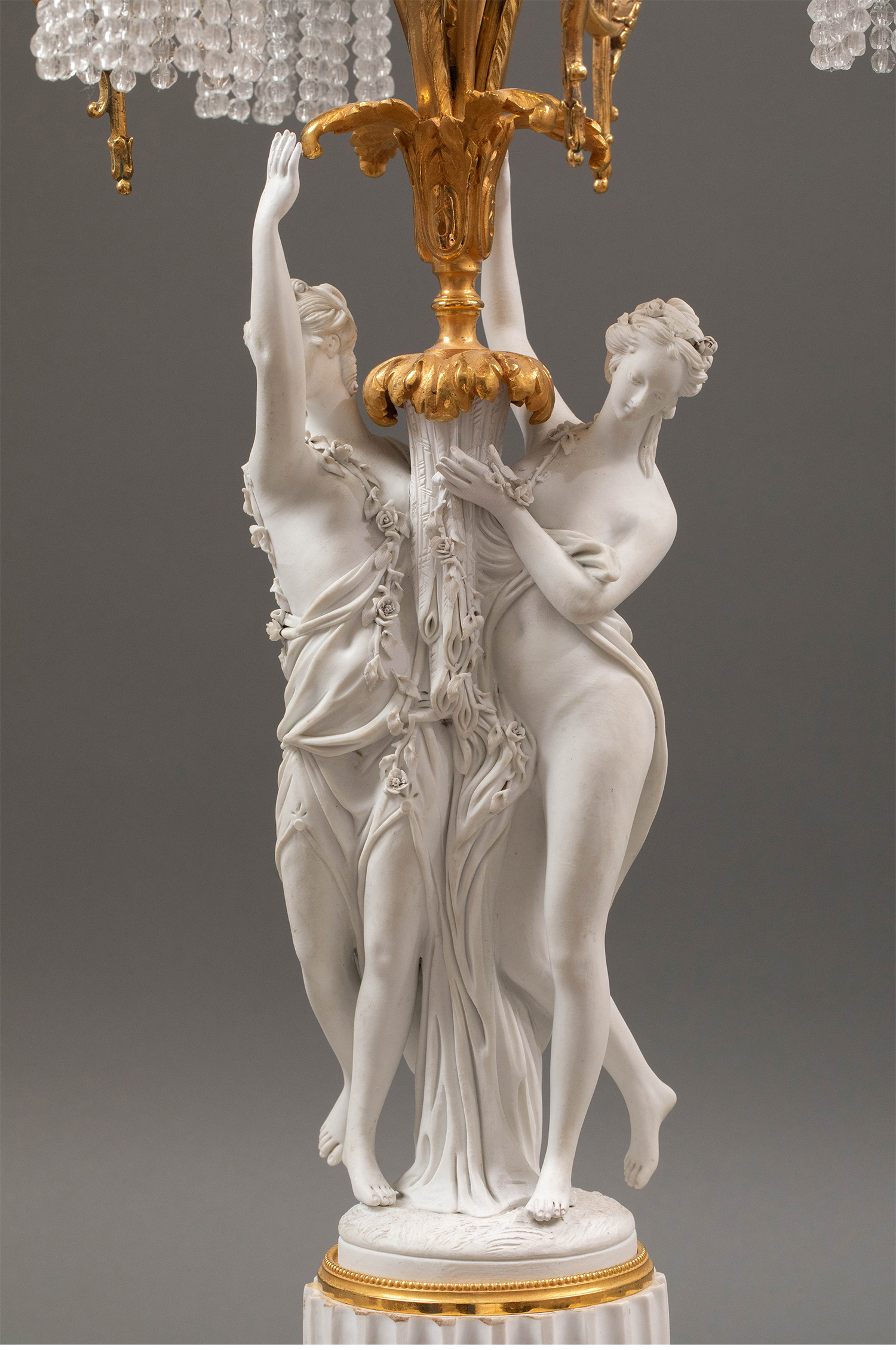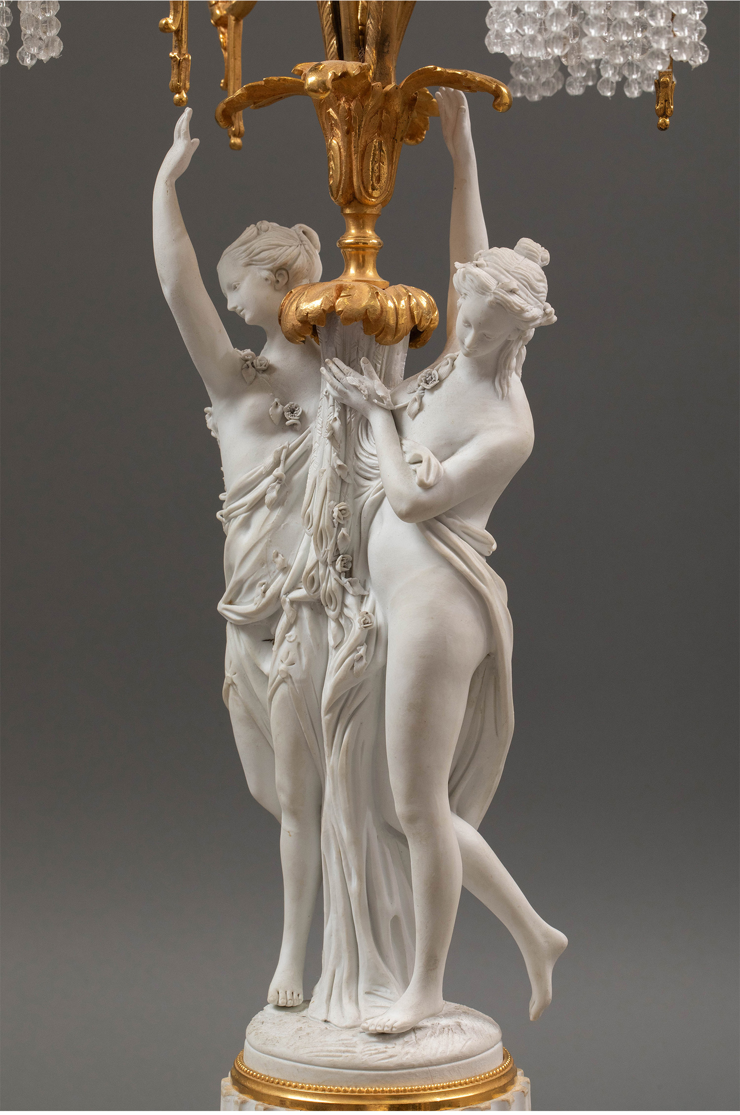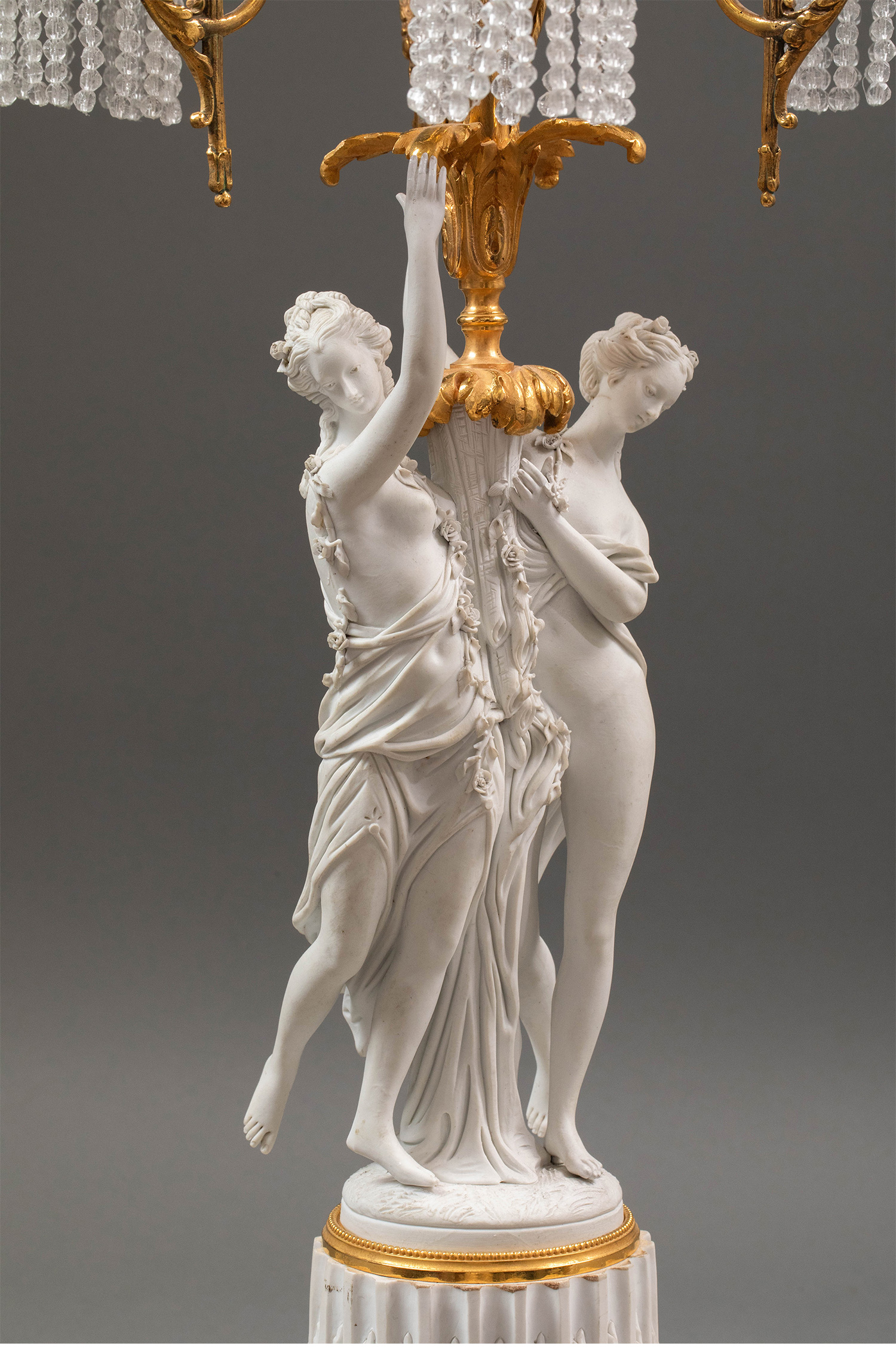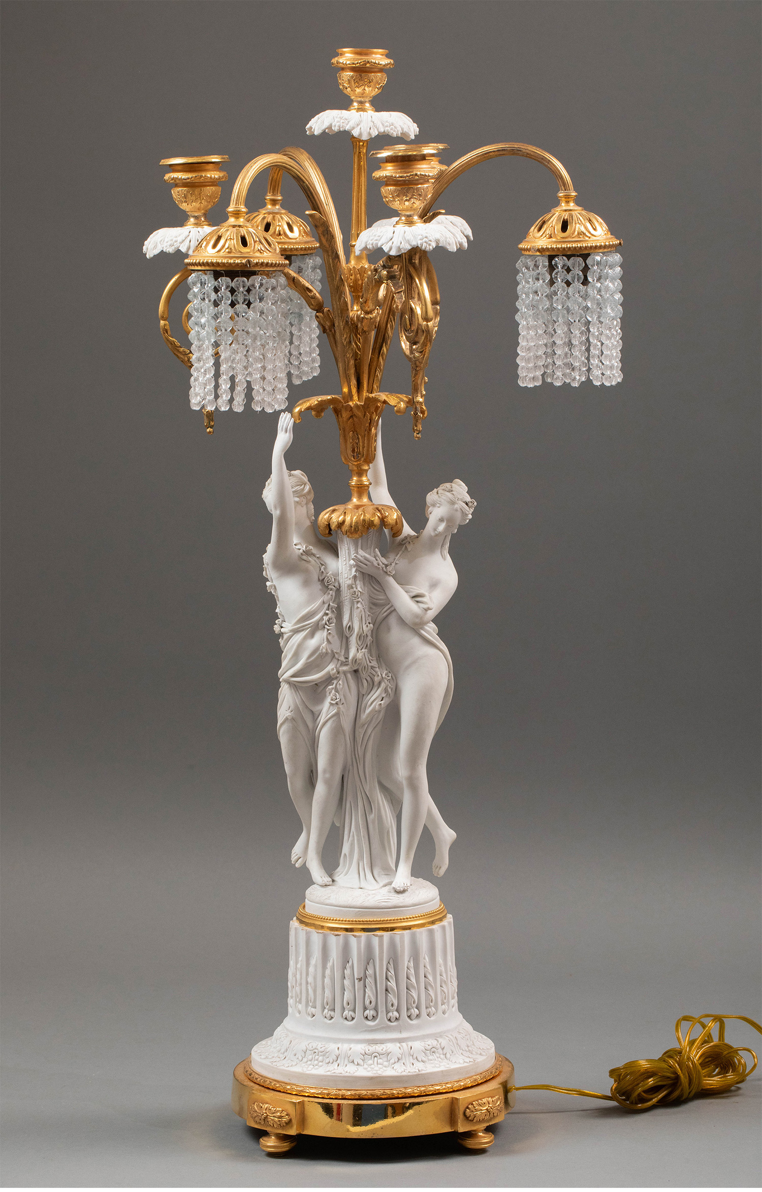 19世纪法国出品卷叶纹铜鎏金精雕装饰古典女神主题素胎瓷人物雕塑及水晶流苏灯罩三枝头台灯一对