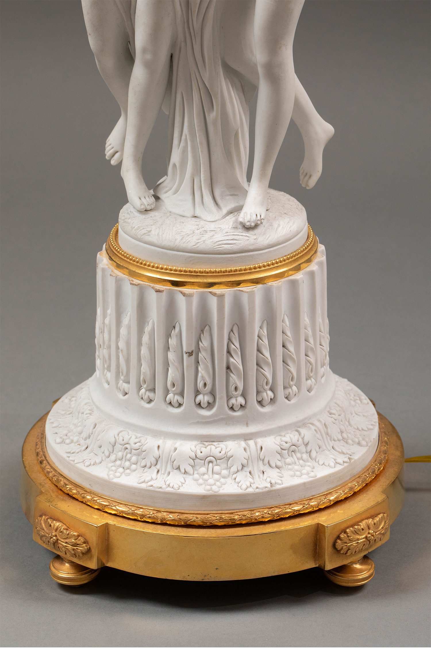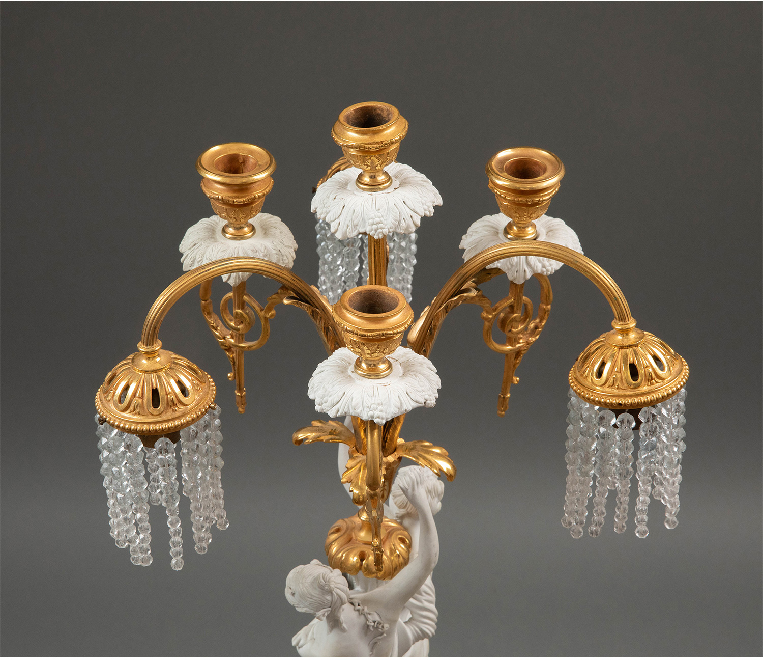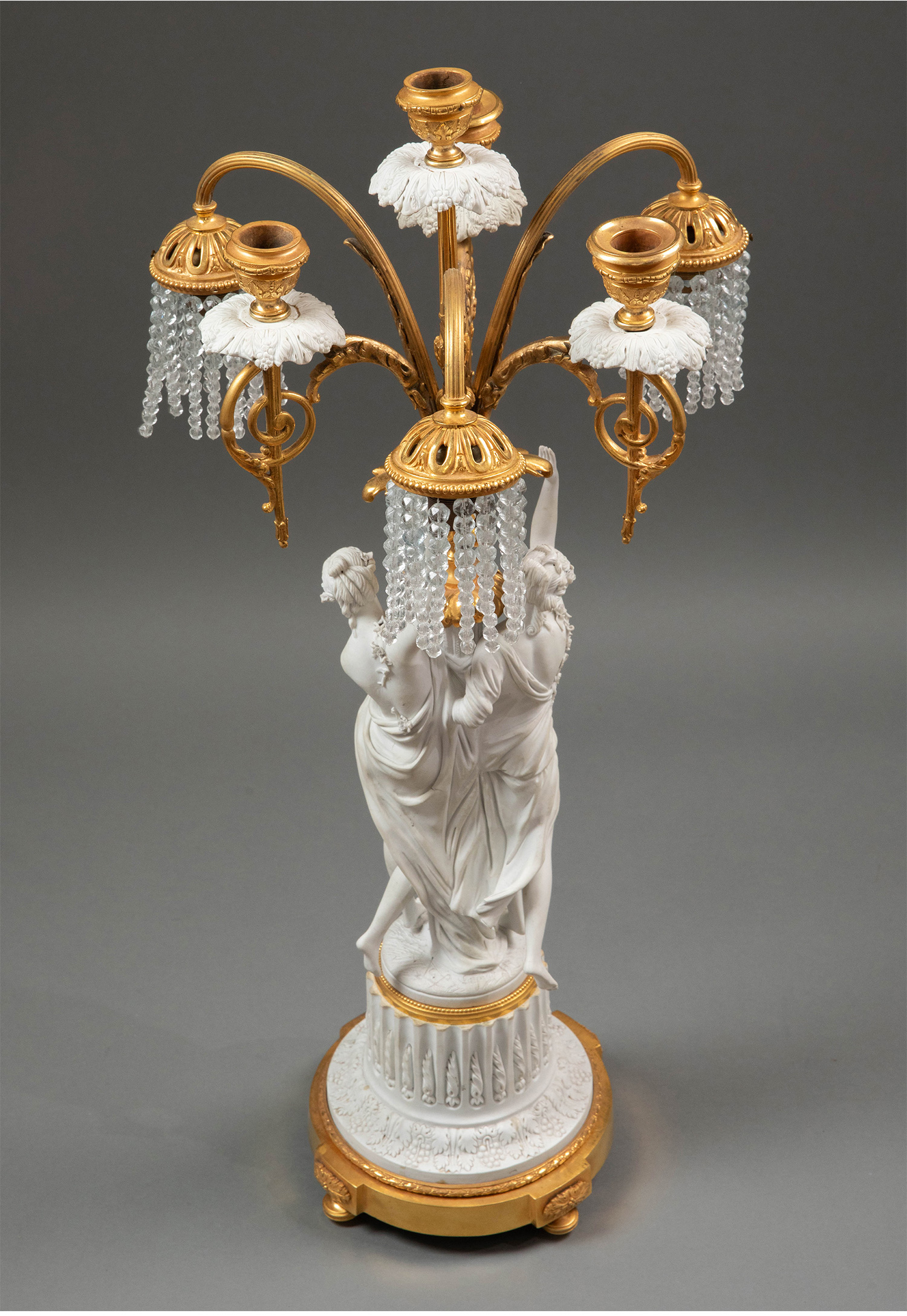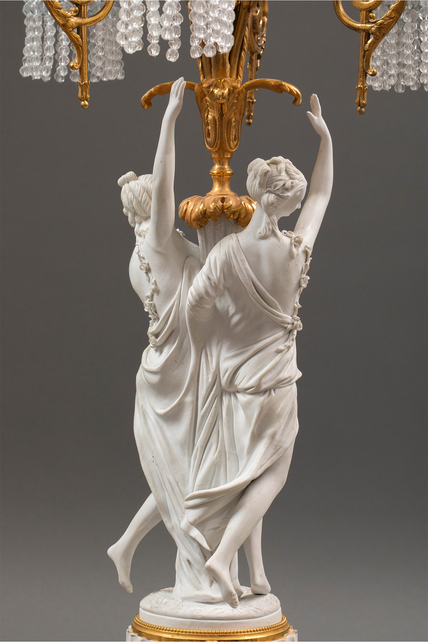19世纪法国出品卷叶纹铜鎏金精雕装饰古典女神主题素胎瓷人物雕塑及水晶流苏灯罩三枝头台灯一对