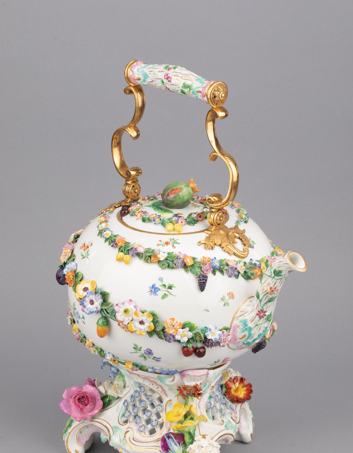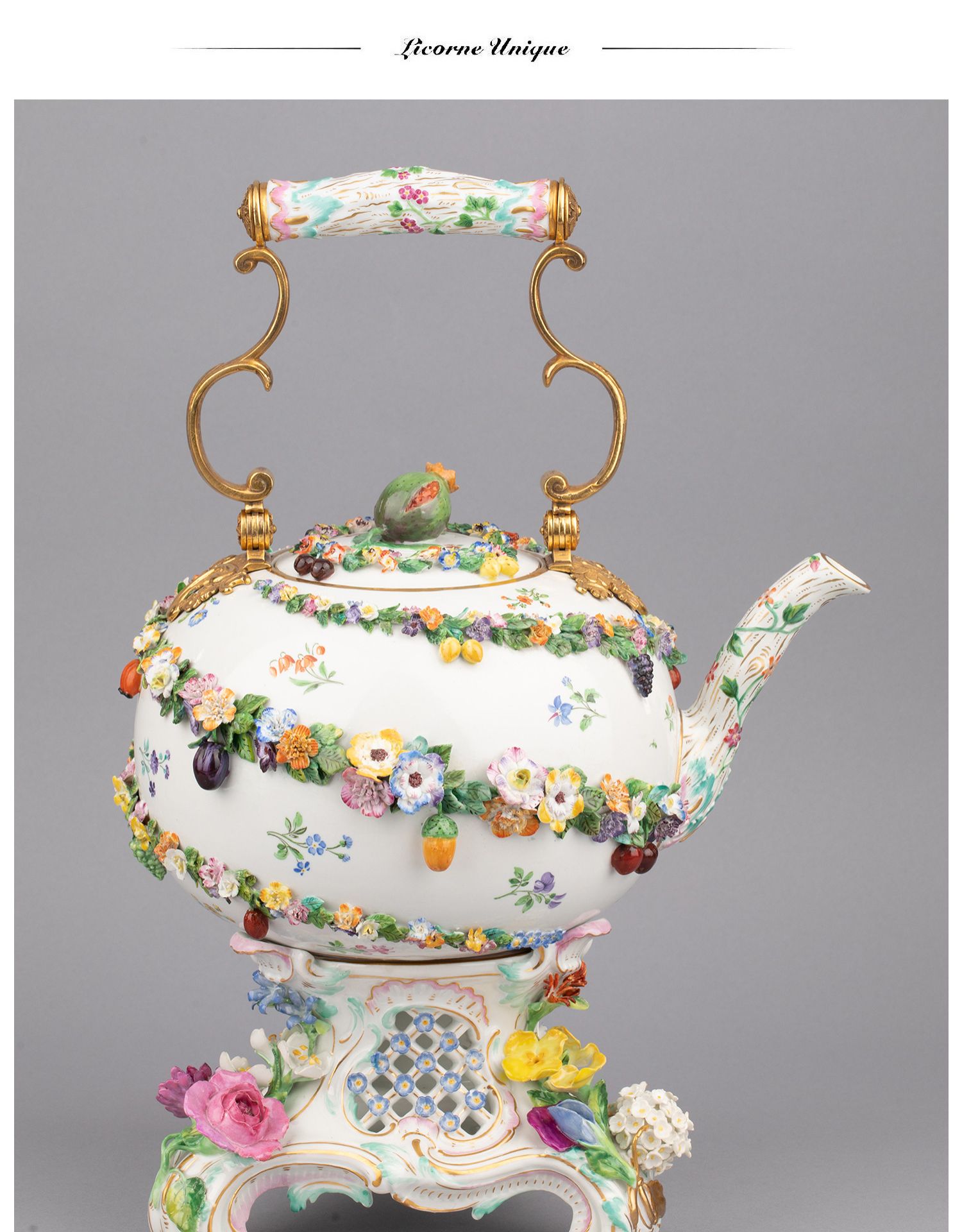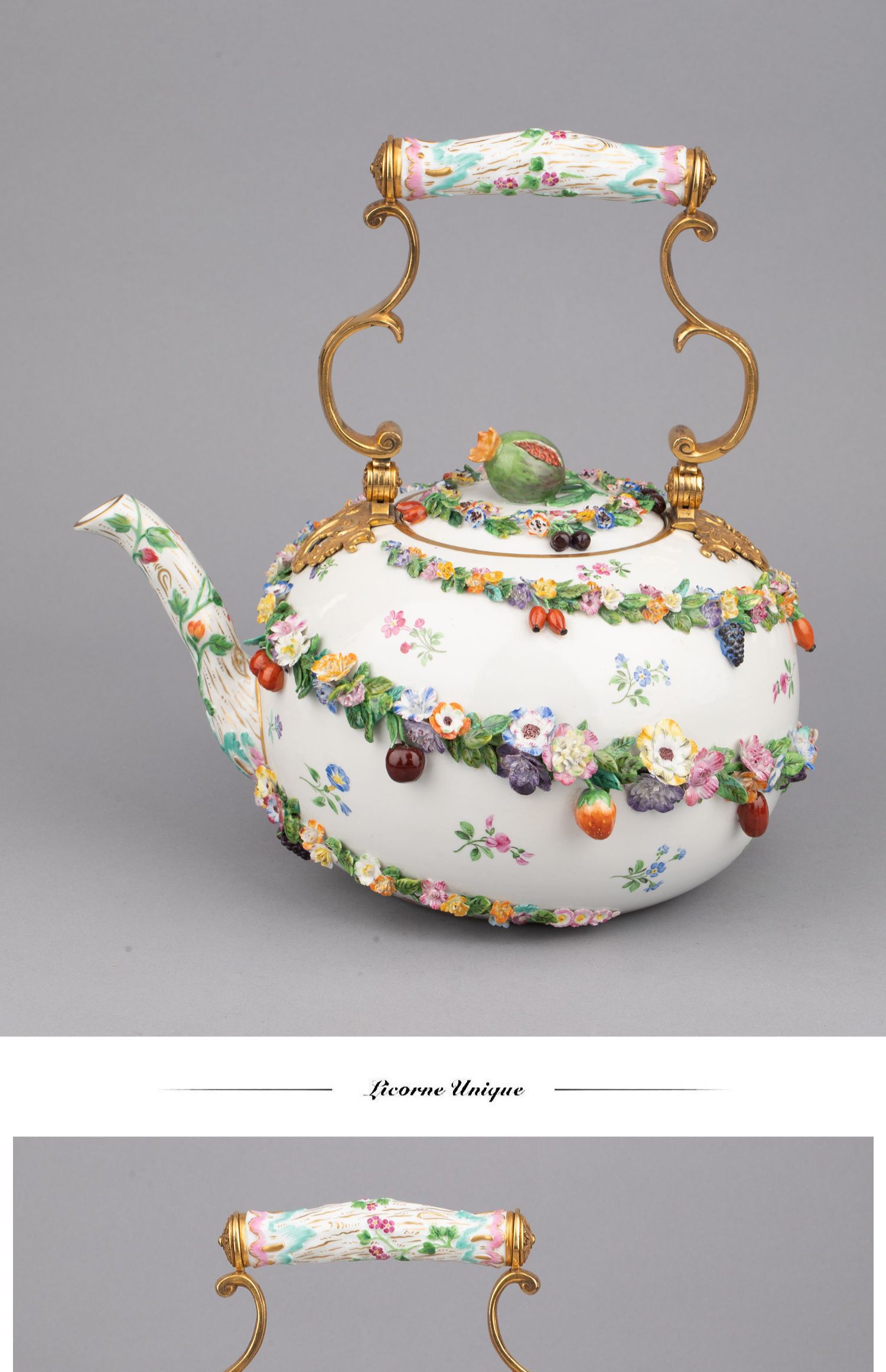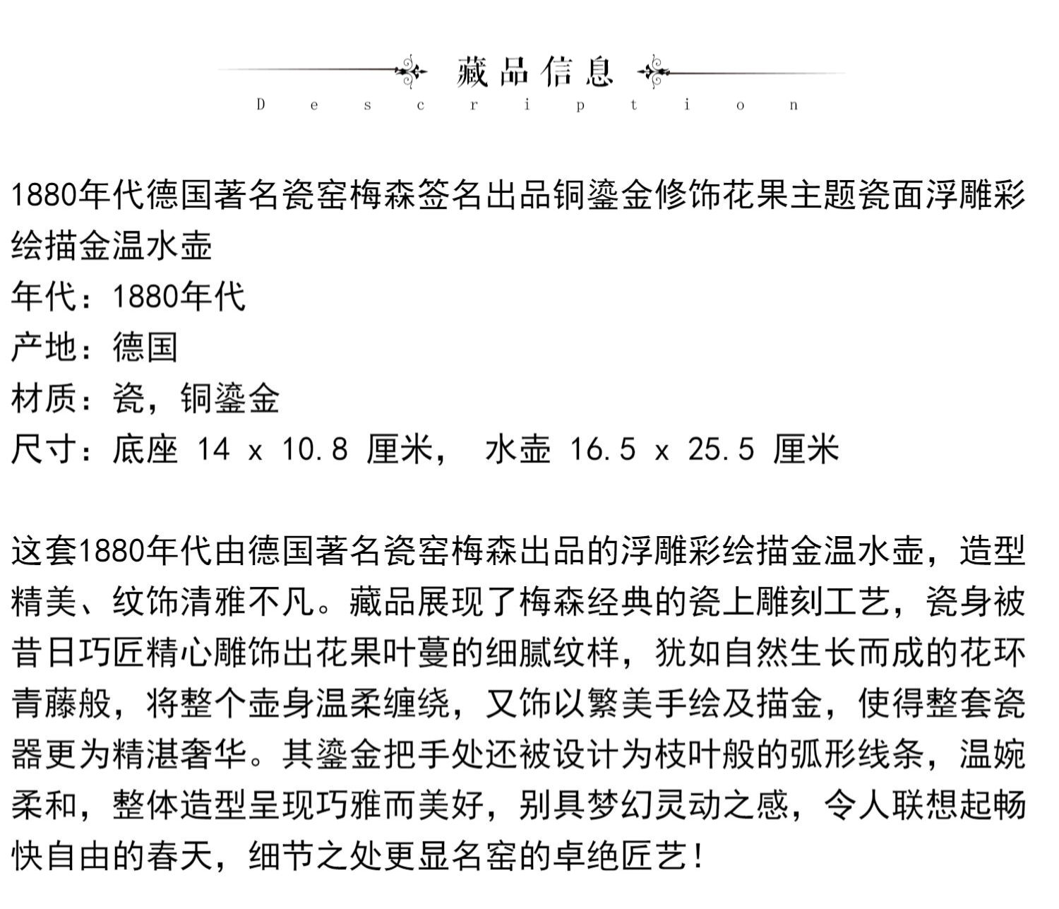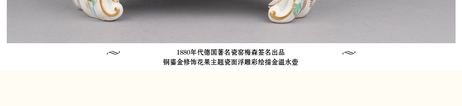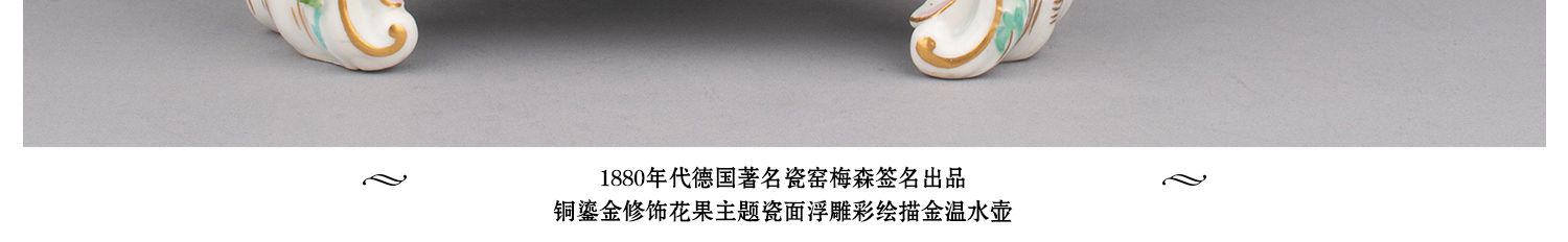 独角鹿西洋古董德国梅森瓷器铜鎏金花果瓷面浮雕彩绘描金温水壶