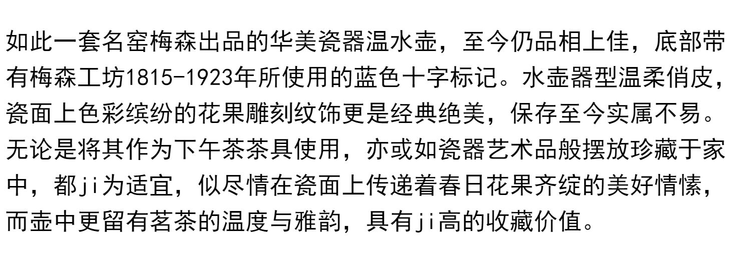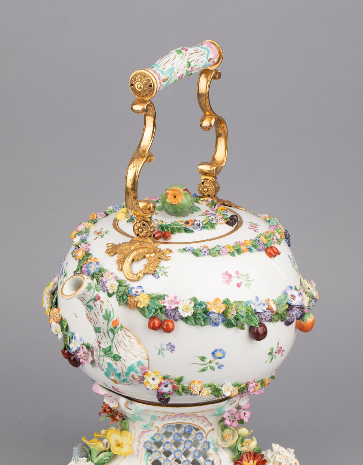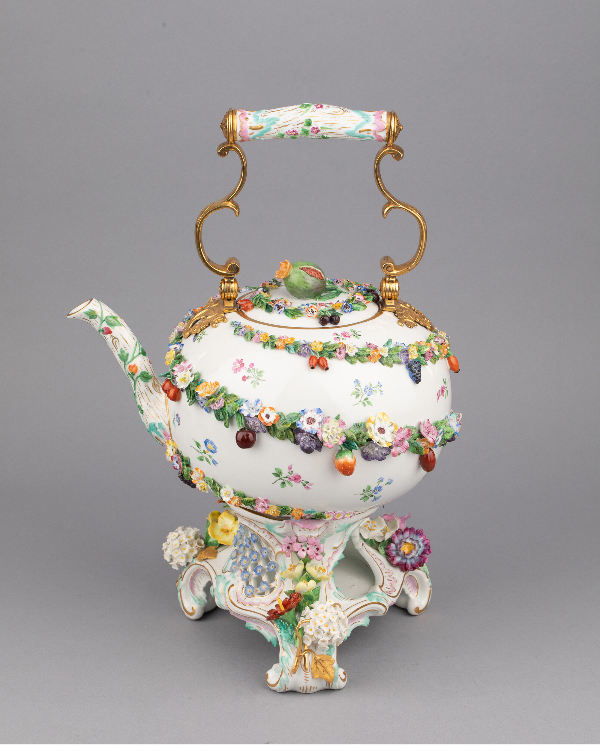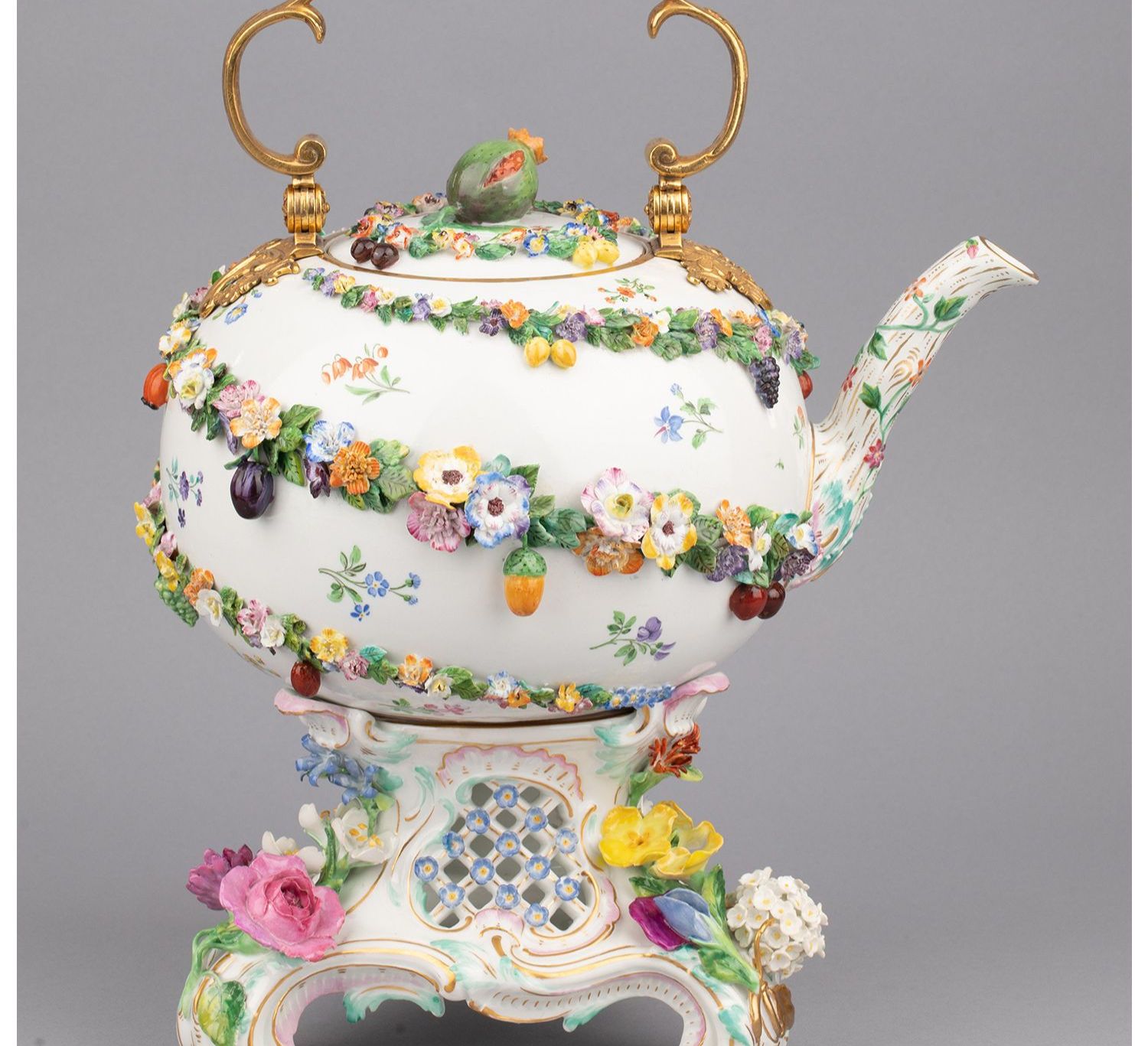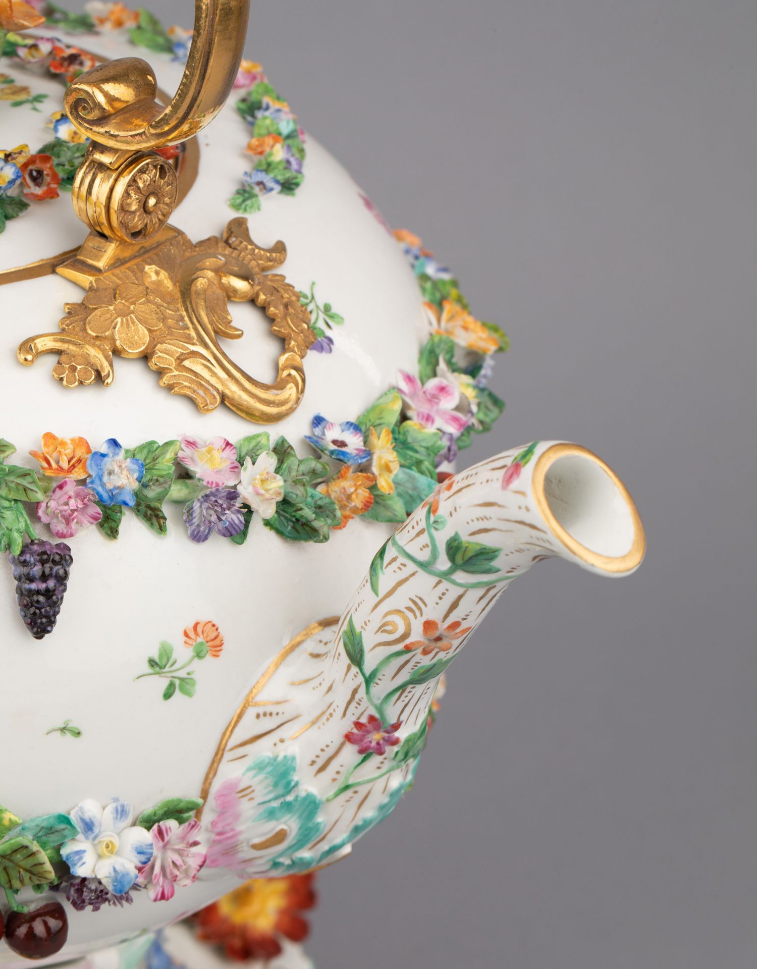 独角鹿西洋古董德国梅森瓷器铜鎏金花果瓷面浮雕彩绘描金温水壶