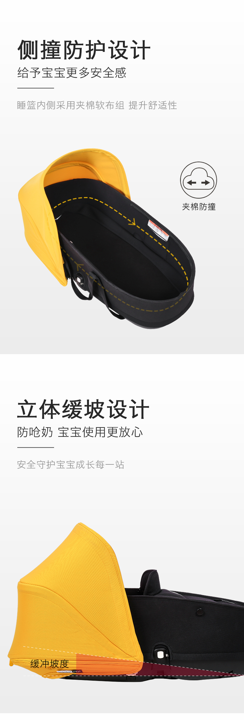 为Bugaboo Bee系列设计的新生儿睡篮,适用于0-6个月的宝宝,可以给宝宝提供更加舒适的睡眠环境和安全的保护。也可独立置于地面,作为独立小床使用。采用舒适柔软的面料,给新生儿提供安全舒适的睡眠环境,四种经典颜色,给妈妈们更多的搭配选择。