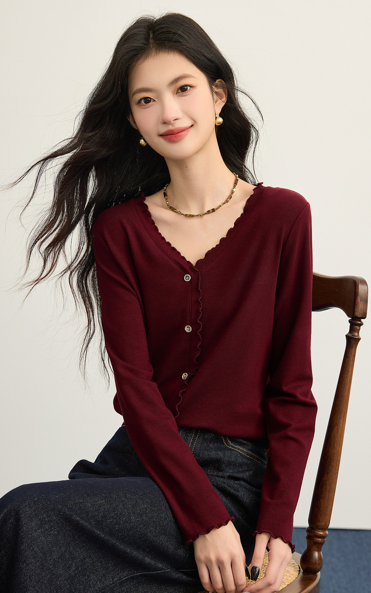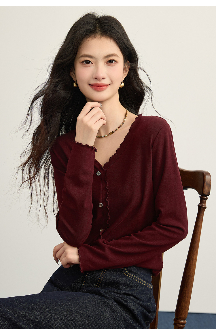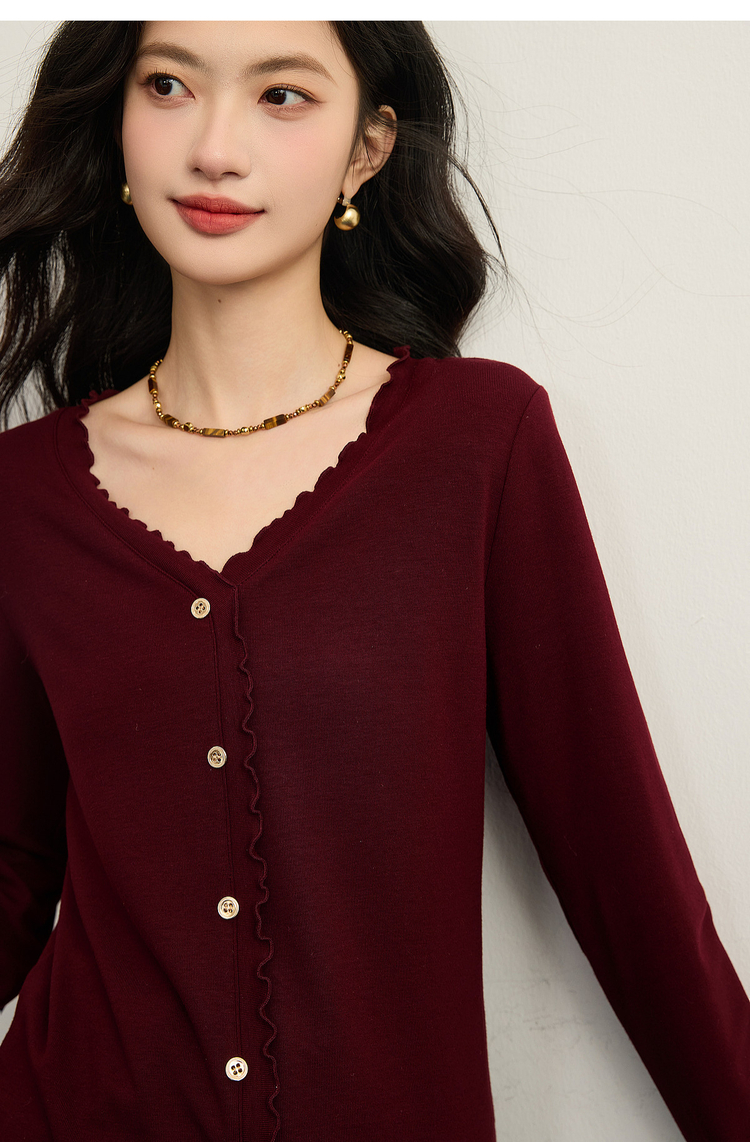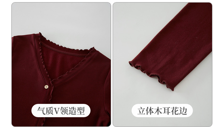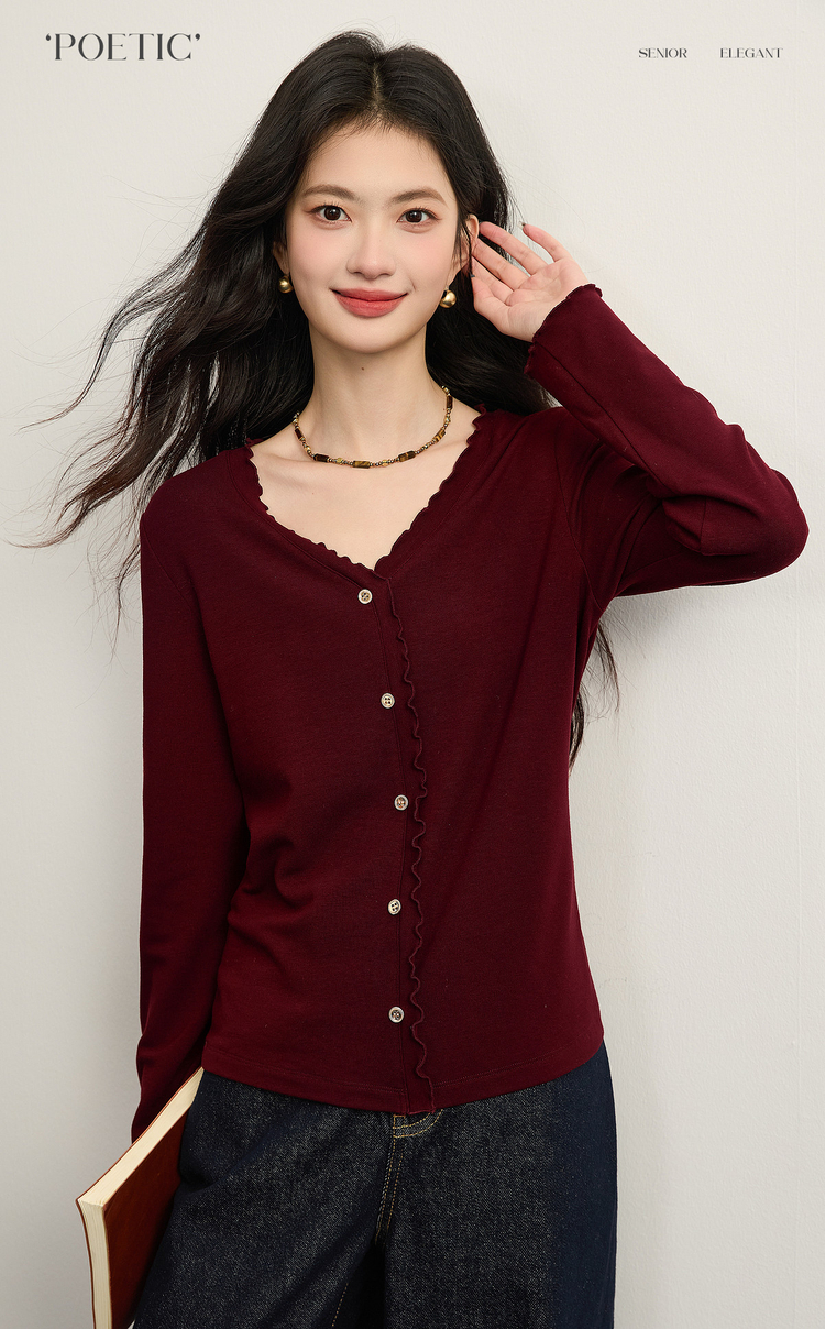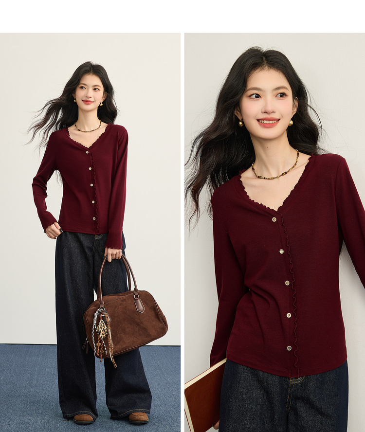 【周末秒杀】熙世界法式木耳边V领红色针织衫女2025秋冬内里磨绒套头毛衫上衣
