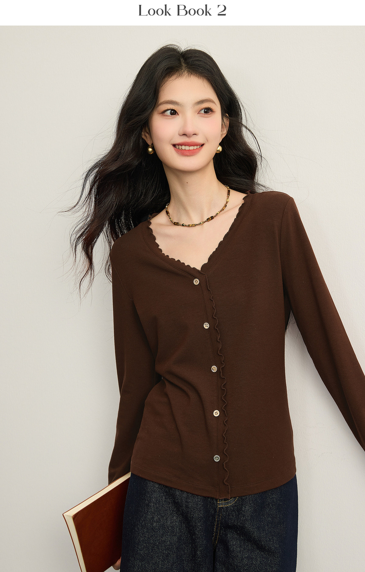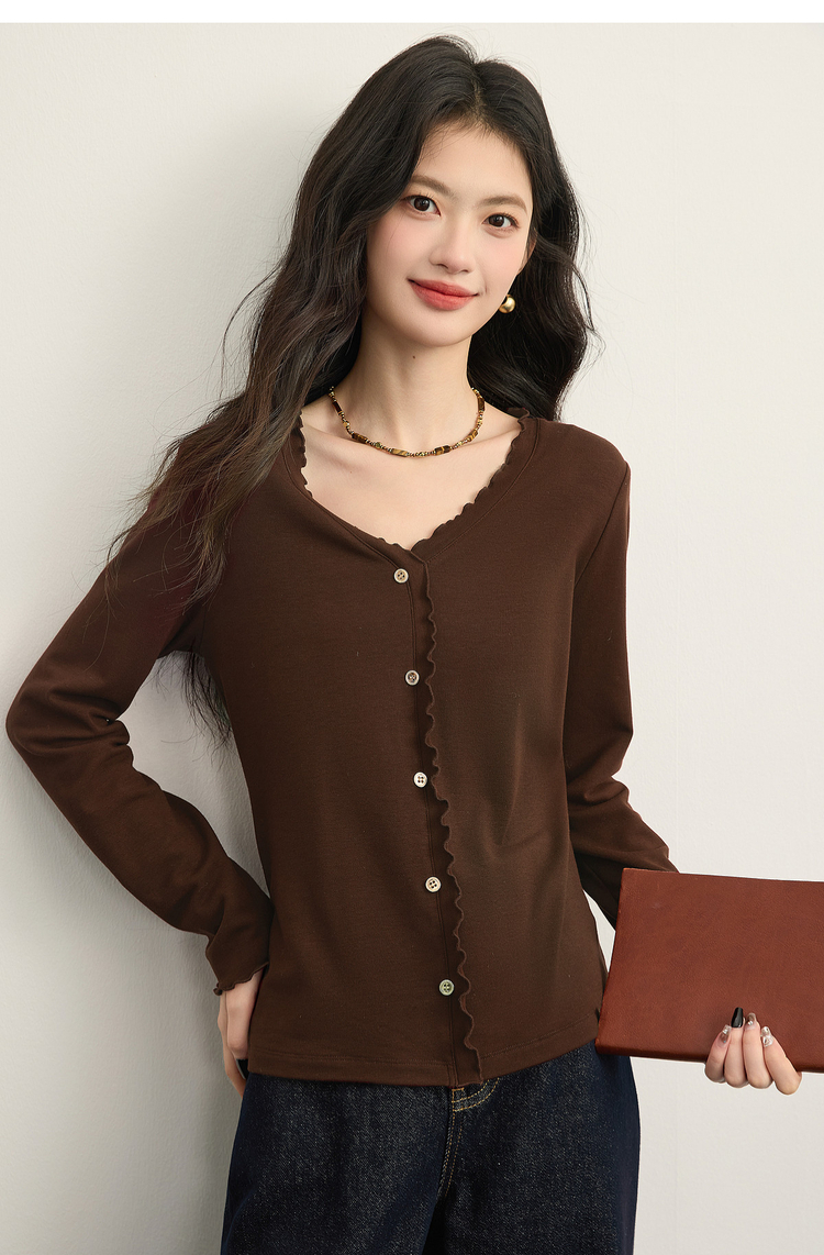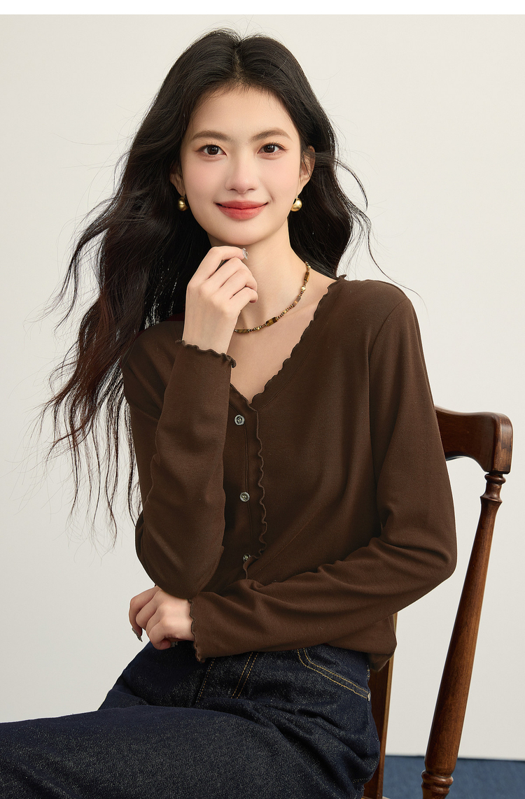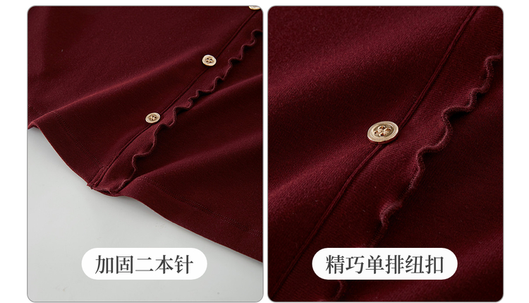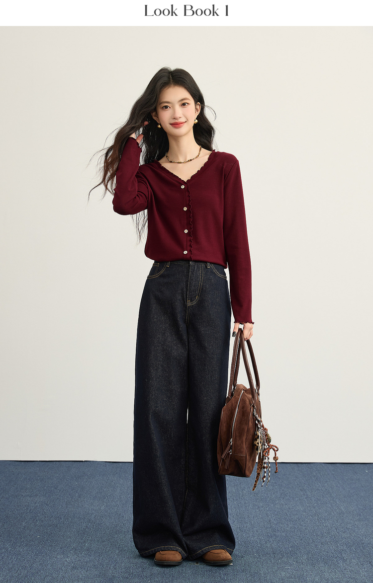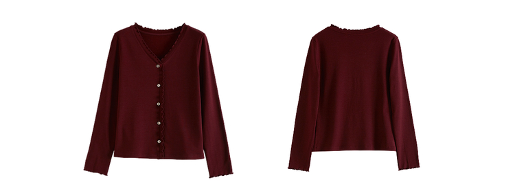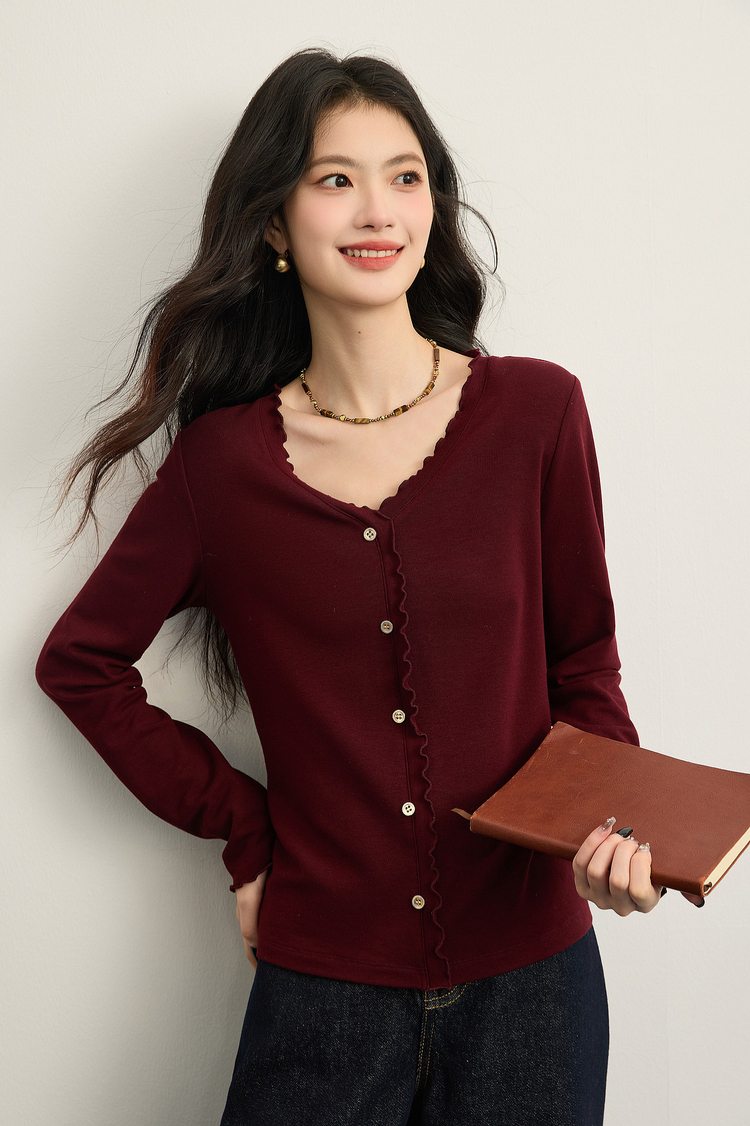 【周末秒杀】熙世界法式木耳边V领红色针织衫女2025秋冬内里磨绒套头毛衫上衣
