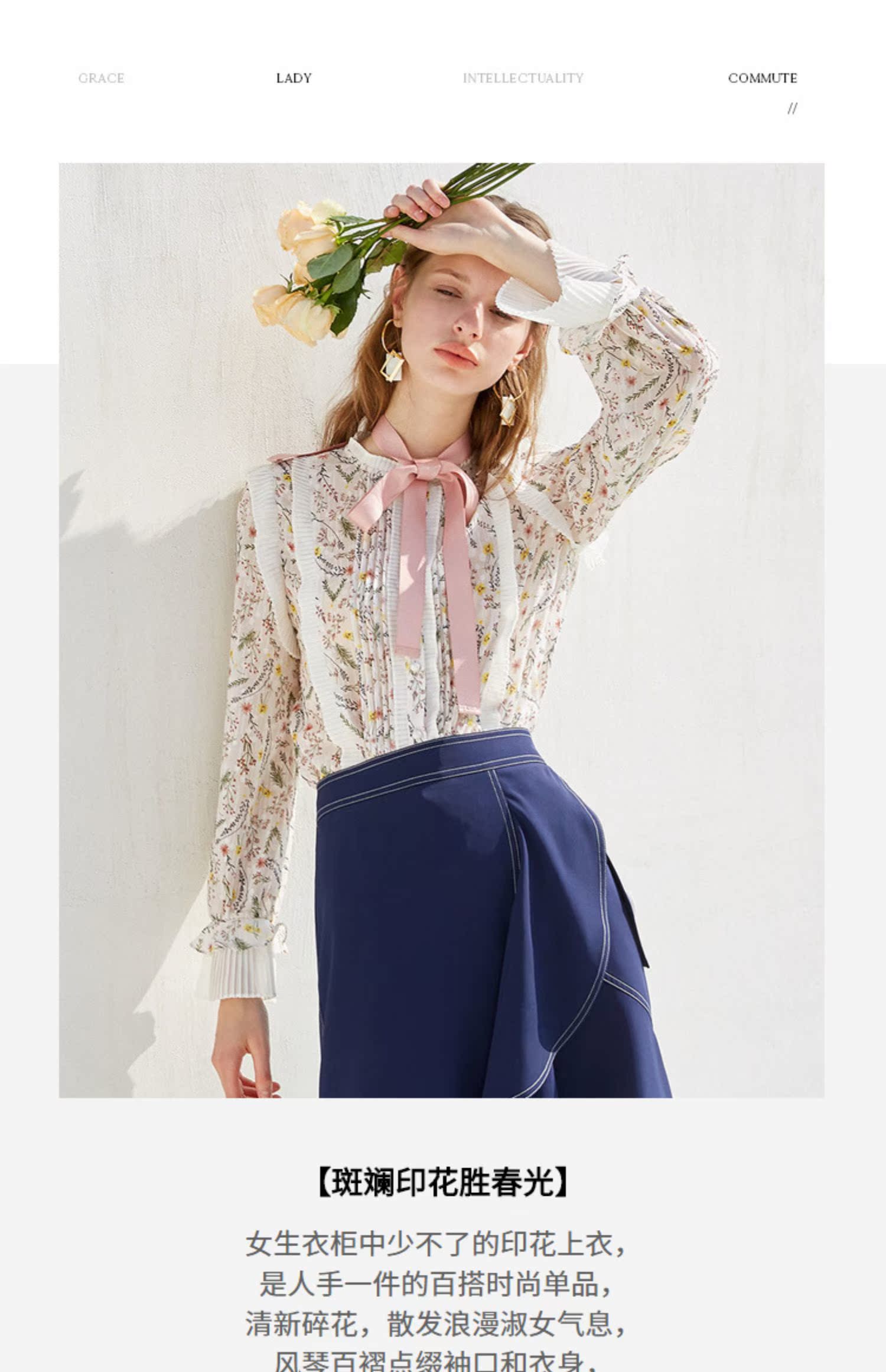 欧芮儿2022春装新款长袖碎花雪纺衫女时尚复古百搭蝴蝶结蕾丝衫