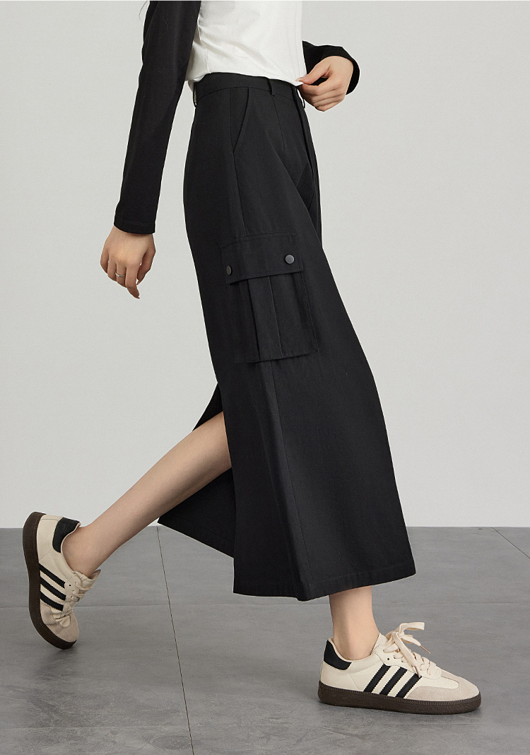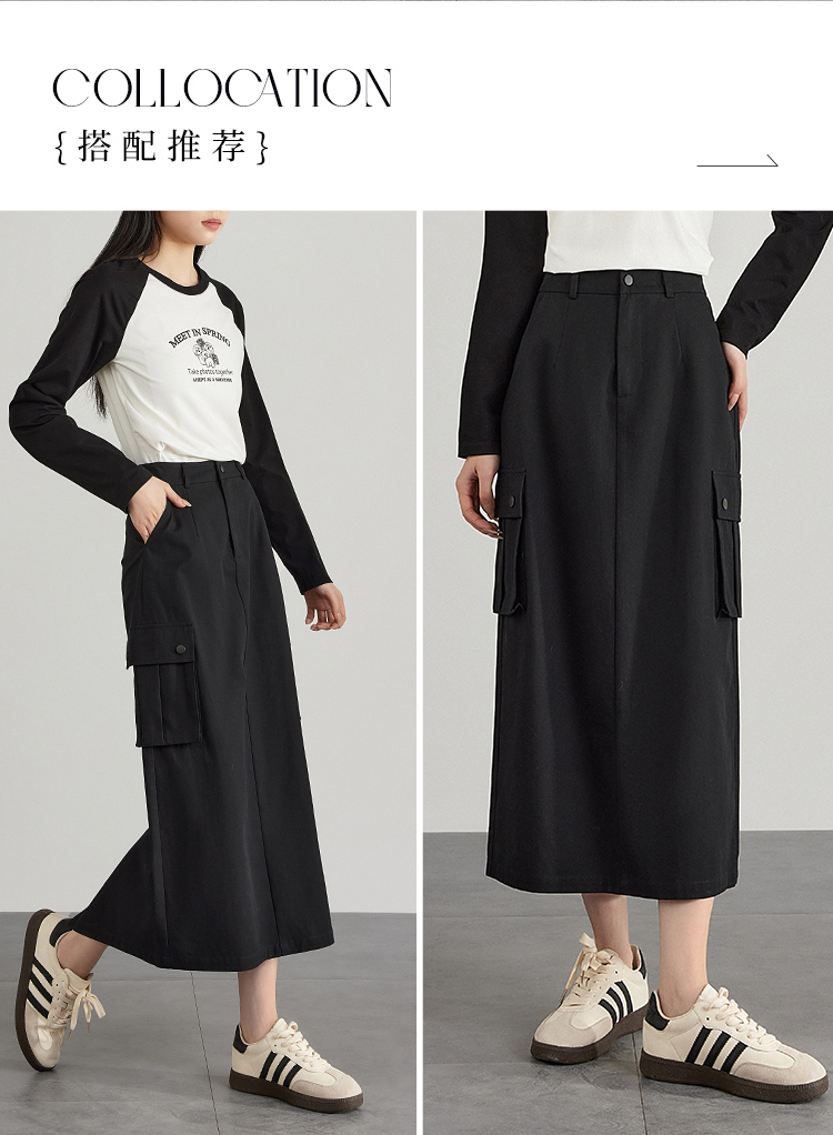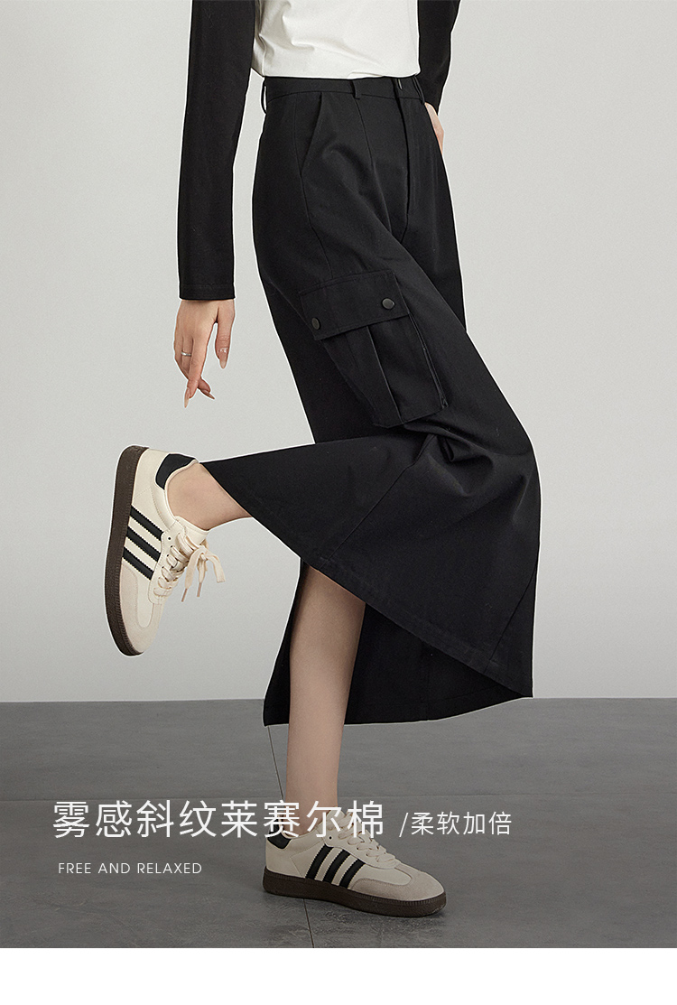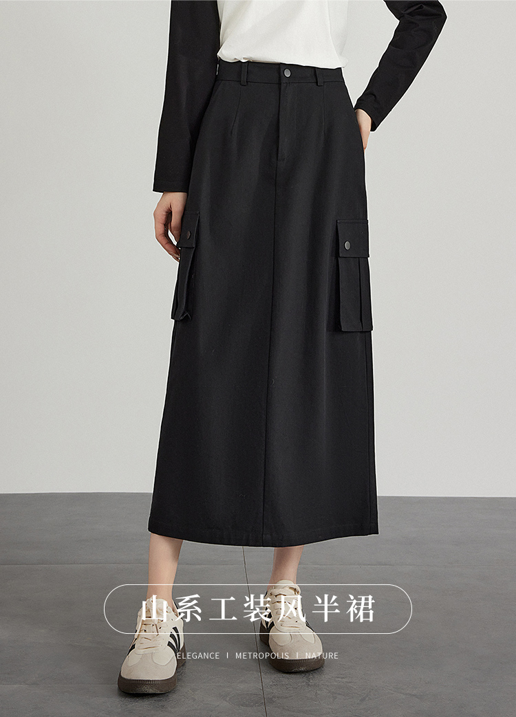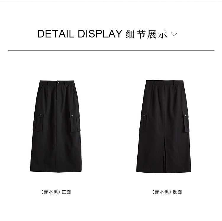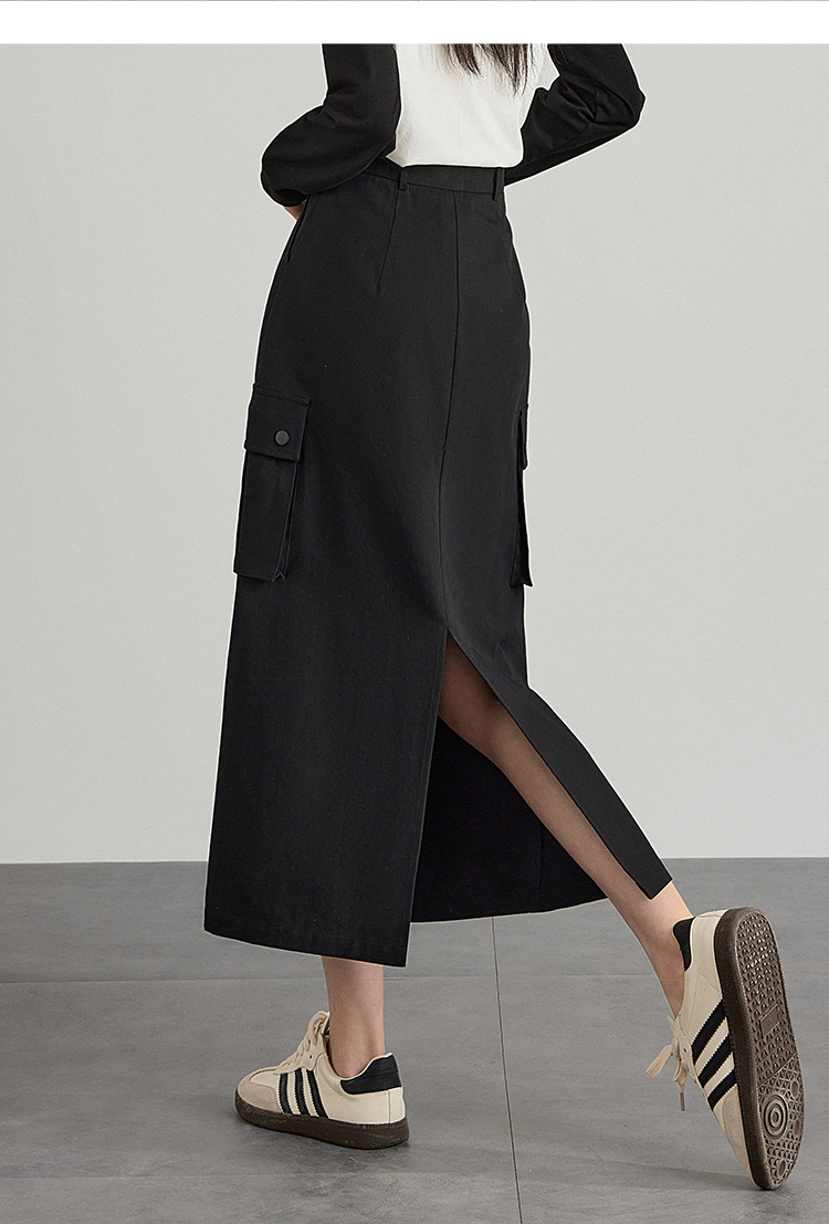 【专属特价】熙世界工装风半身裙2025早秋新款高腰黑色赫本风开叉直筒中长裙