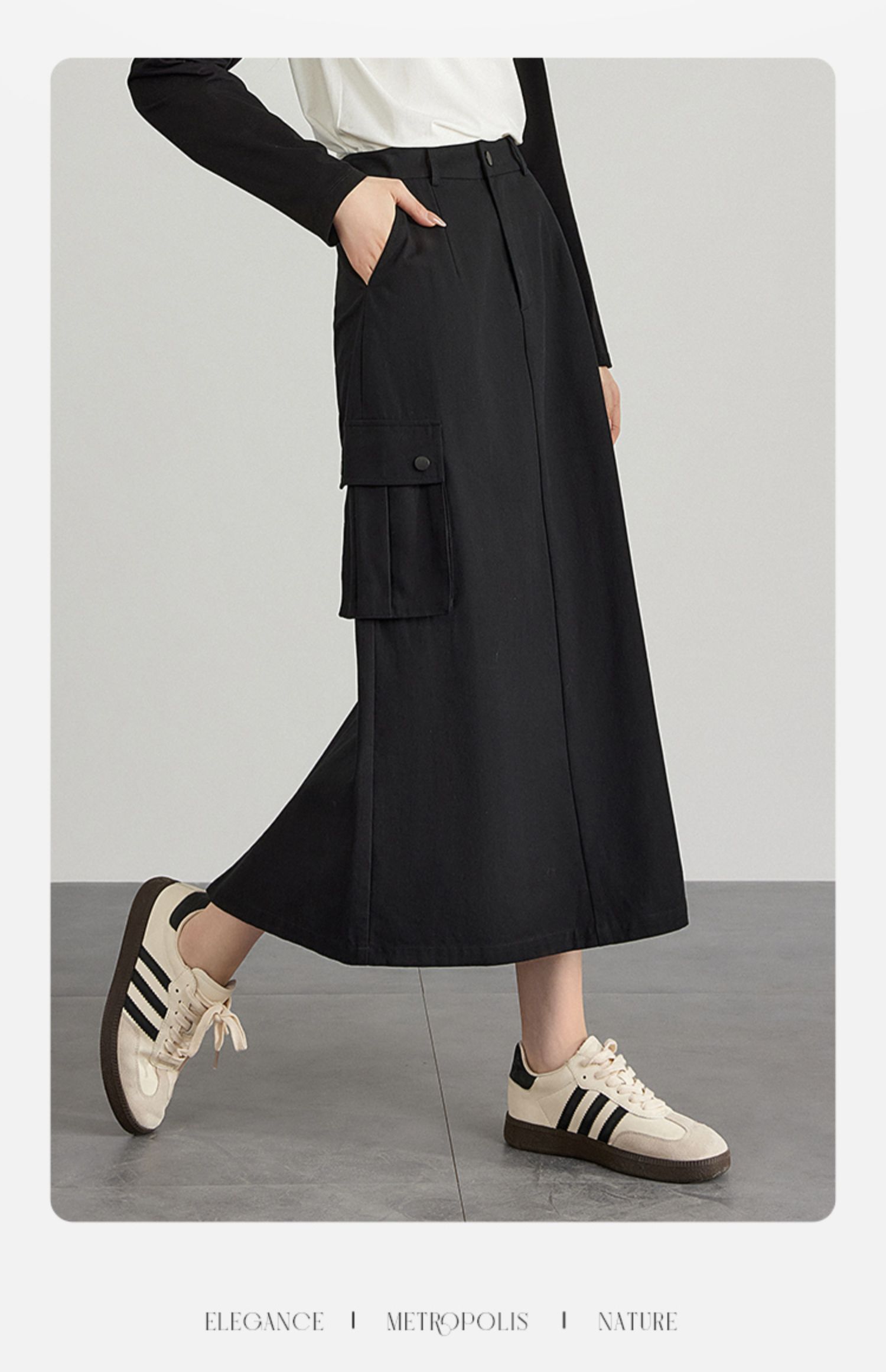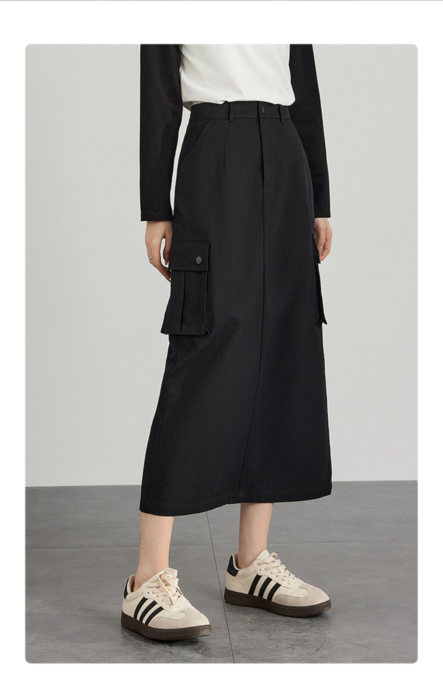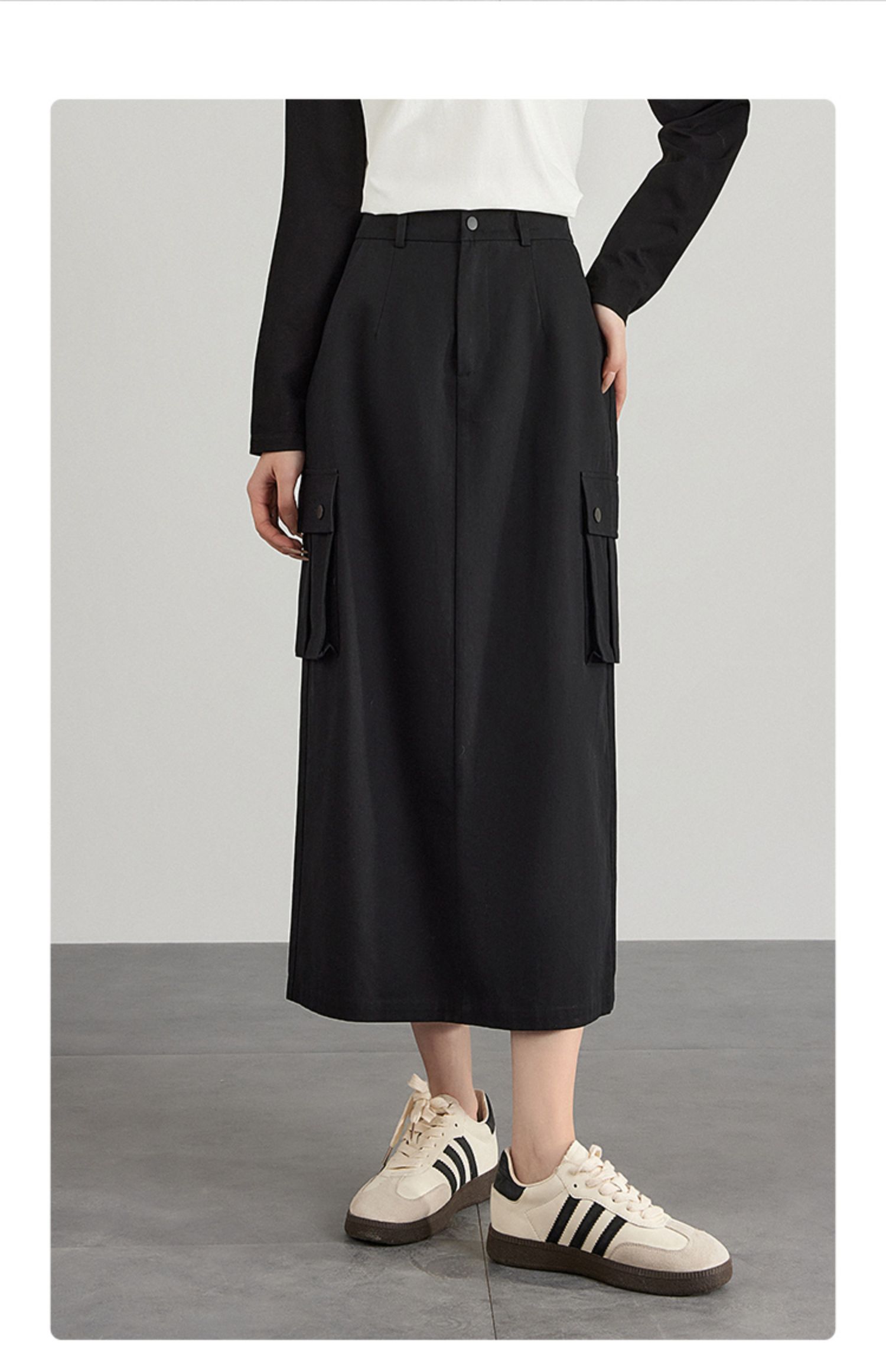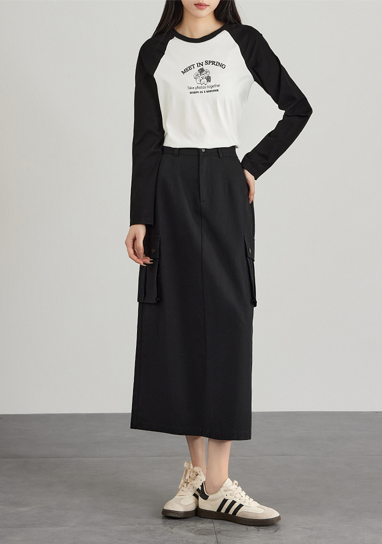 【专属特价】熙世界工装风半身裙2025早秋新款高腰黑色赫本风开叉直筒中长裙