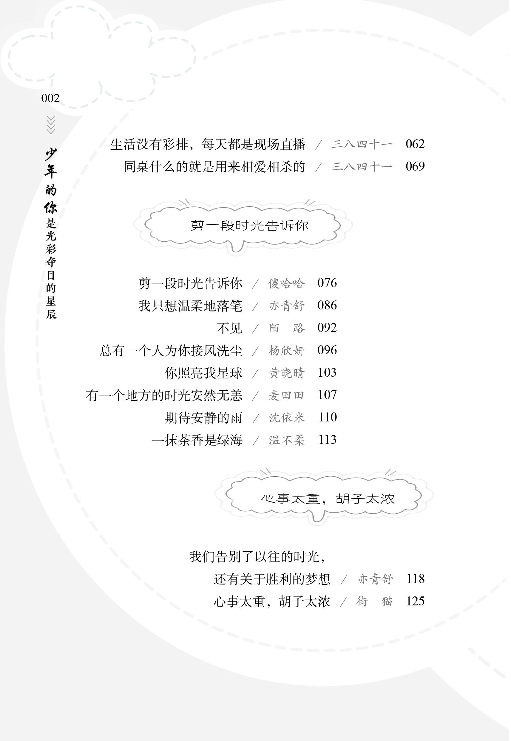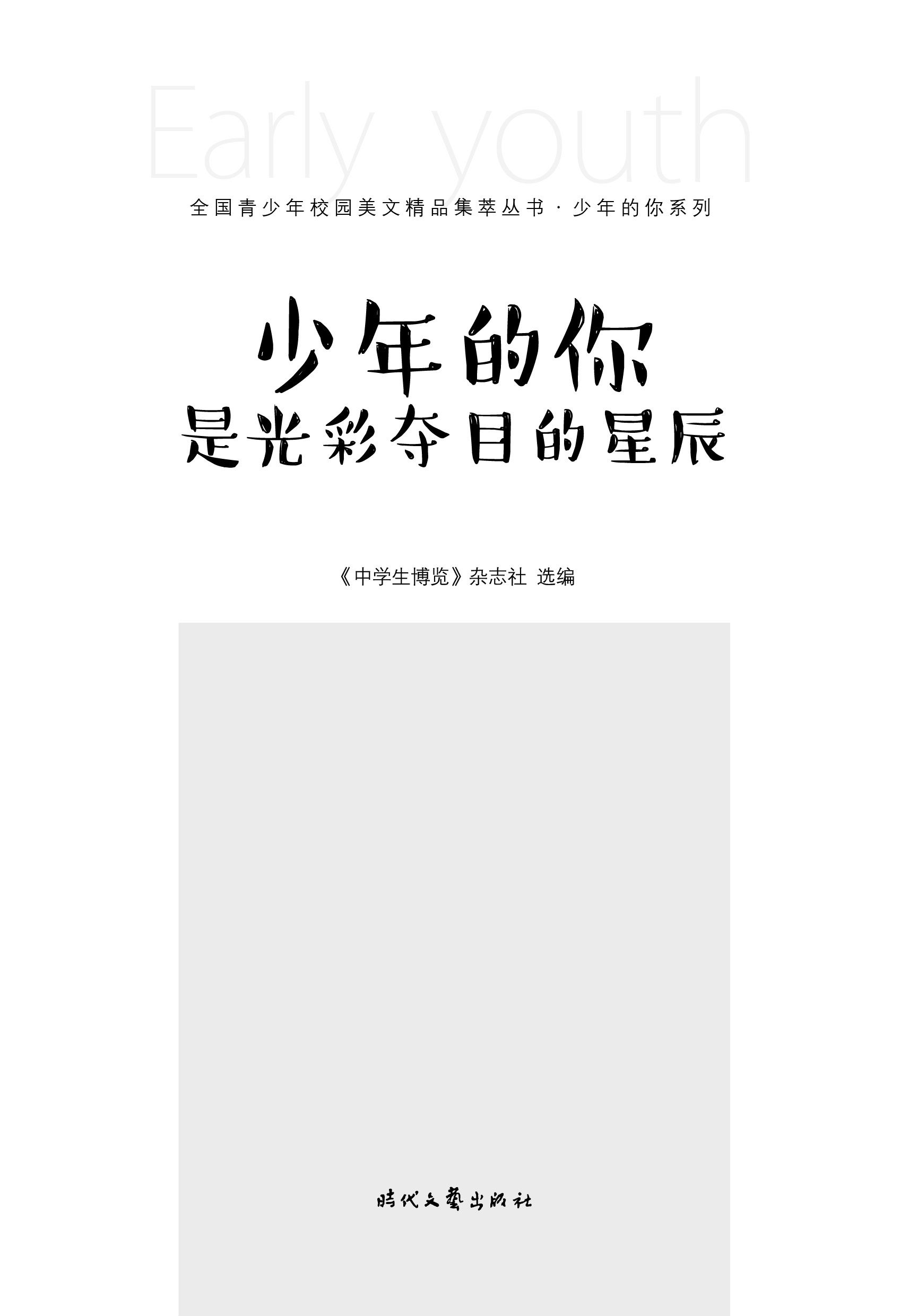 《少年的你是光彩夺目的星辰》是“全国中学生校园美文精品集萃丛书•少年的你系列”中的一册,丛书精选全国各地中学生原创美文作品精华,全方位展示了孩子们成长中的真思想、真性情。作者都是正经历着青春和梦想的在校学生,其中有活跃在《作文与考试》《中学生博览》等国内品牌期刊的校园青春写手;有的多次在全国中小学生作文大赛中获奖,凭此获得高校自主招生敲门砖。他们用富于诗意和激情的文字,抒写青春,描画梦想,讴歌时代,感悟成长;他们的生活、他们的思想、他们的情感,真正与校园读者心犀相通,很容易让读者产生共鸣。