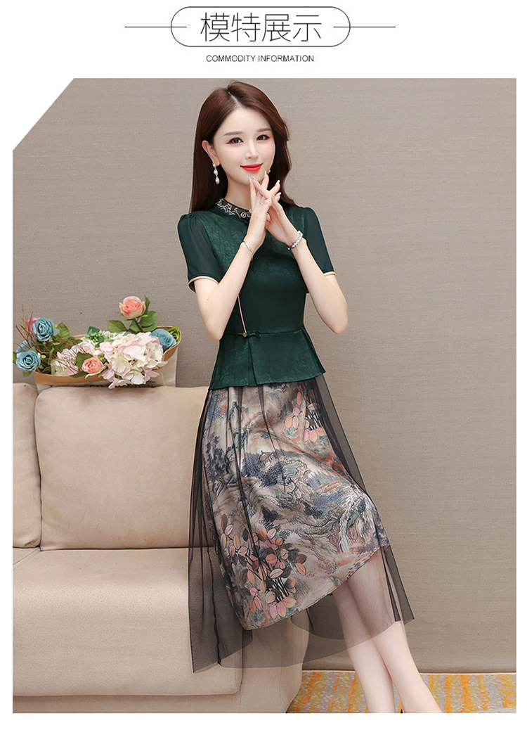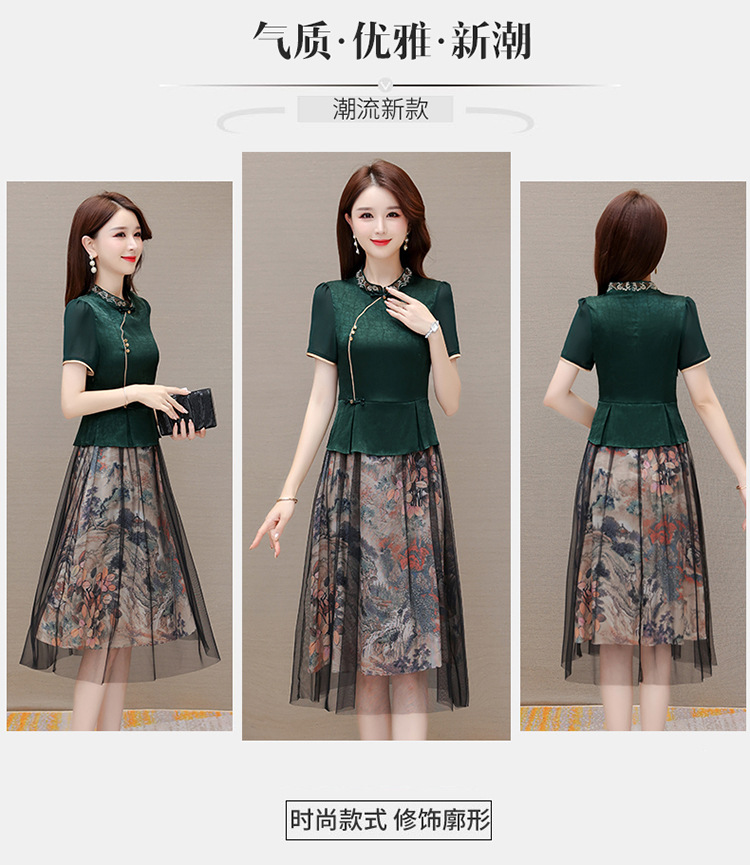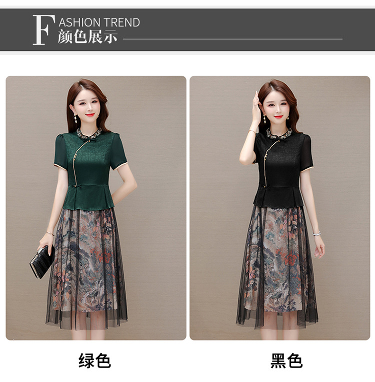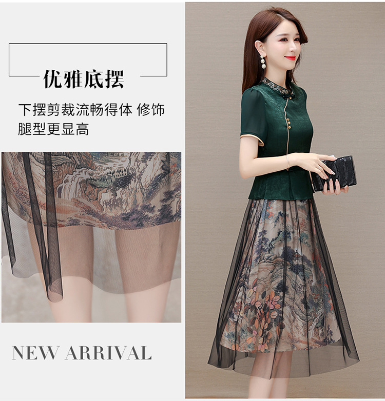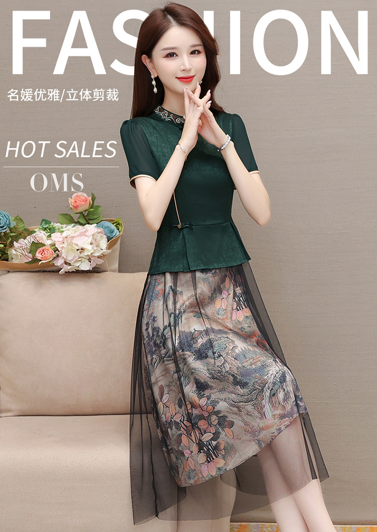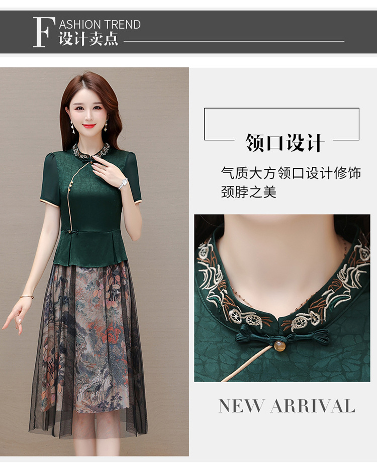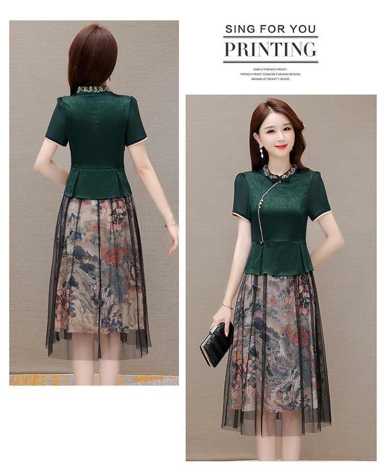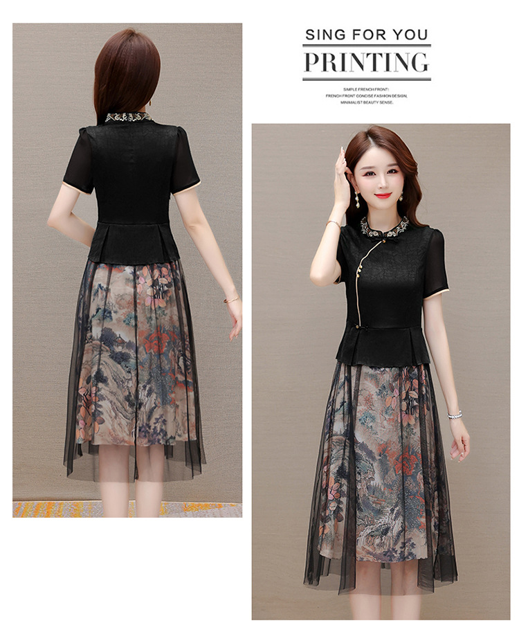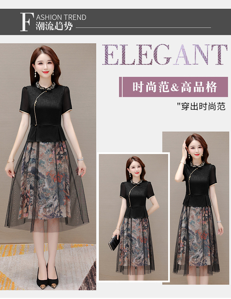 国风气质,夏款长款印花网纱拼接假两件时尚连衣裙短袖A字裙QYM-OMS-ZXA350-L