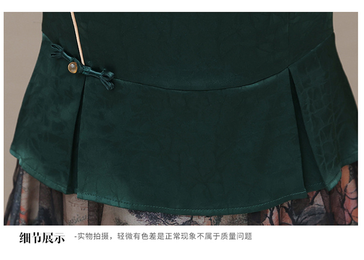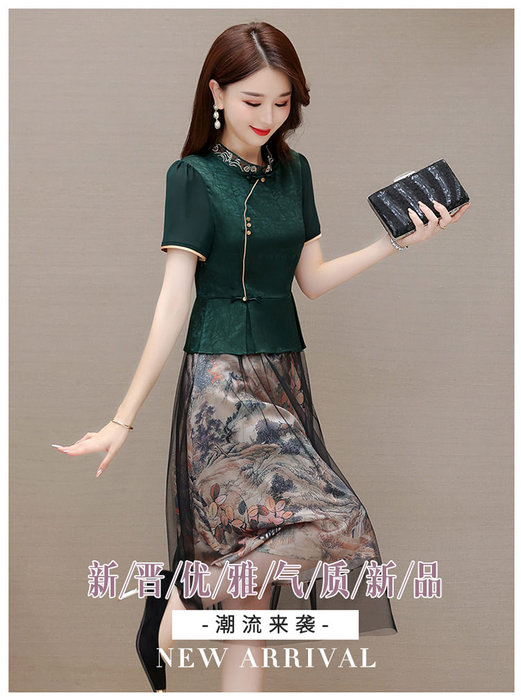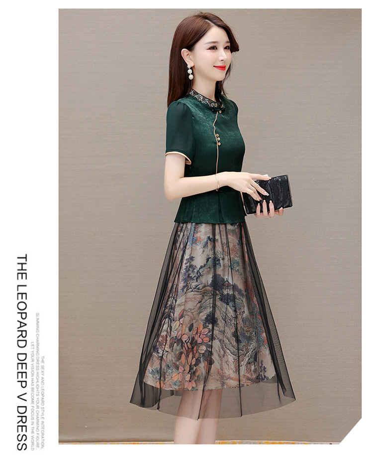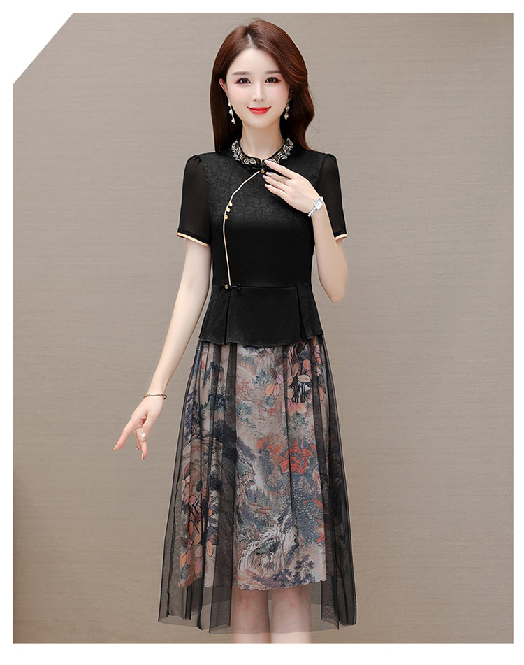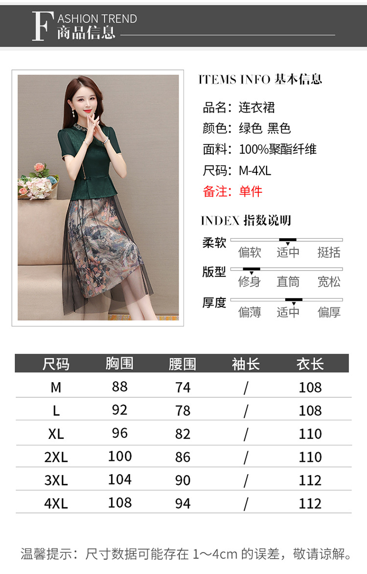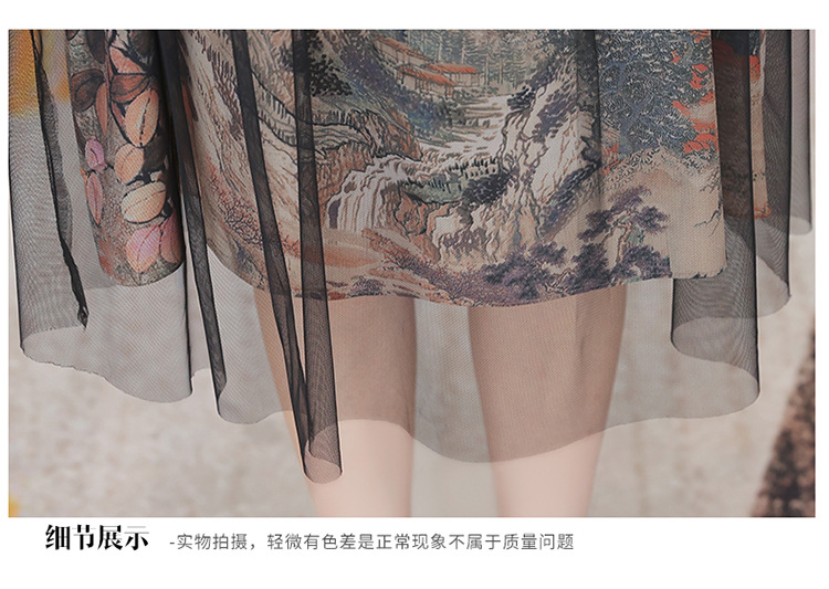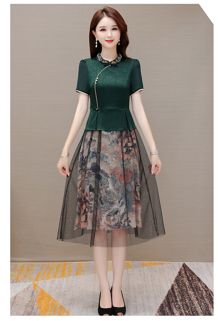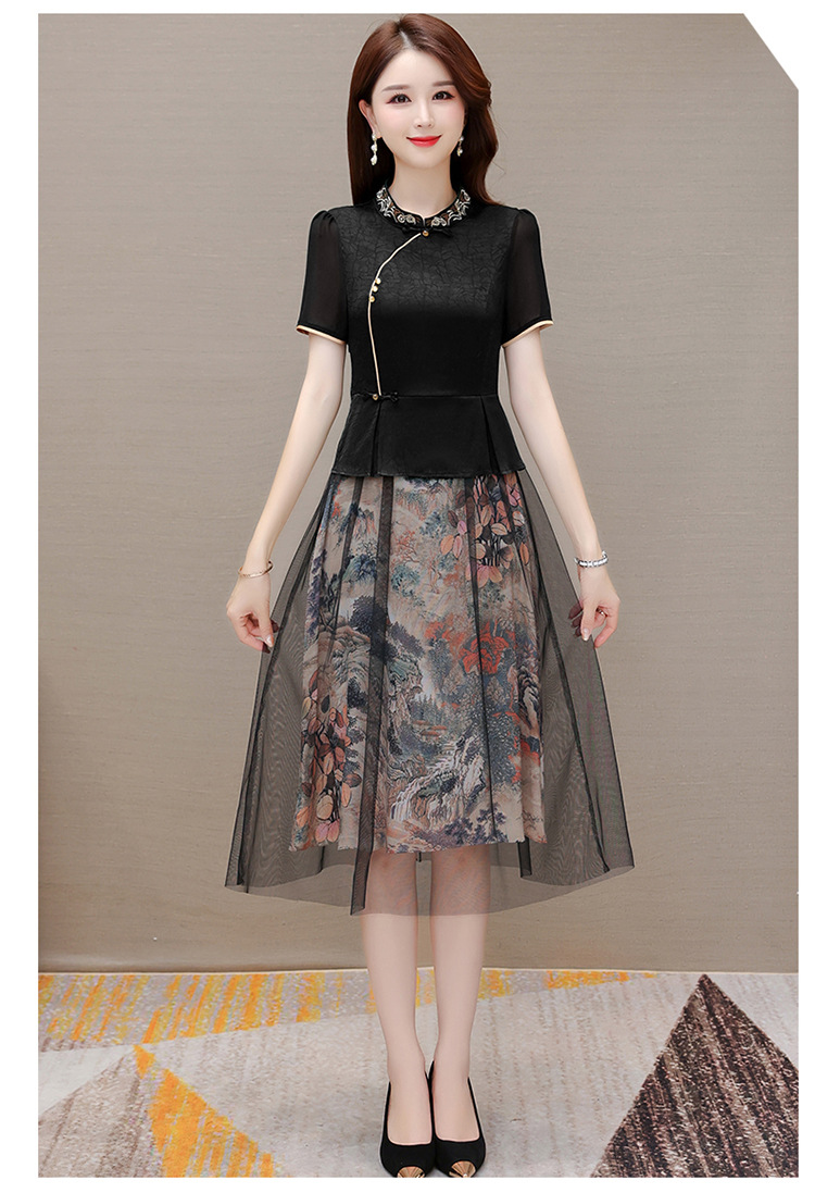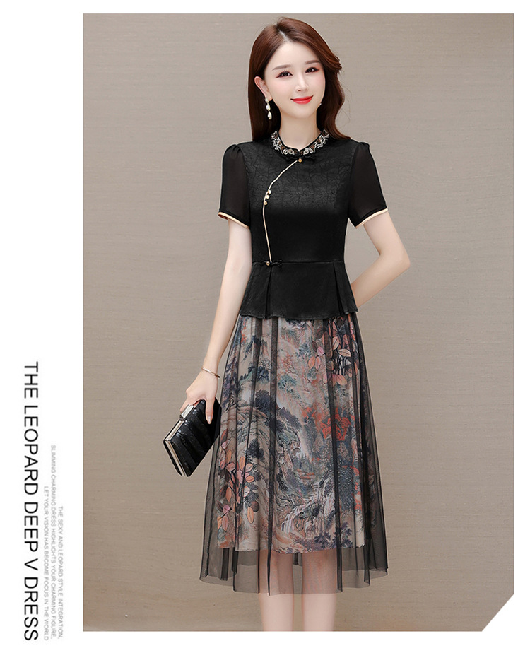 国风气质,夏款长款印花网纱拼接假两件时尚连衣裙短袖A字裙QYM-OMS-ZXA350-L
