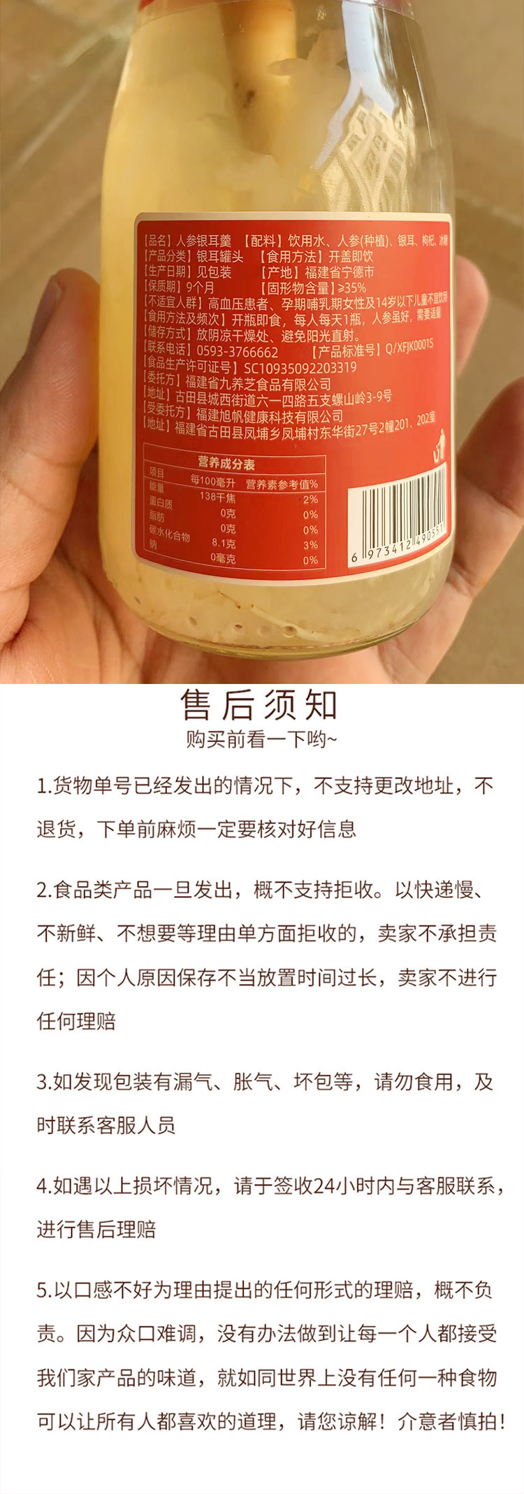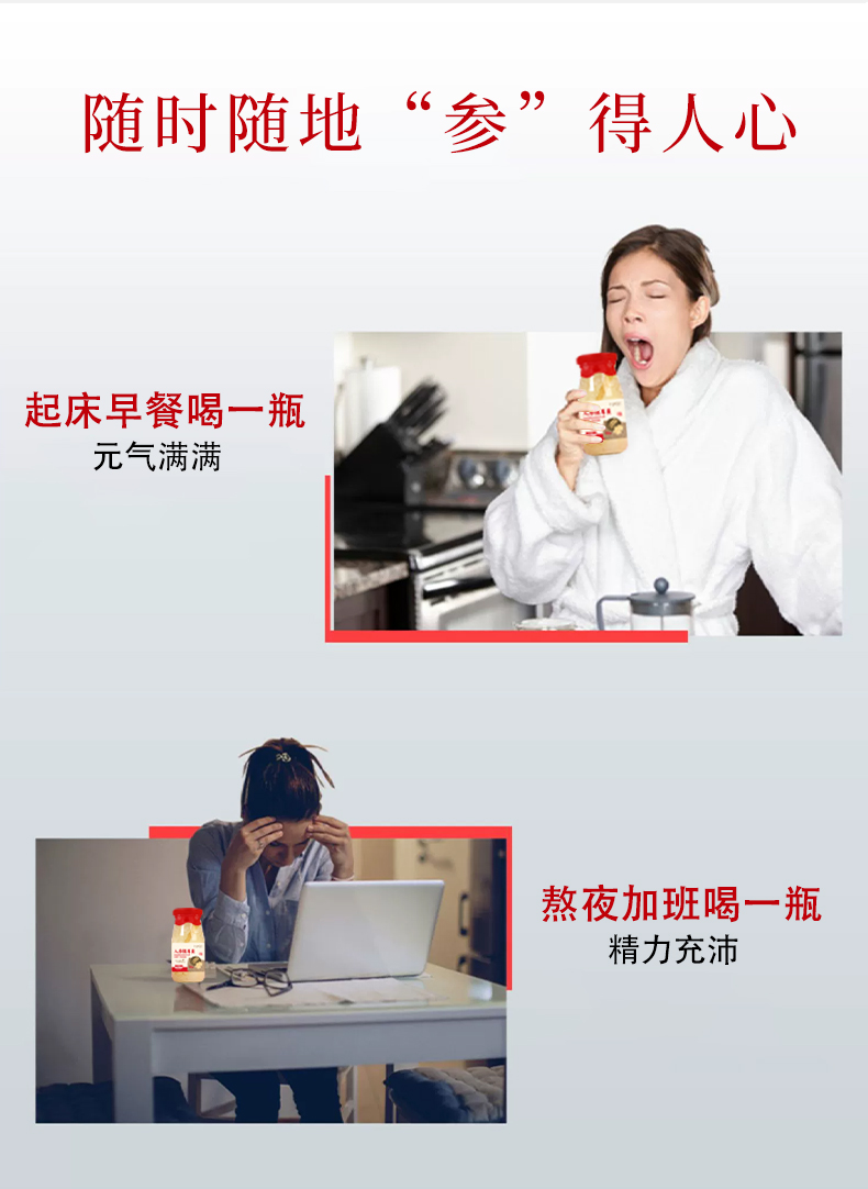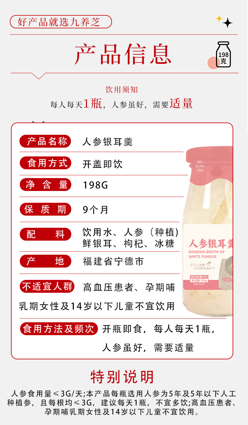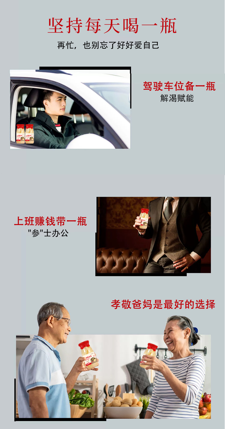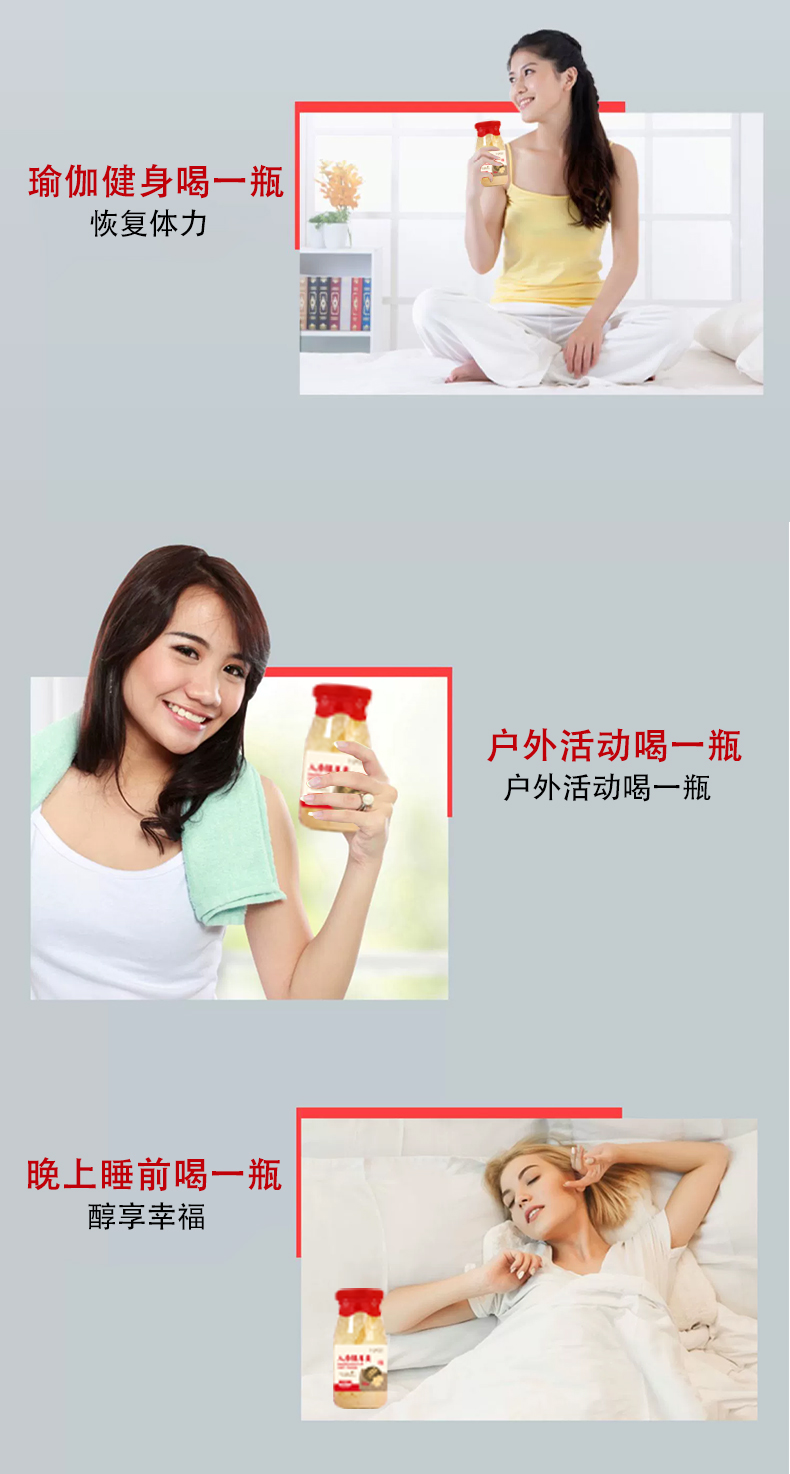 【注意事项】人参虽好,需要适量(高血压患者,孕期哺乳期女性,14岁以下儿童不宜使用) 运输途中偶尔会有破瓶 瓶盖凸起 漏气 发酸等情况,不建议食用