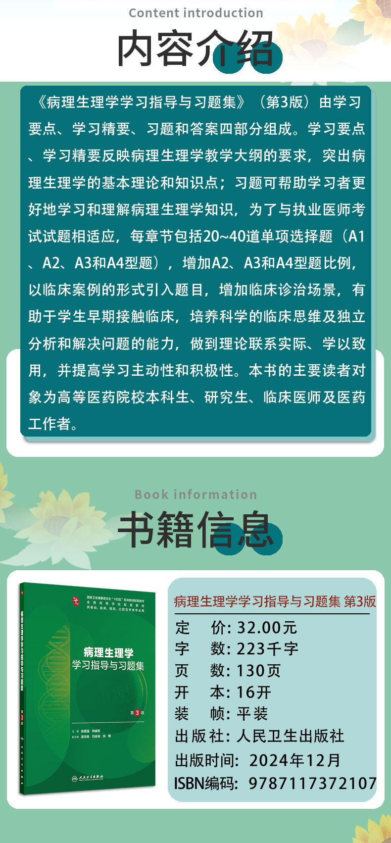 《病理生理学学习指导与习题集》(第3版)由学习要点、学习精要、习题和答案四部分组成。学习要点、学习精要反映病理生理学教学大纲的要求,突出病理生理学的基本理论和知识点;习题可帮助学习者更好地学习和理解病理生理学知识,为了与执业医师考试试题相适应,每章节包括20~40道单项选择题(A1、A2、A3和A4型题),增加A2、A3和A4型题比例,以临床案例的形式引入题目,增加临床诊治场景,有助于学生早期接触临床,培养科学的临床思维及独立分析和解决问题的能力,做到理论联系实际、学以致用,并提高学习主动性和积极性。本书的主要读者对象为高等医药院校本科生、研究生、临床医师及医药工作者。