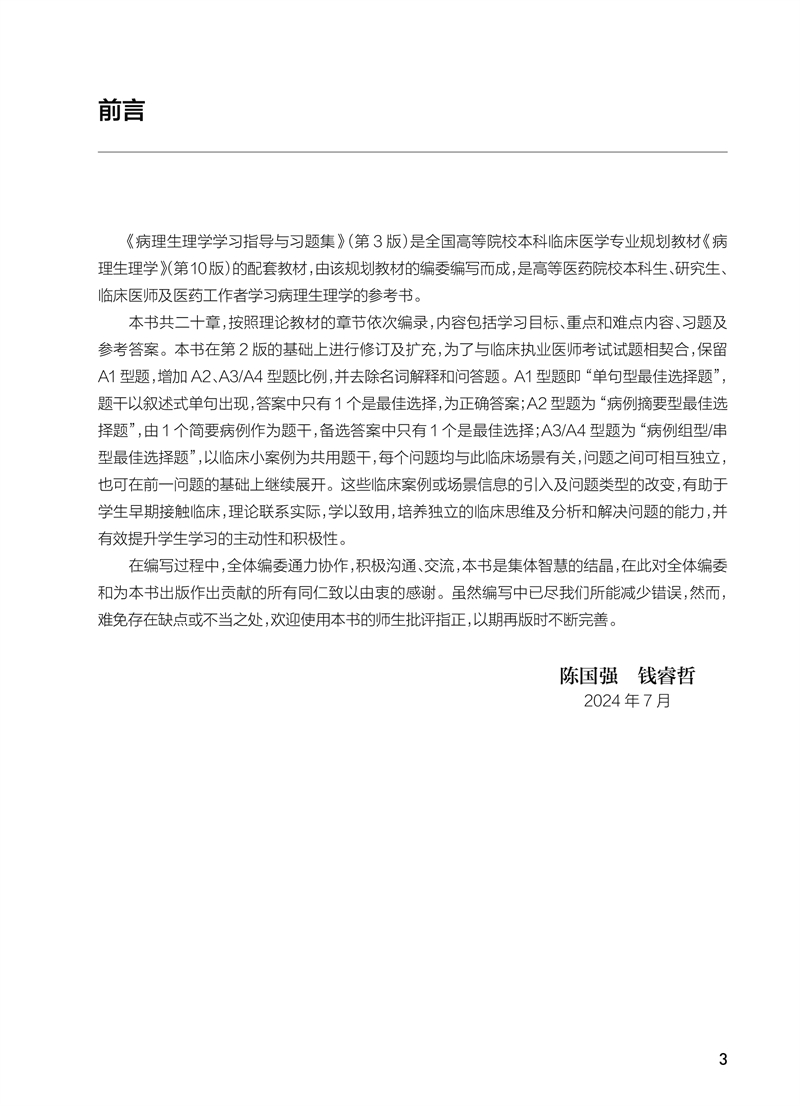 病理生理学学习指导与习题集 第3版十四五规划全国高等学校配套教材 陈国强 供基础临床预防口腔医学类专业用 人民卫生出版社