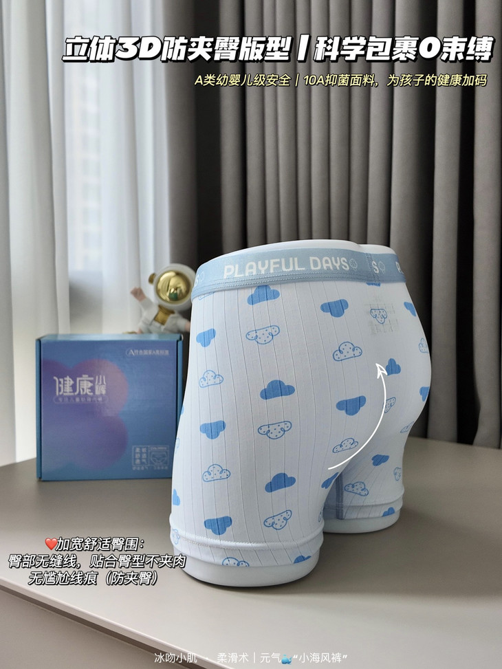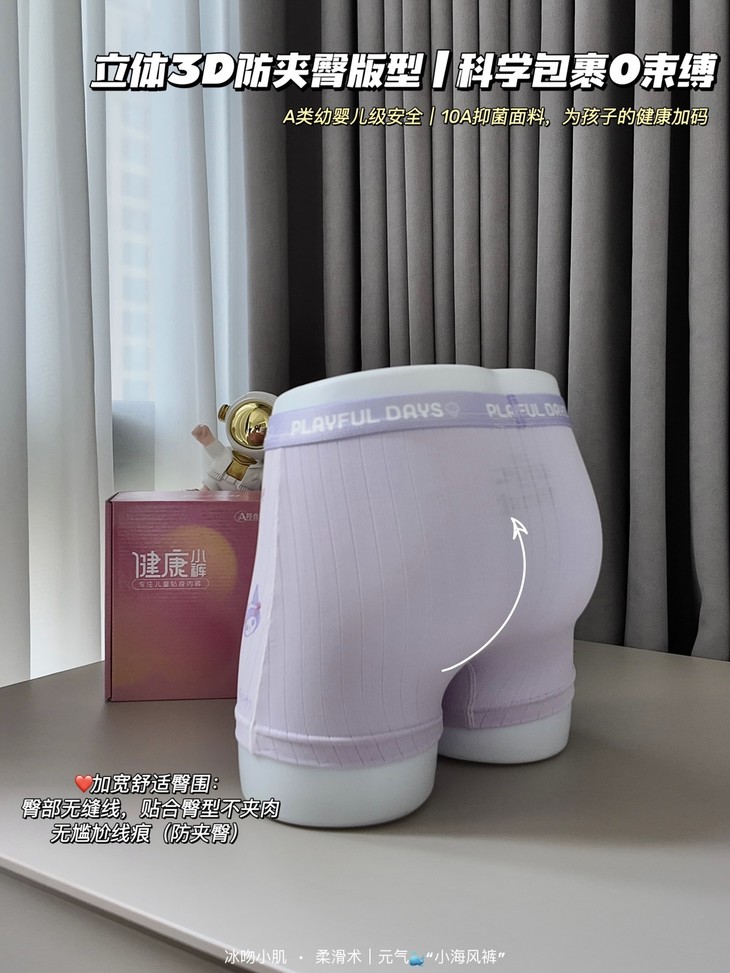 🎬3⃣️立体3D防夹臀版型 ▷ 臀围加宽包裹+高弹氨纶,拉伸率▶超1.5倍 ▷ 无骨缝制:360°零摩擦,娇嫩皮肤也不怕 ▷ 版型分区:男童U形太空舱/女童加宽裆 ▷ 跑🏃跳、蹲坐不卡裆,胖宝也0束缚