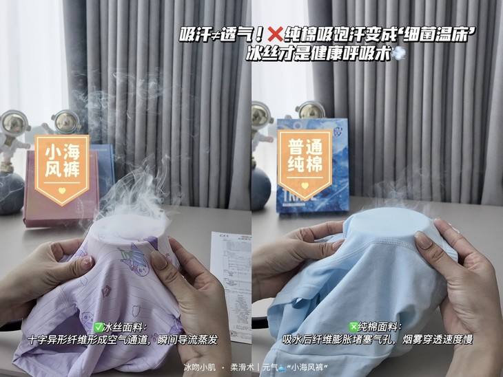 ❶透气实验:真·会呼吸的内裤! ✅纯棉单孔结构(10秒才隐约看到烟雾)<4向立体微孔(烟雾3秒穿透面料) 形成“空气❄️高速公路” ,汗液接触💨瞬间滚落,不堵塞透气孔道!
