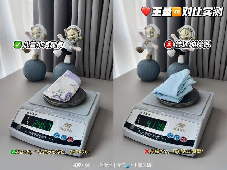 ❸⚖️轻量革命实验测试:轻,是看得见的呵护 - 小海风裤:25g(约4片羽毛重 🕊️) - 普通纯棉裤:42g(≈7颗玻璃珠 🔵)