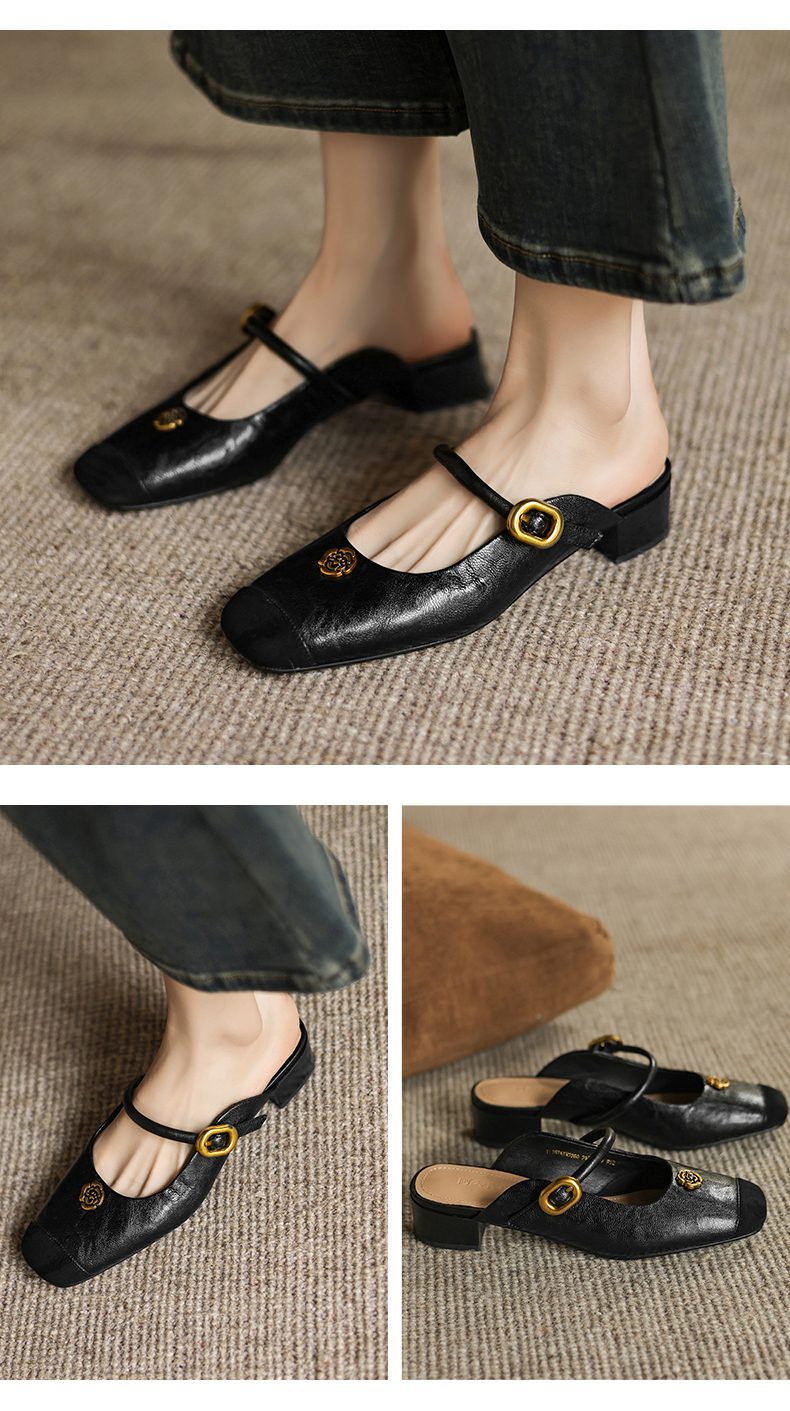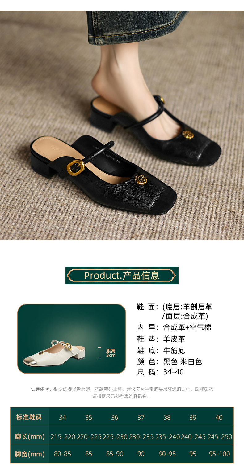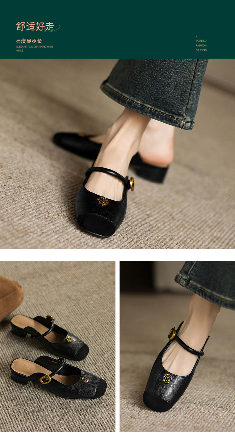 阿么手工女鞋真皮山茶花仙女风半拖鞋外穿2025新款粗跟穆勒鞋3CM