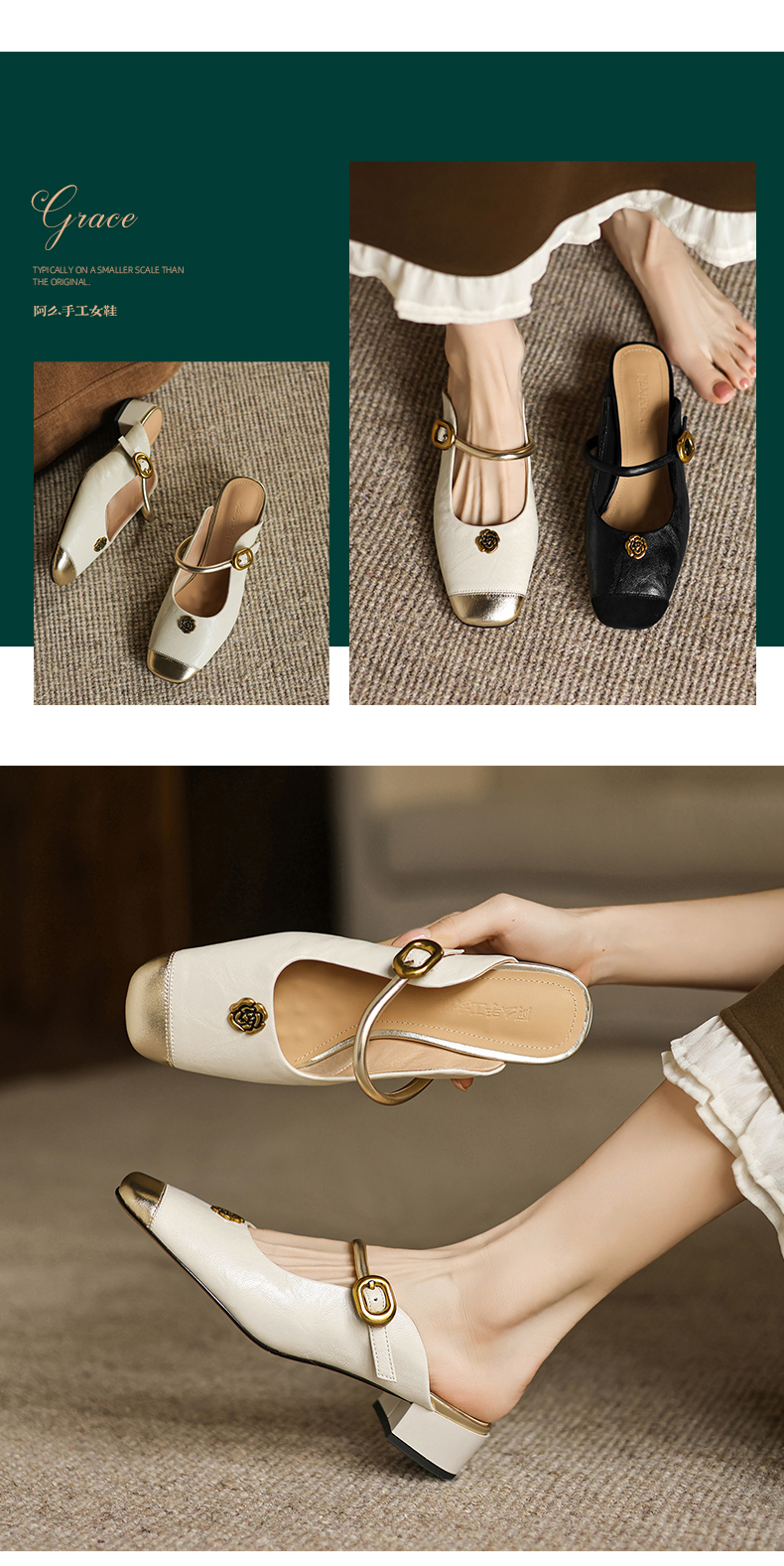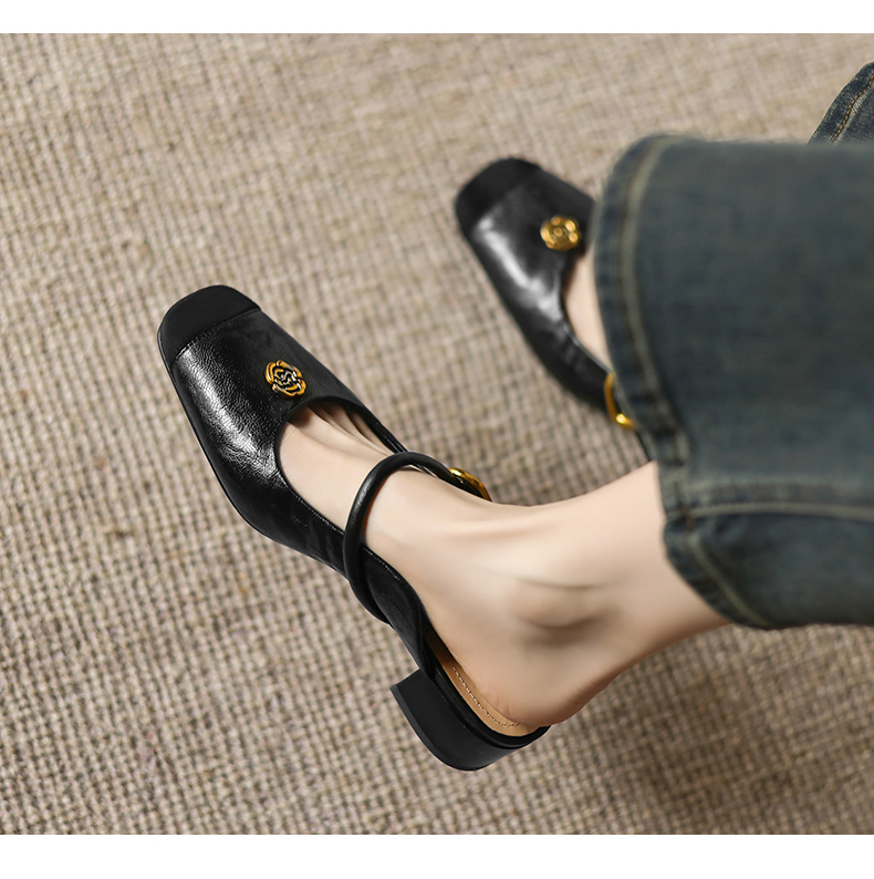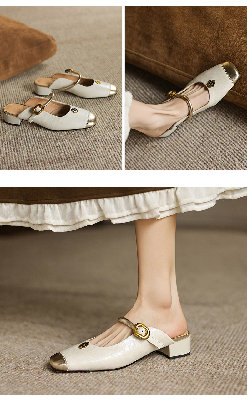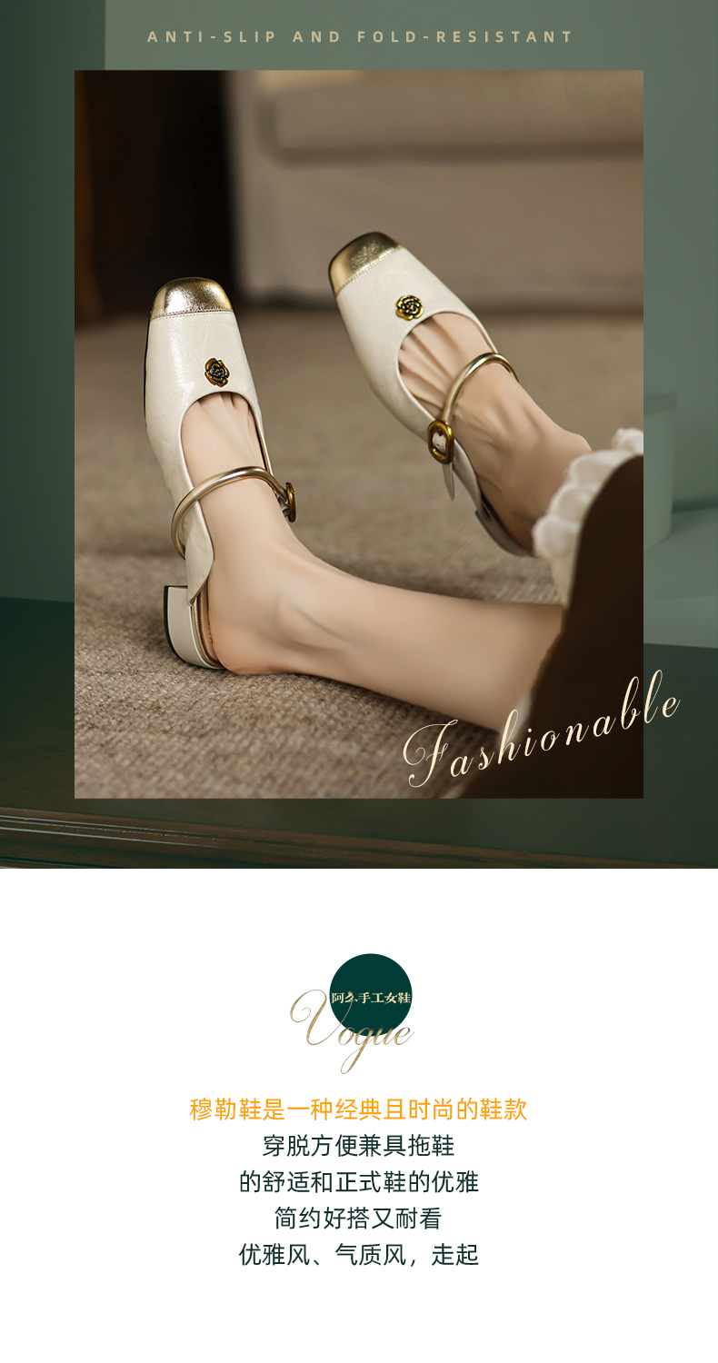 阿么手工女鞋真皮山茶花仙女风半拖鞋外穿2025新款粗跟穆勒鞋3CM